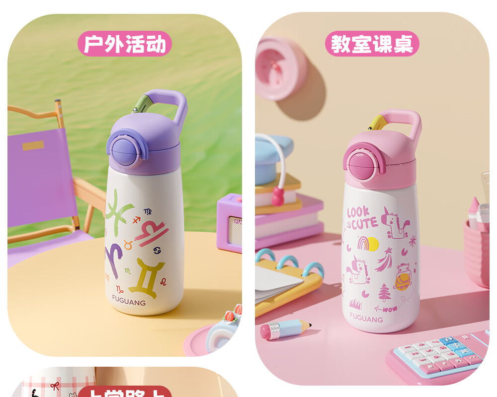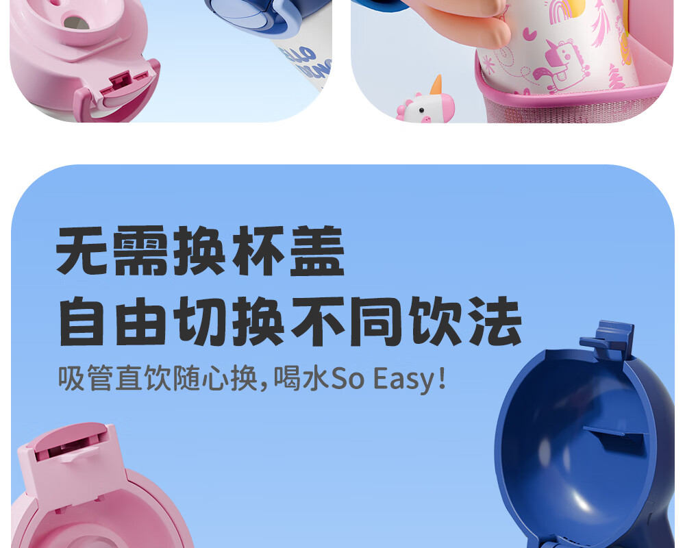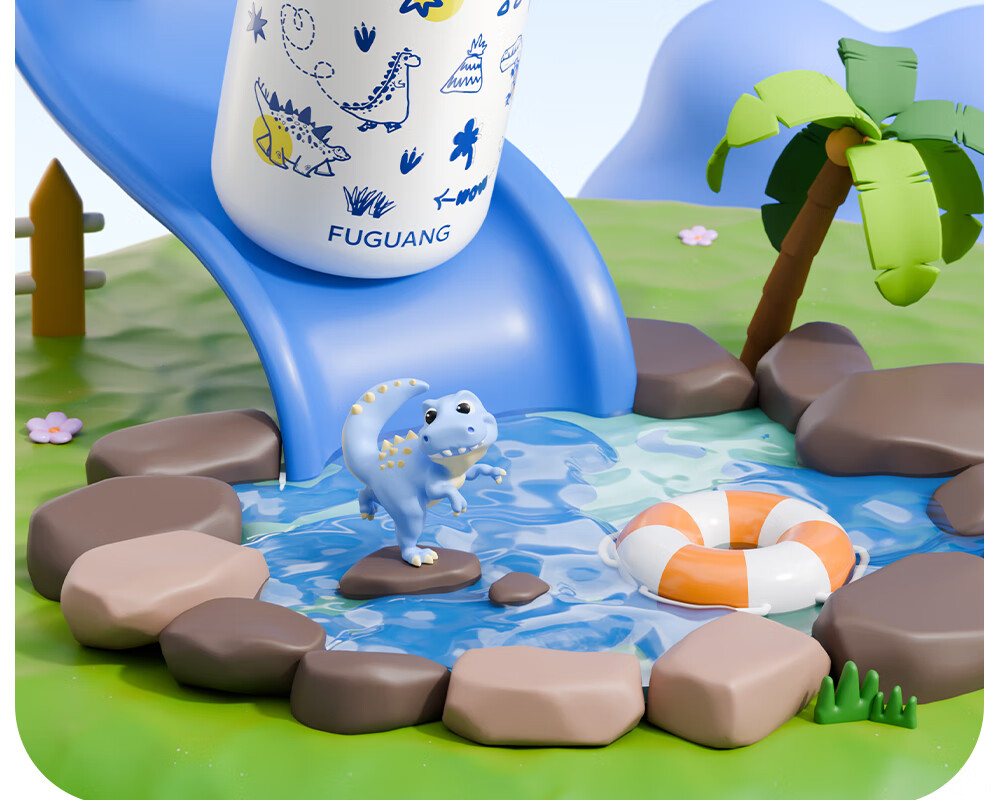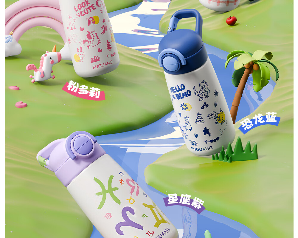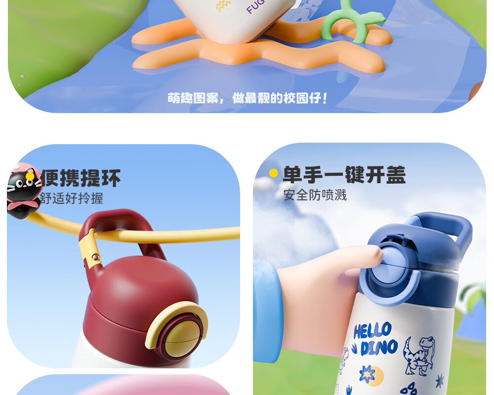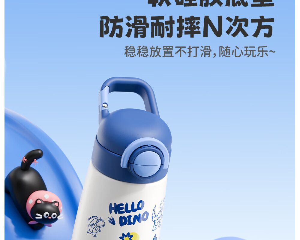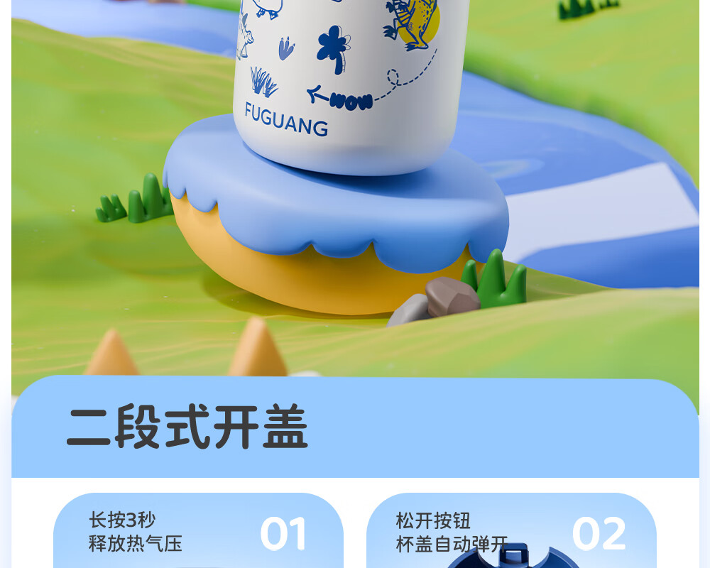 富光儿童随行保温杯男女学生新款双饮口水杯上学专用水壶吸管便携杯子 恐龙蓝500ml【一盖双饮】
