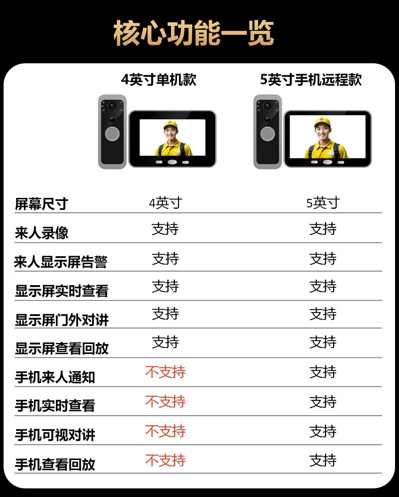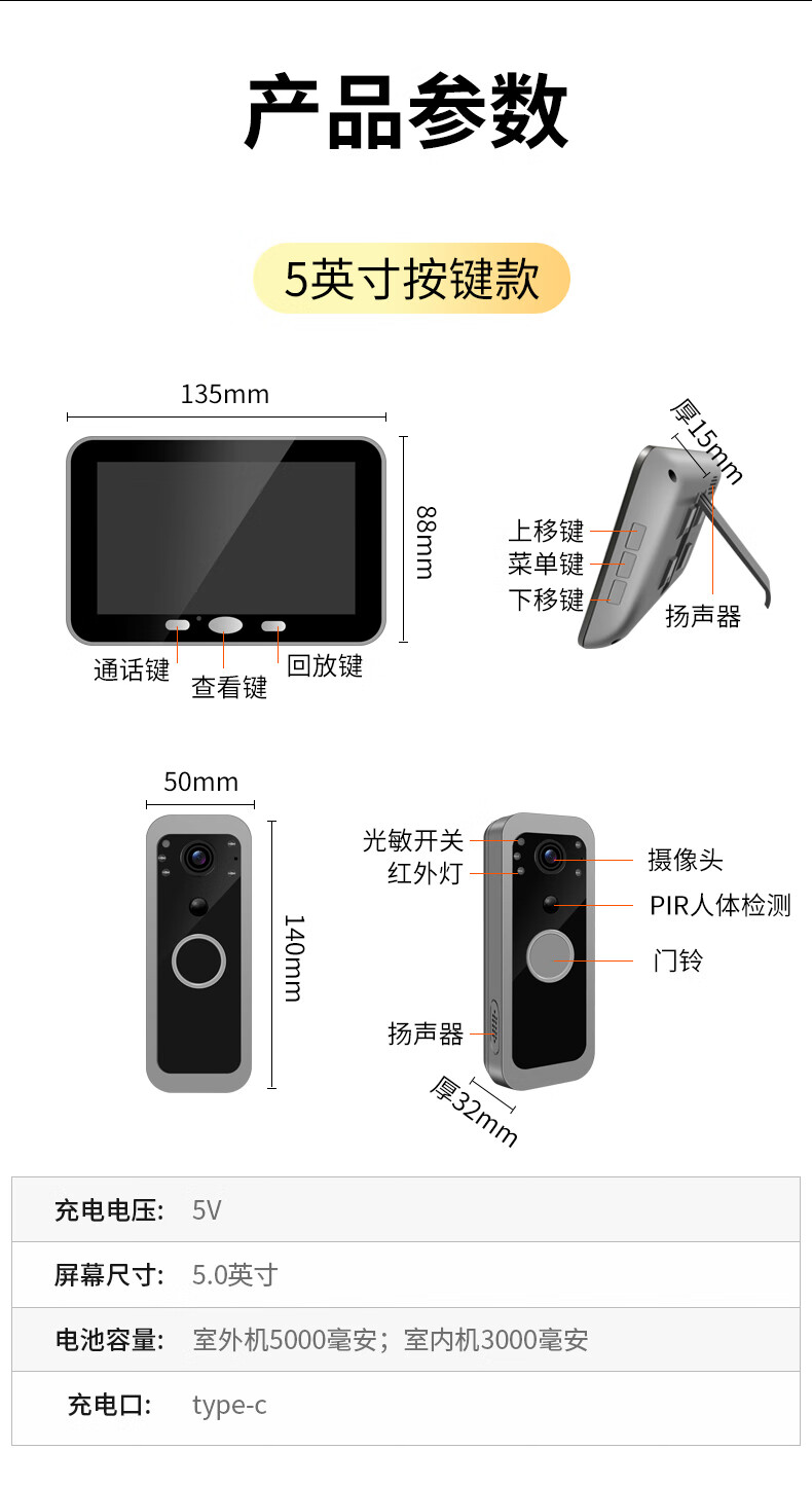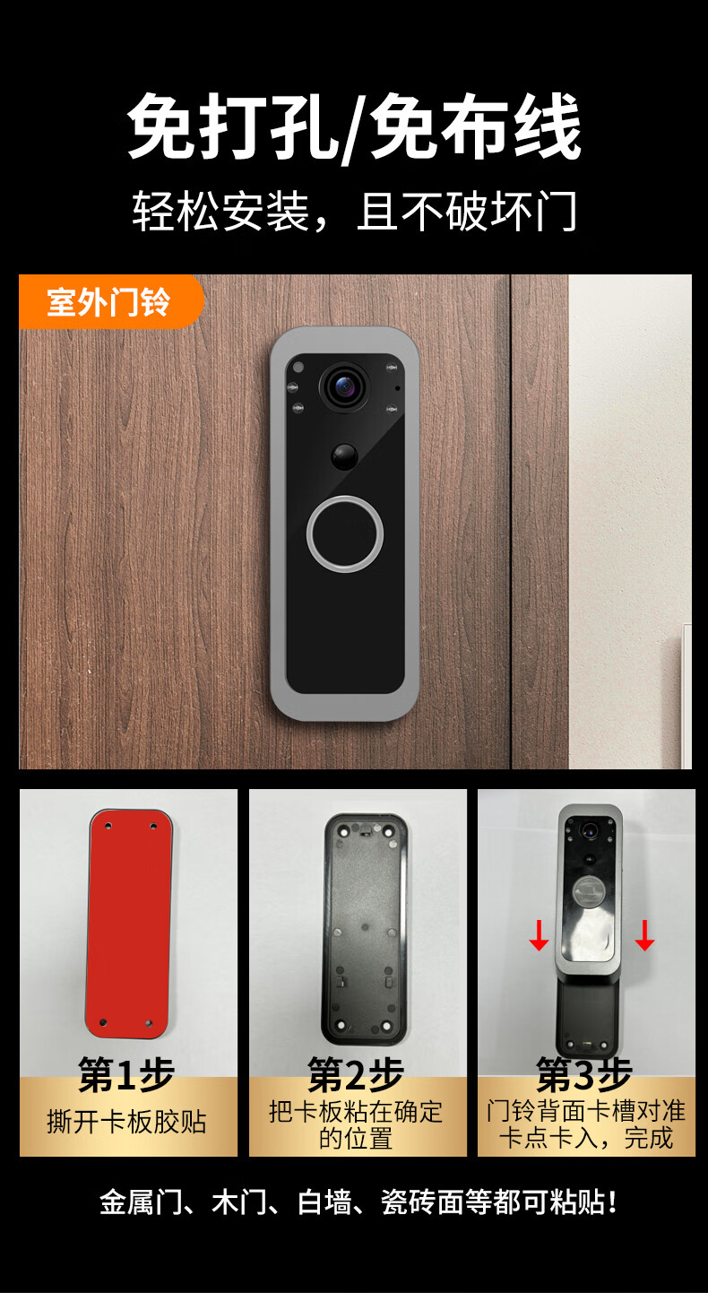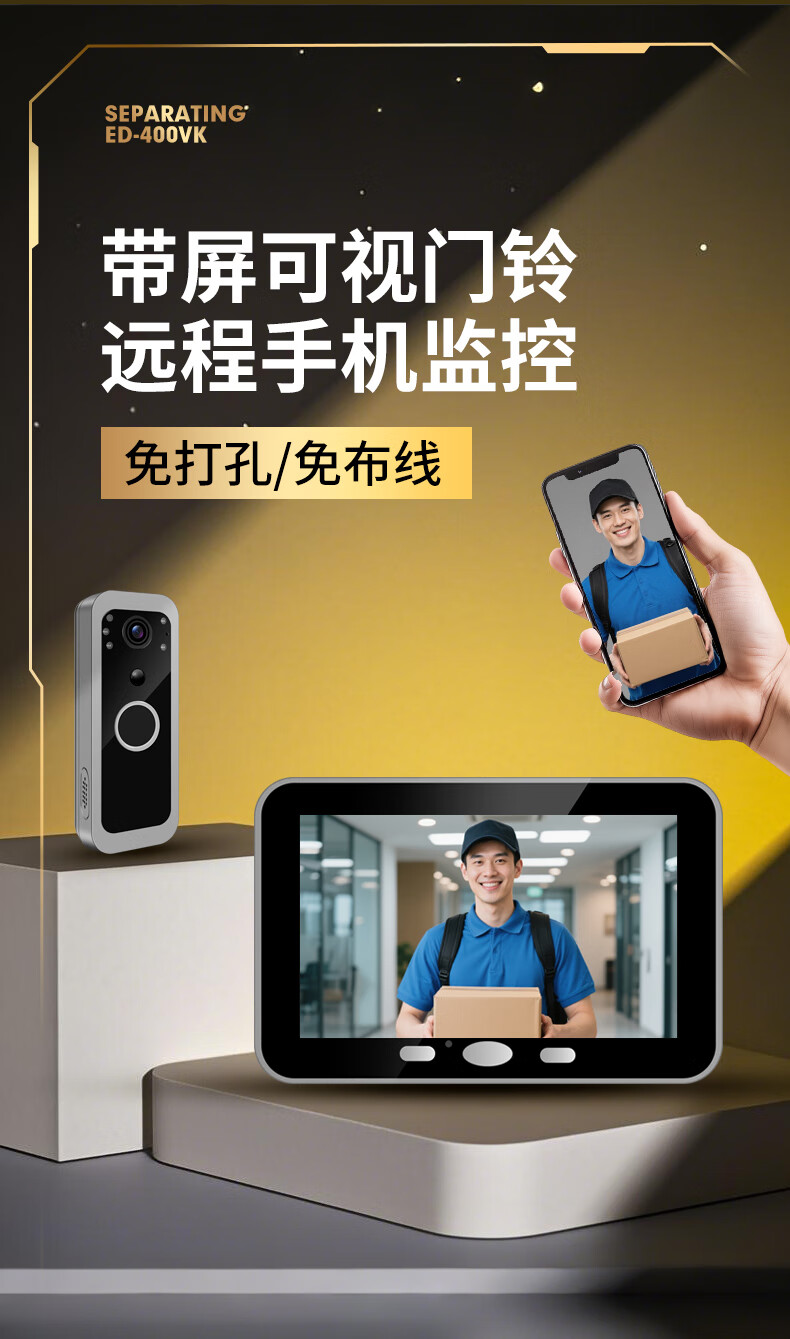 佳博盾可视门铃摄像头带显示屏报警免打孔手机远程监控对讲无线入户门猫眼带屏幕录像防盗器家用免插电 5英寸手机远程款(支持联网) 无内存(无法录像)