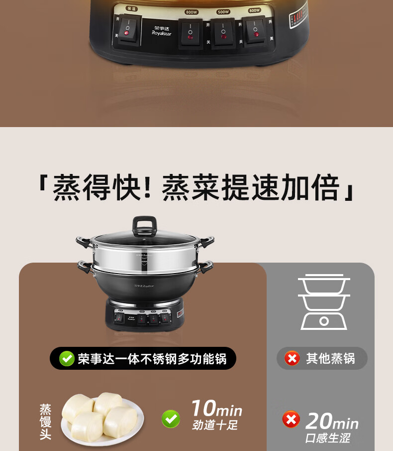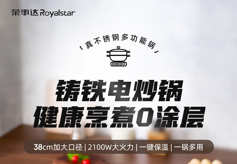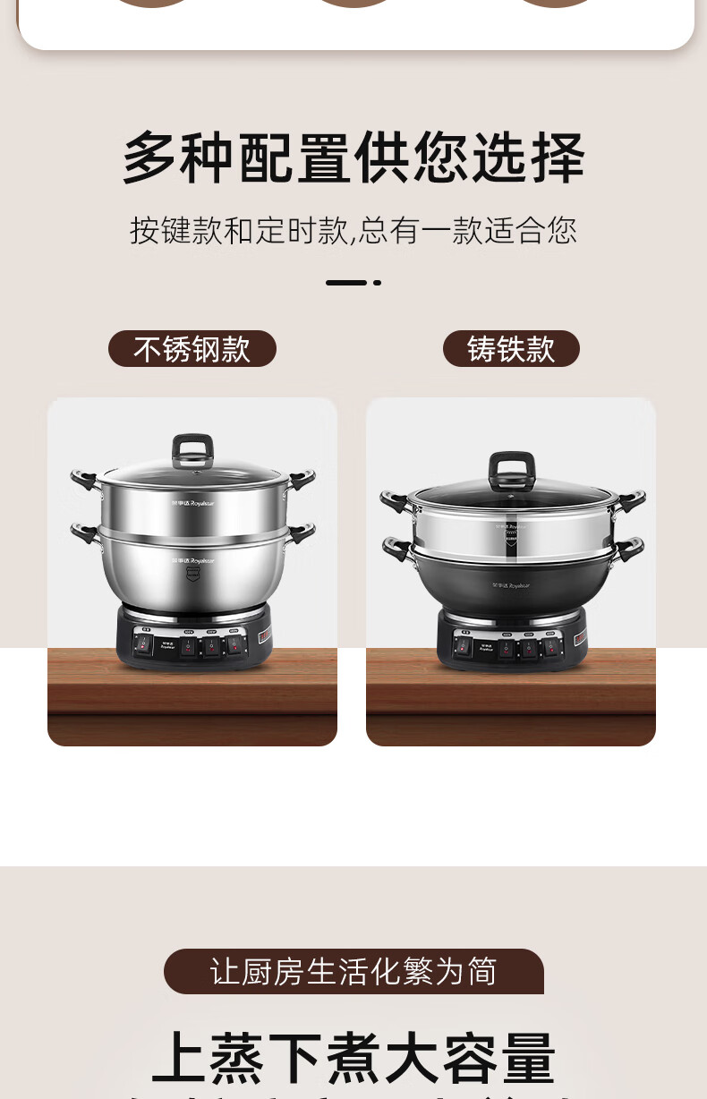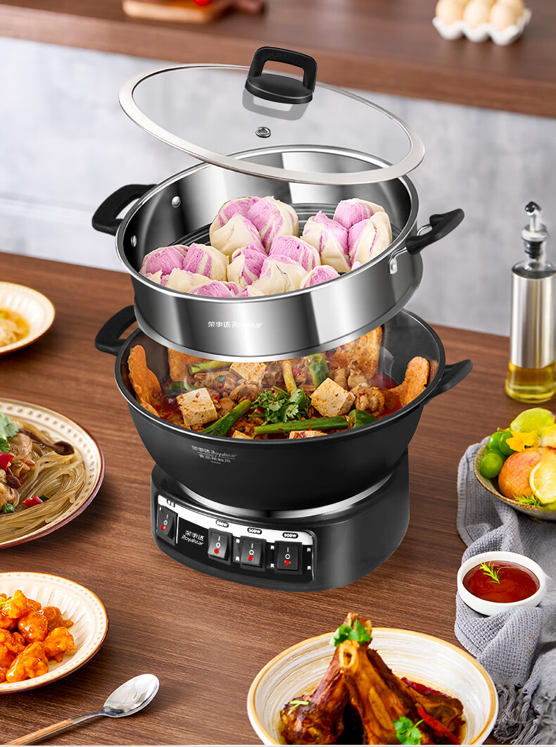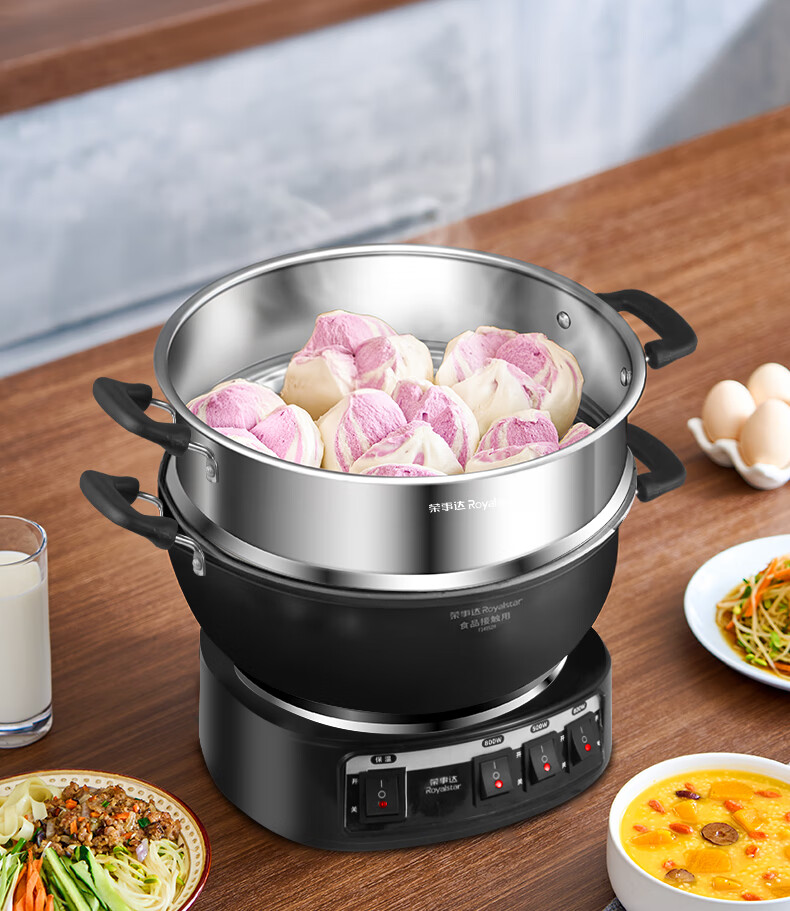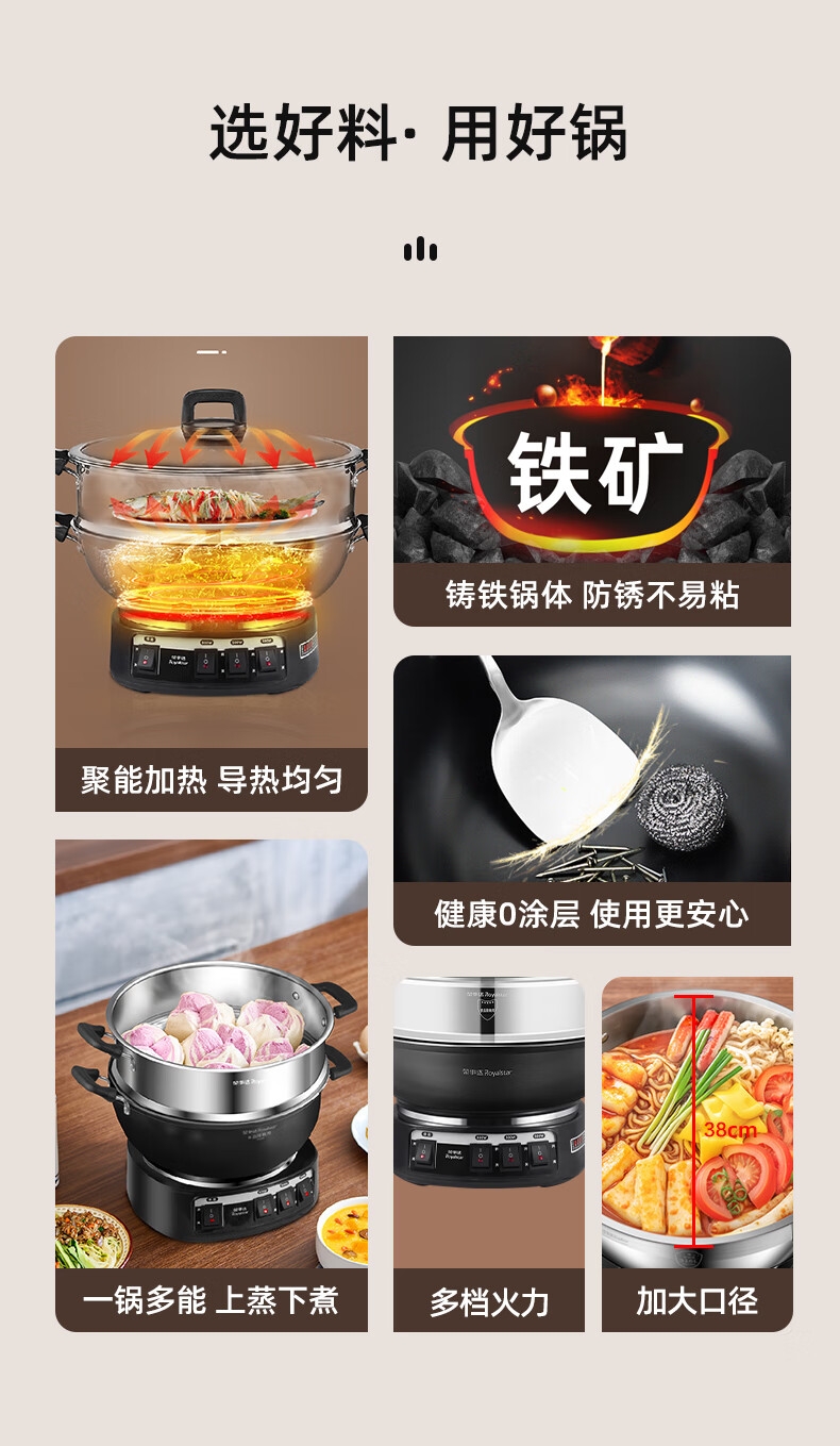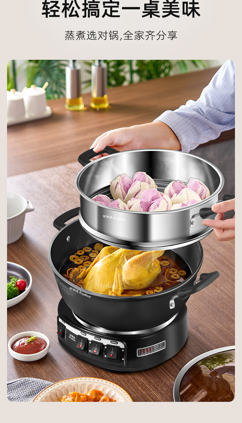 荣事达(Royalstar)电炒锅电蒸锅电煮锅山东锅家用铸铁炖蒸煮不粘锅一体多功能蒸笼蒸包子RS-FT38带蒸笼家电