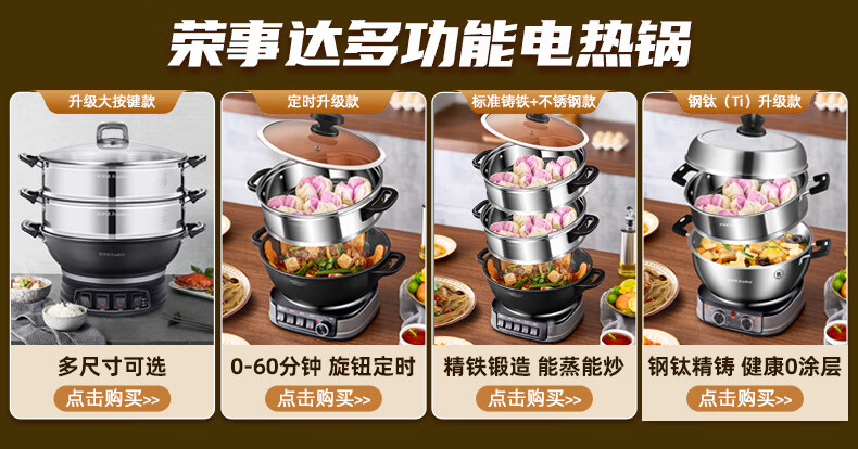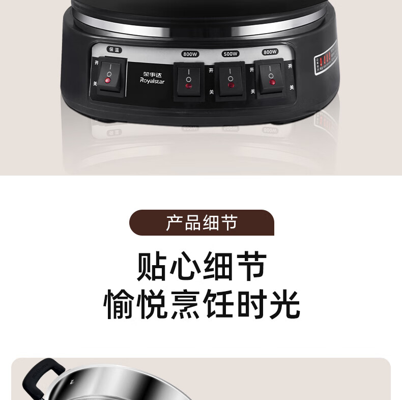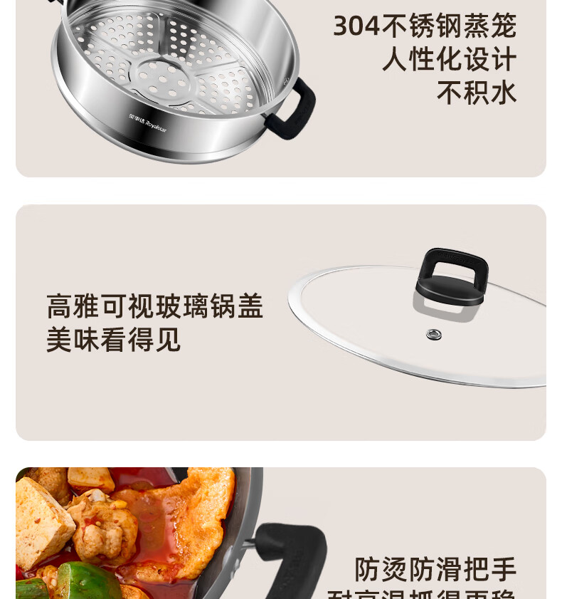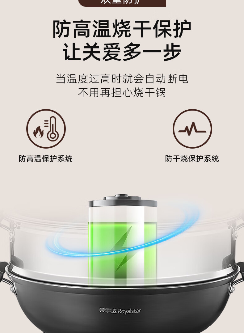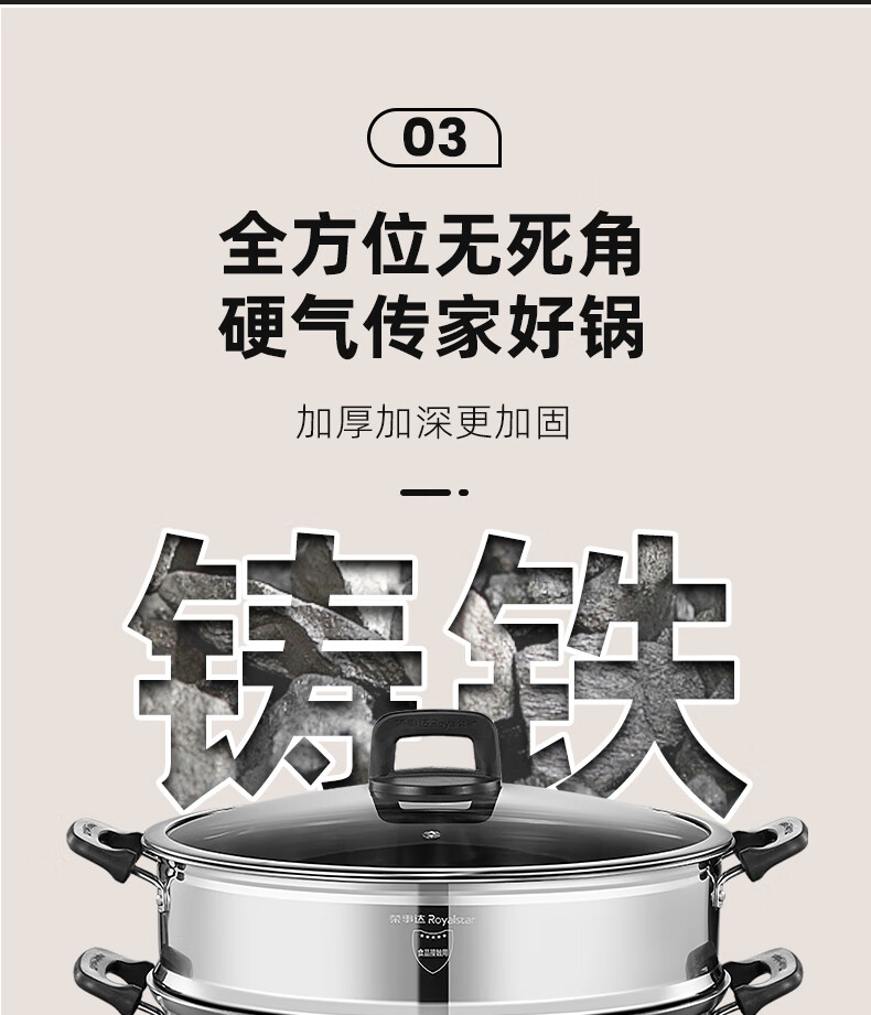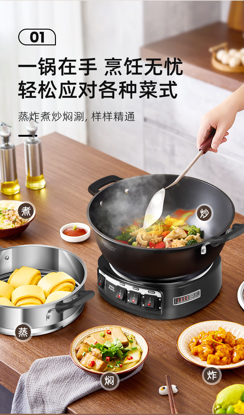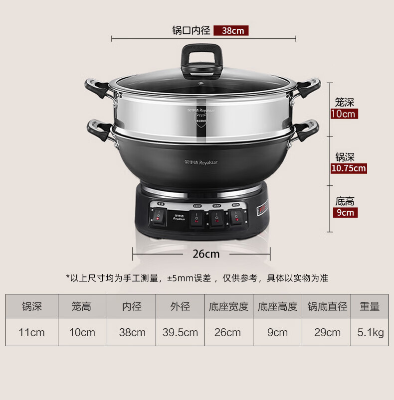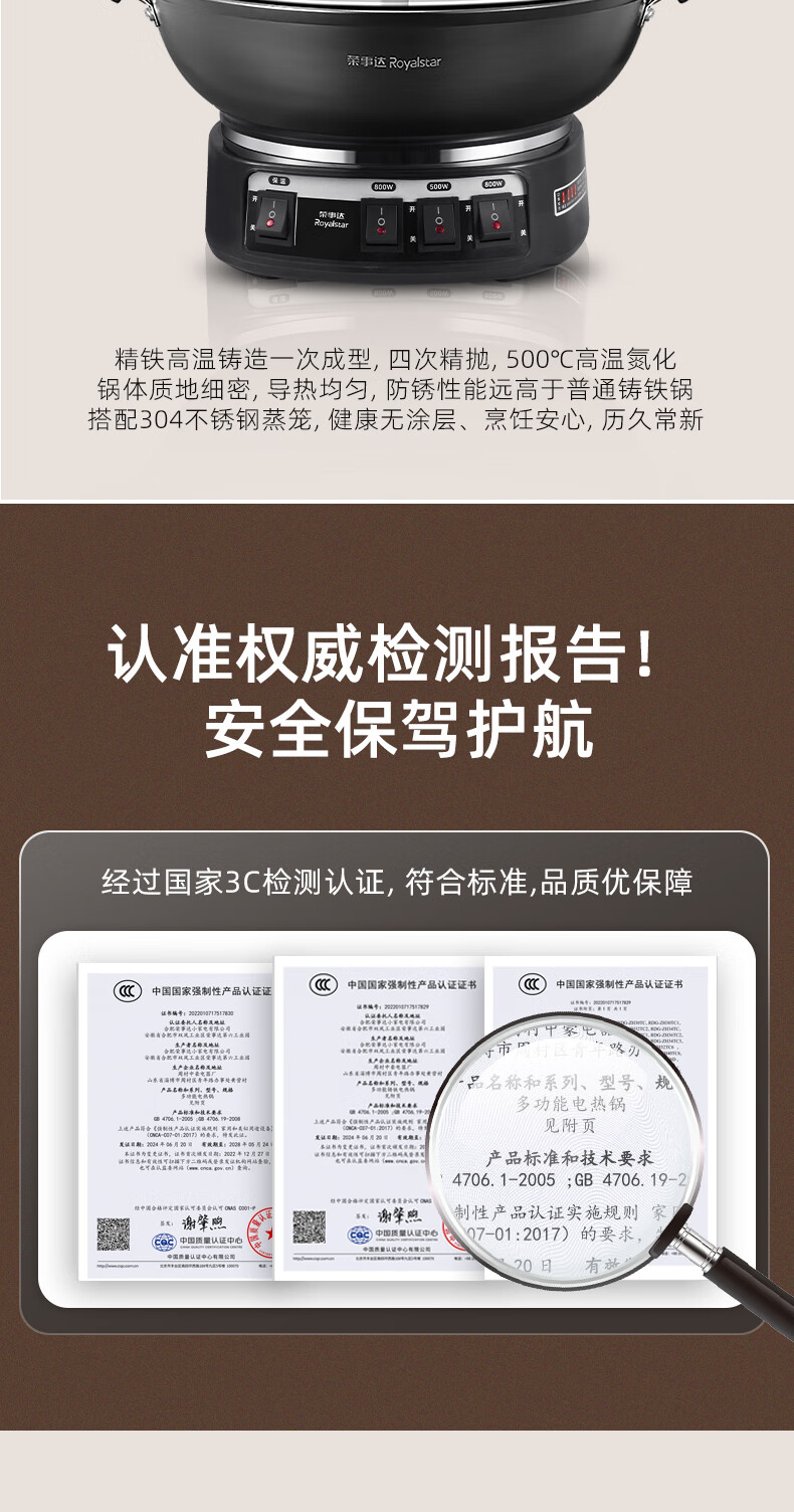 荣事达(Royalstar)电炒锅电蒸锅电煮锅山东锅家用铸铁炖蒸煮不粘锅一体多功能蒸笼蒸包子RS-FT38带蒸笼家电