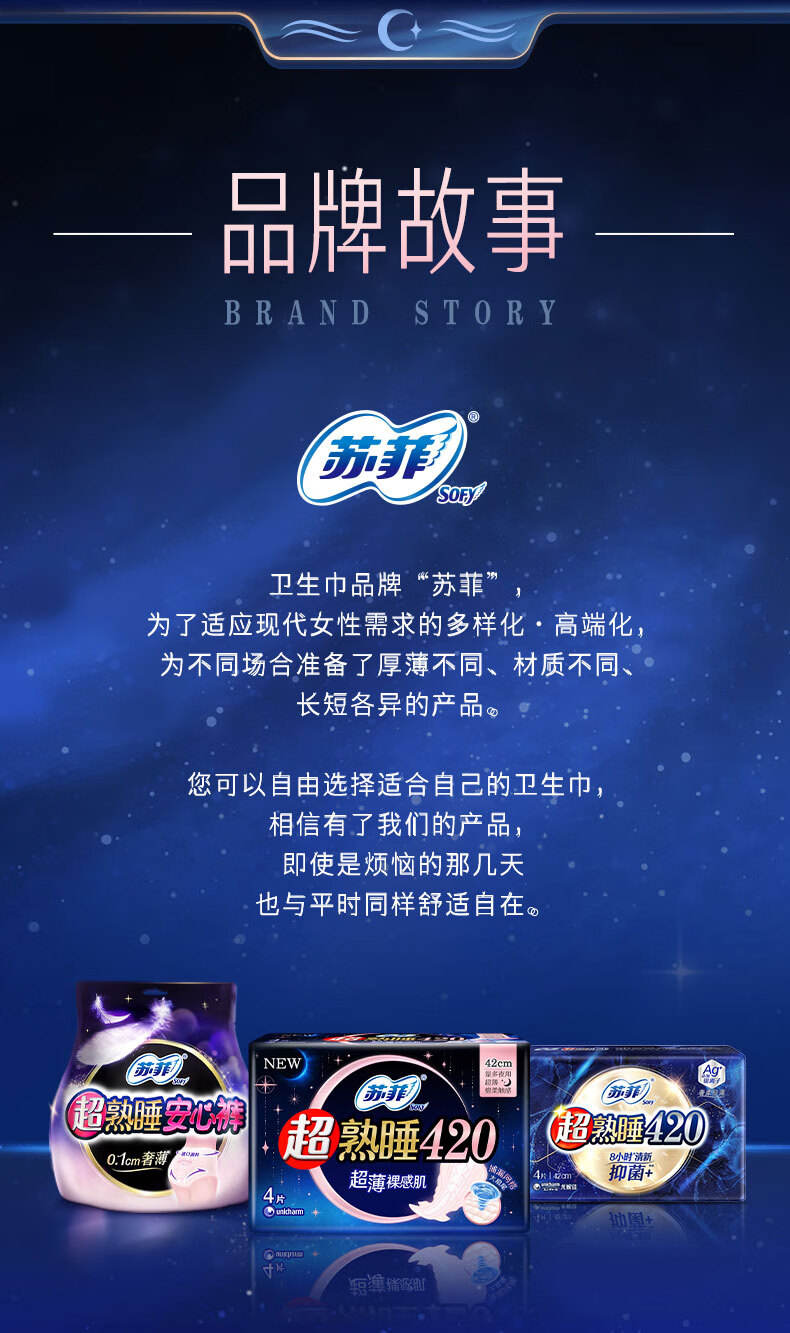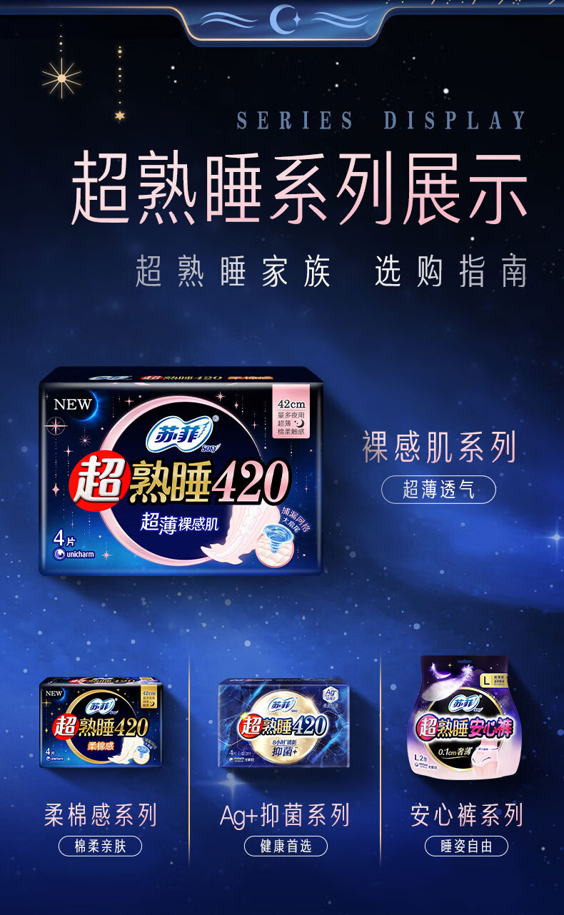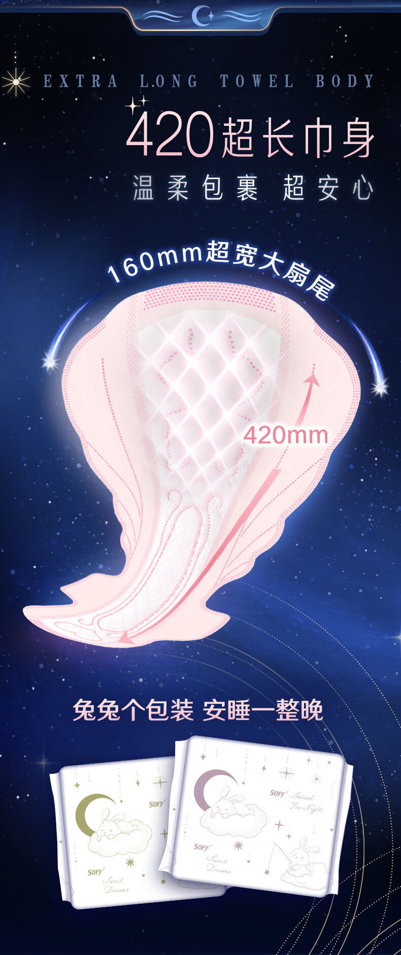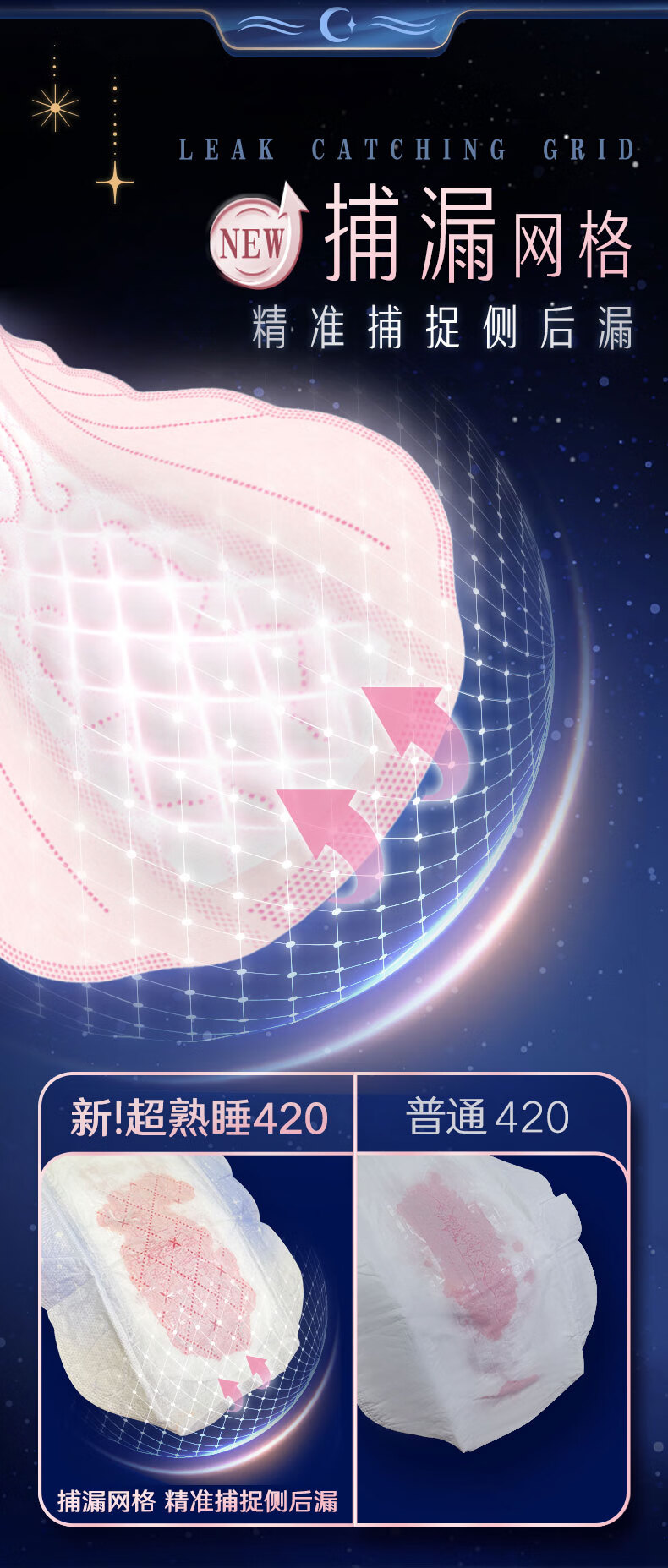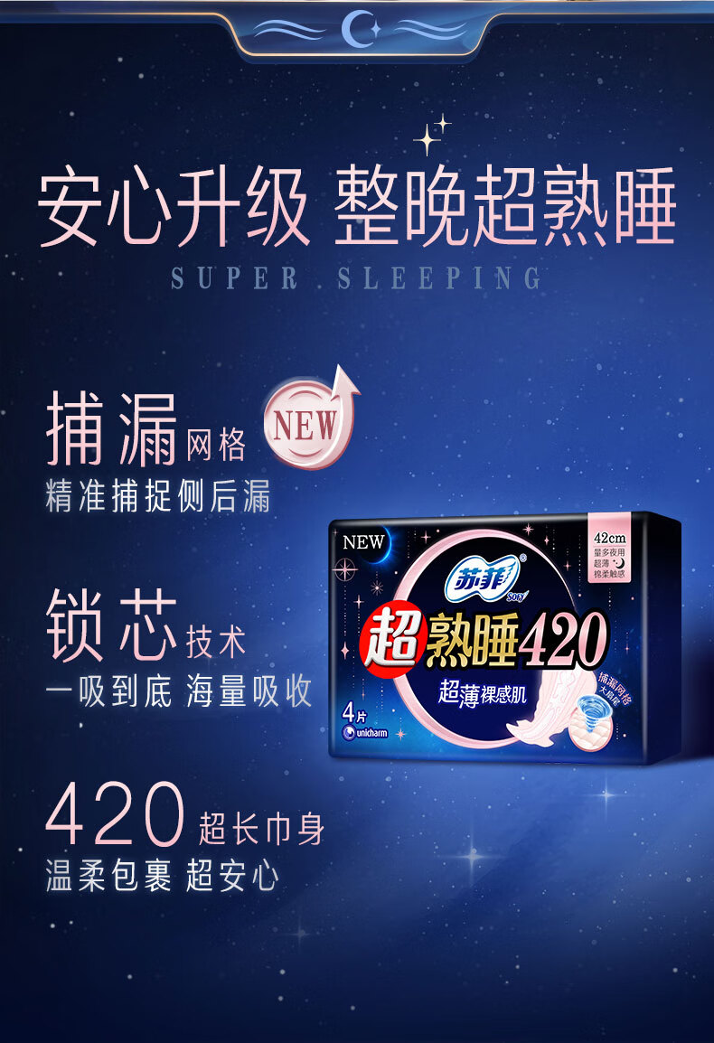 苏菲超熟睡超薄裸感肌超长卫生巾420mm 4片 超大尾扇量多防渗漏姨妈巾