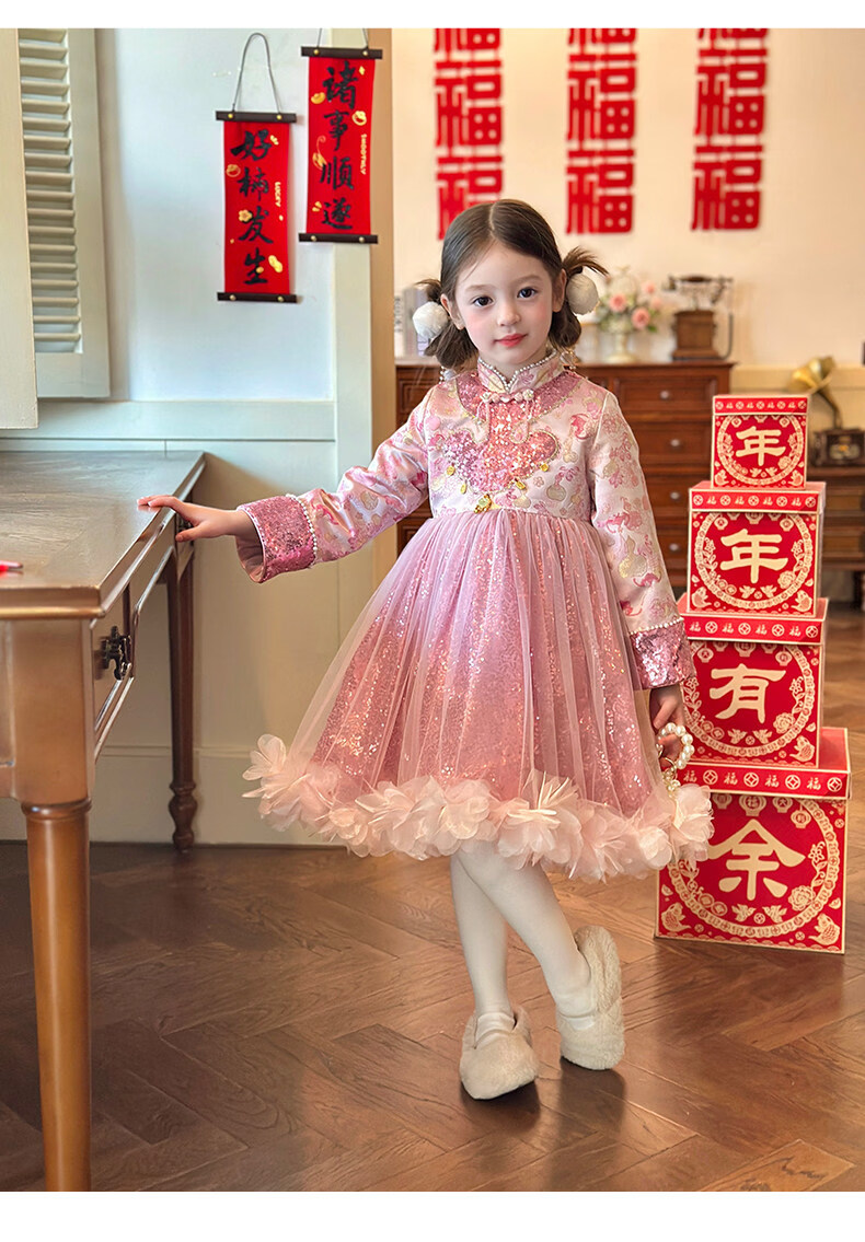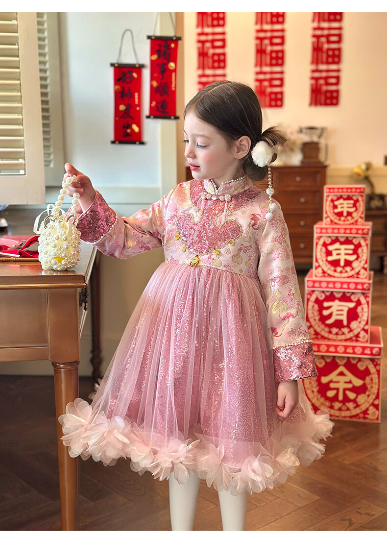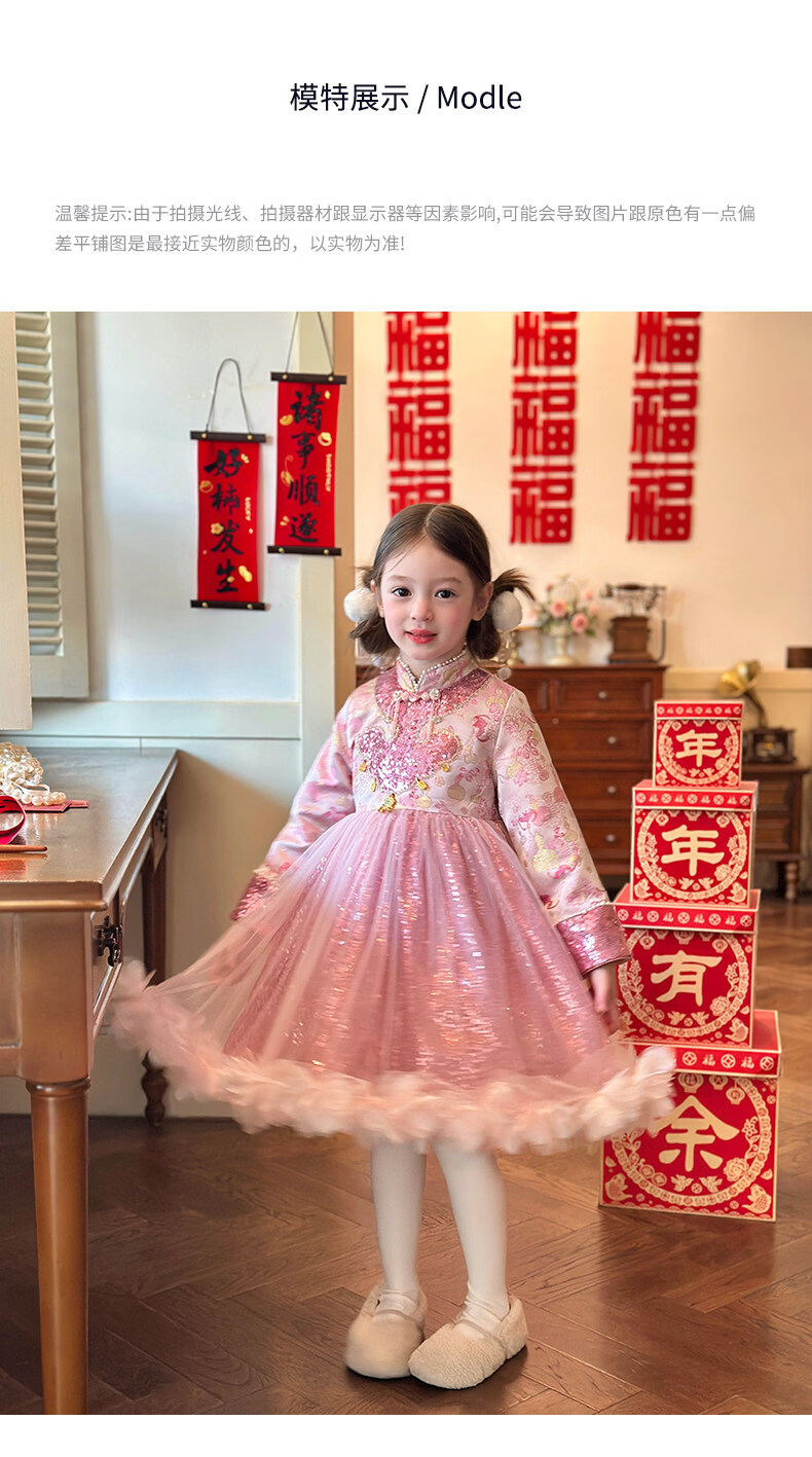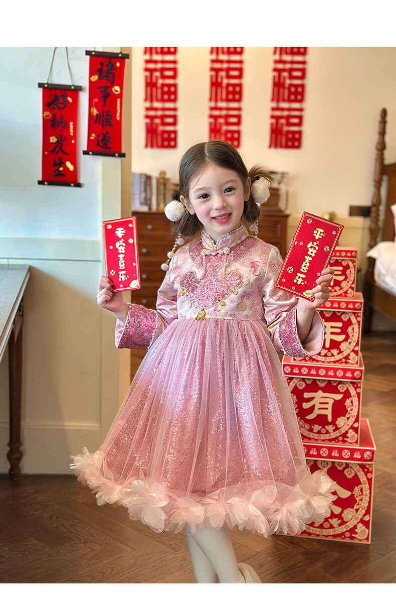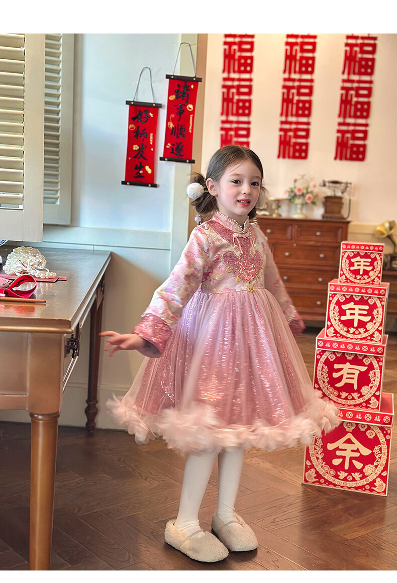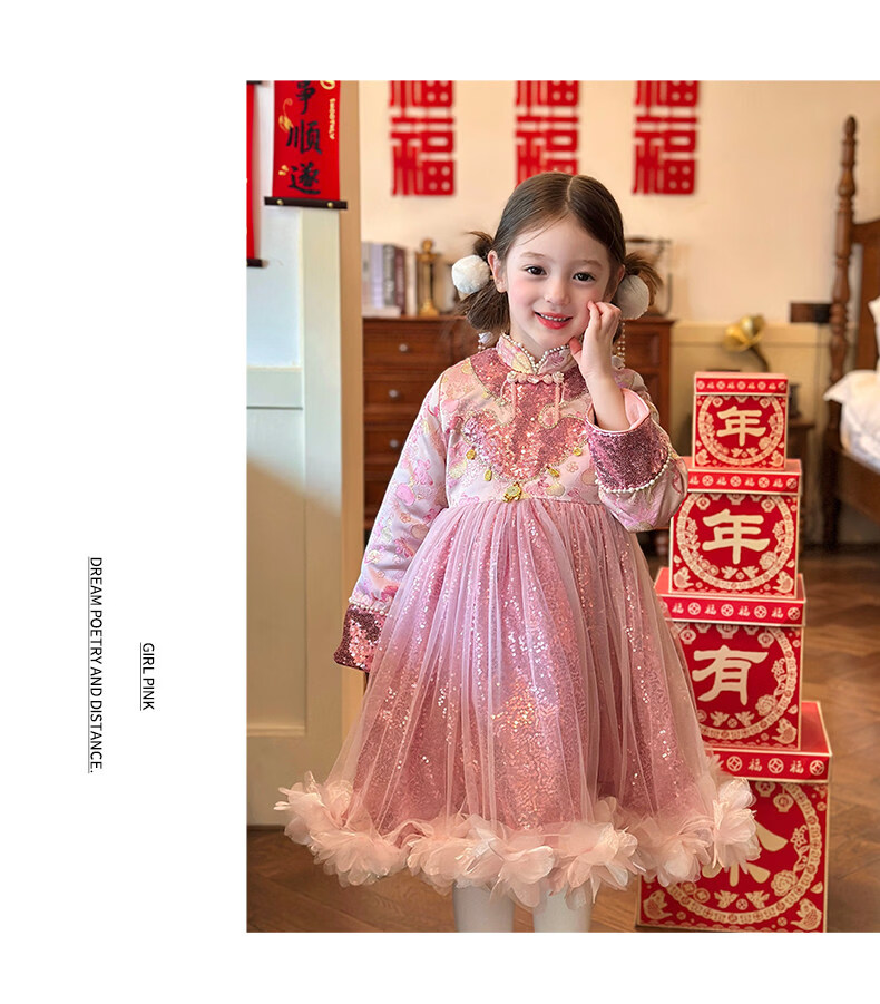 栀了成长记童装女童新中式旗袍网纱裙2025冬季儿童国风加绒连衣裙 粉色 连衣裙 100 cm