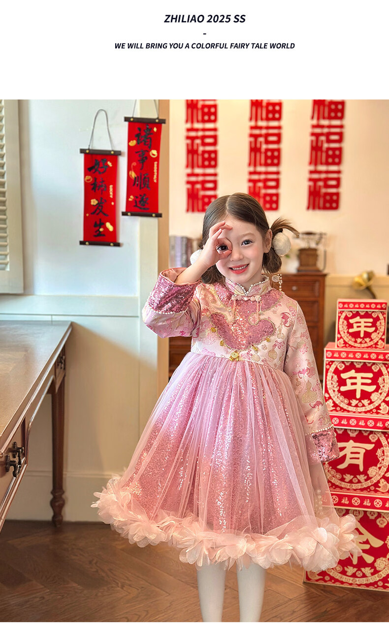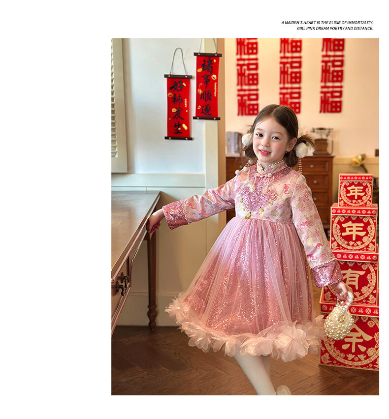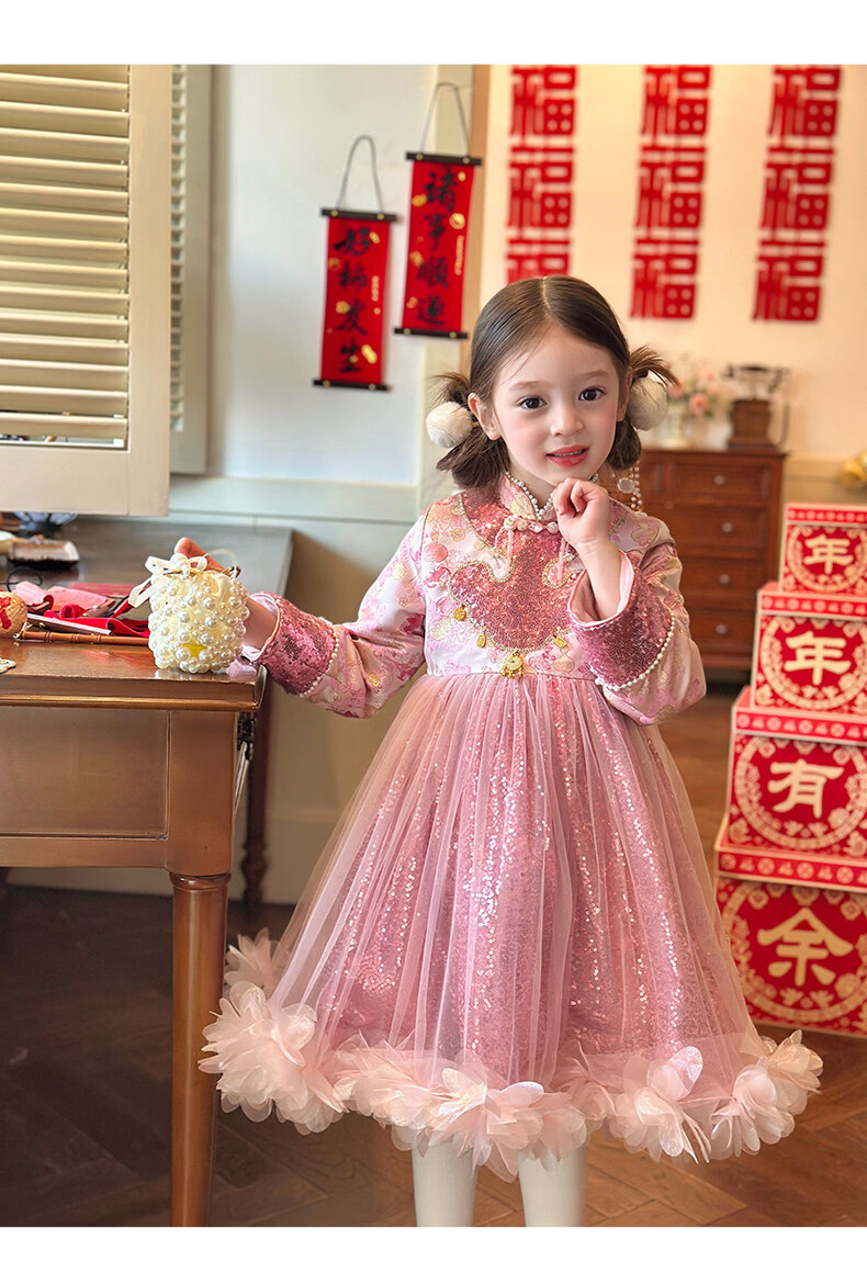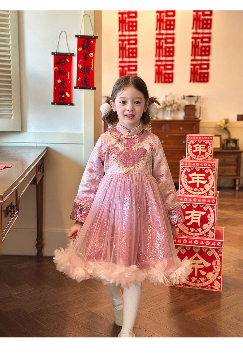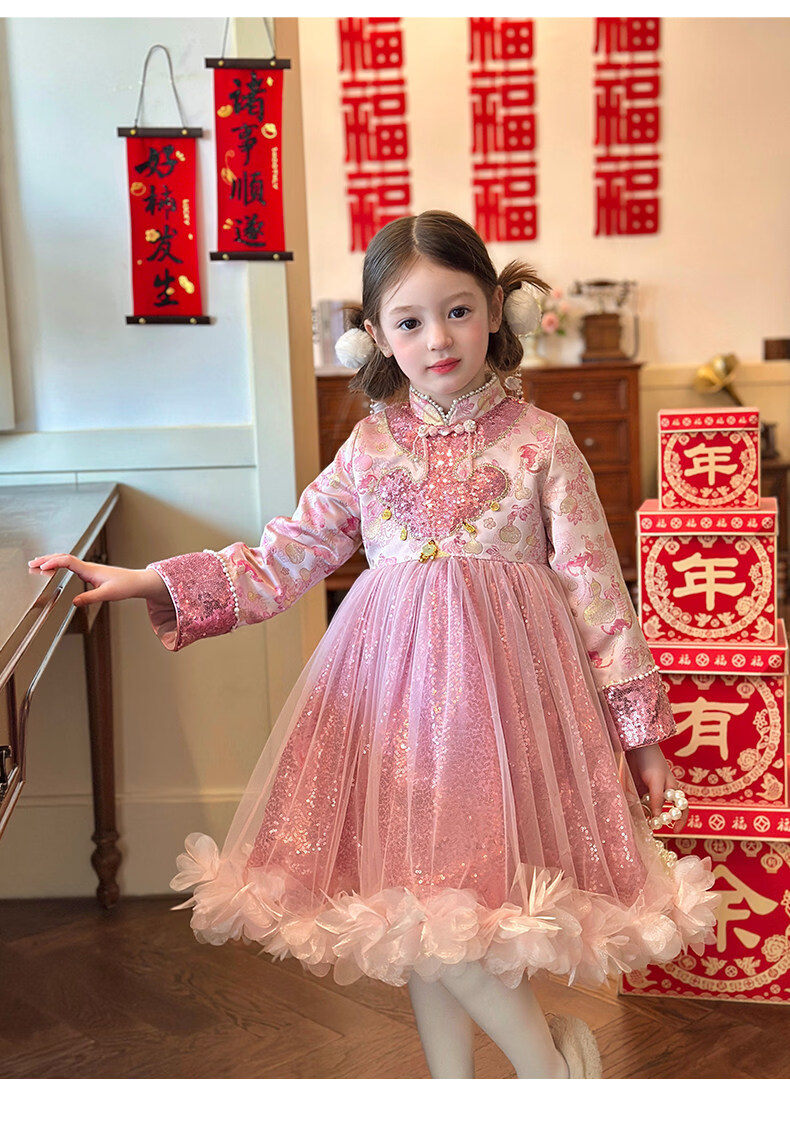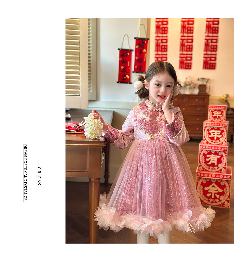 栀了成长记童装女童新中式旗袍网纱裙2025冬季儿童国风加绒连衣裙 粉色 连衣裙 100 cm