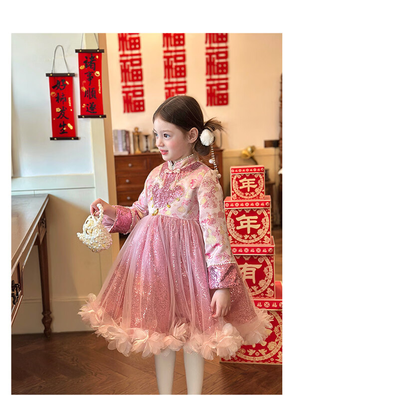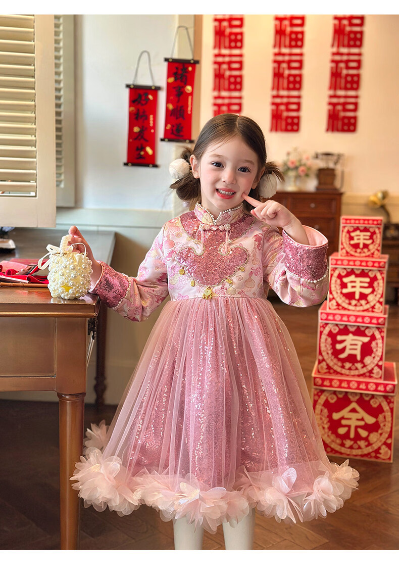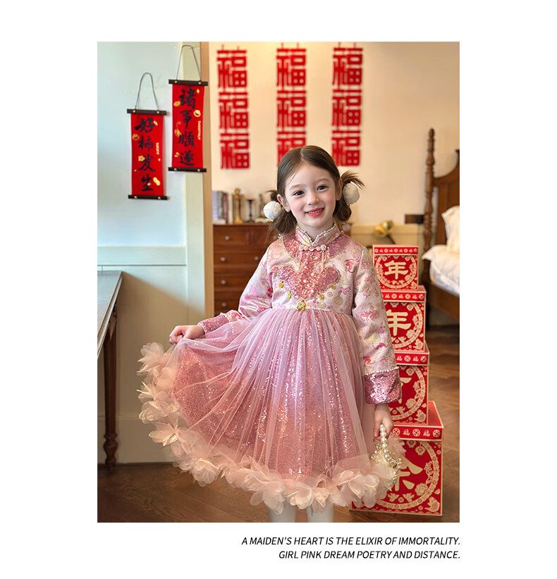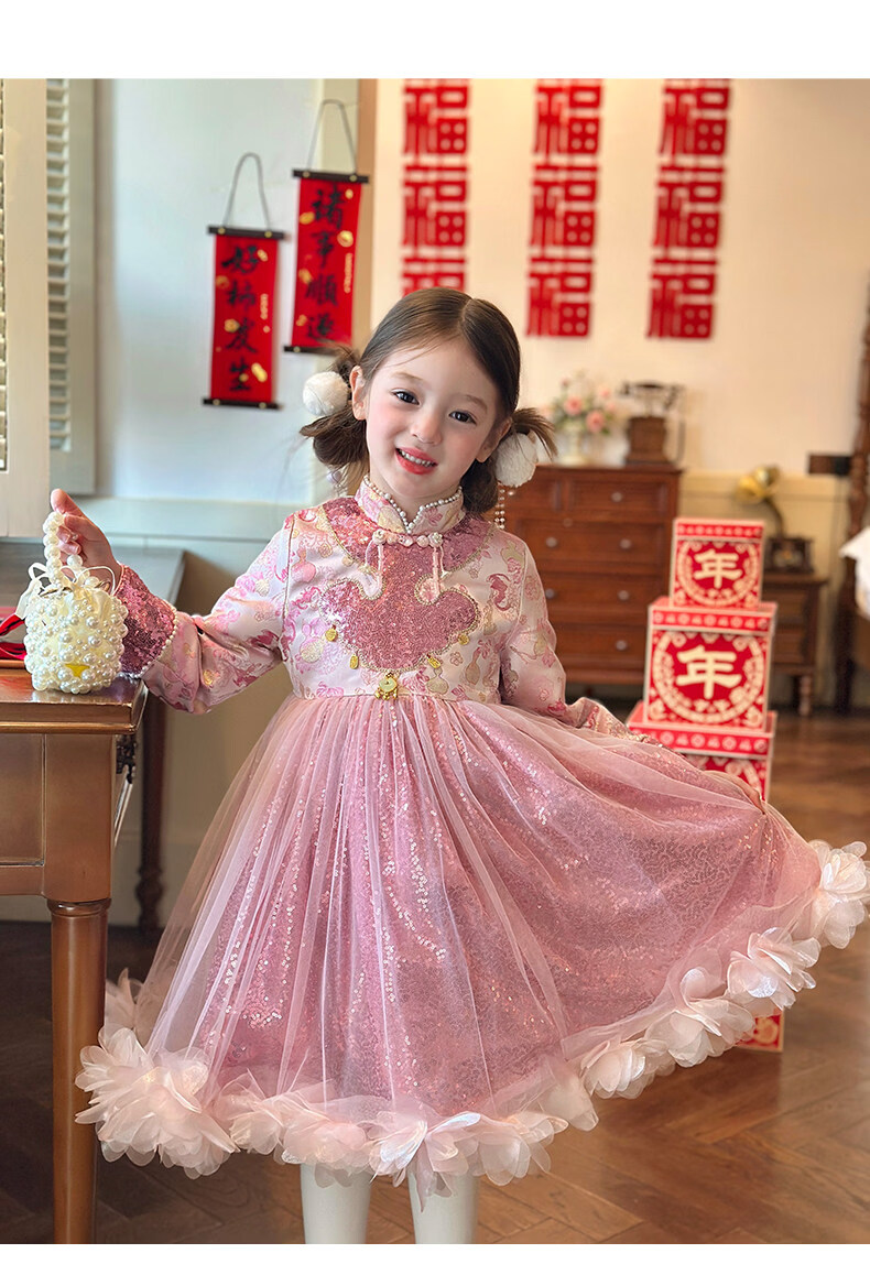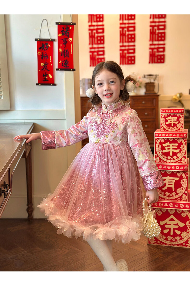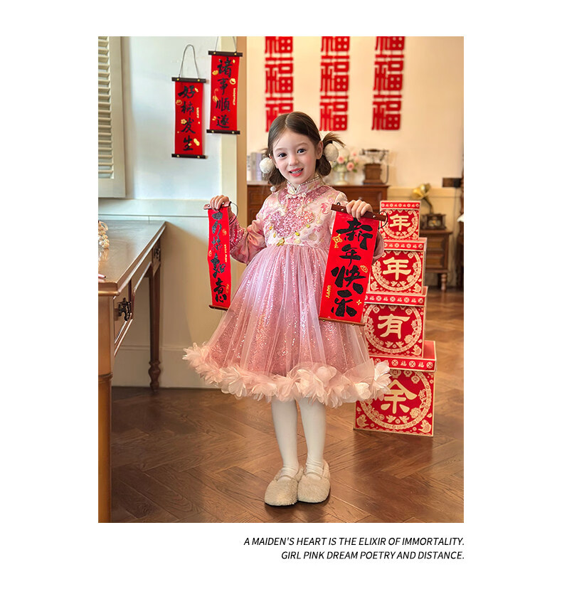 栀了成长记童装女童新中式旗袍网纱裙2025冬季儿童国风加绒连衣裙 粉色 连衣裙 100 cm