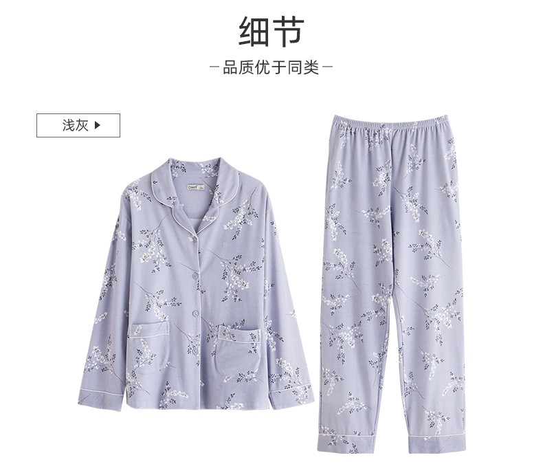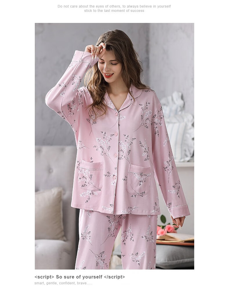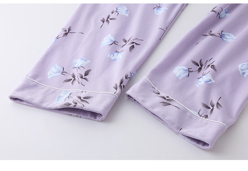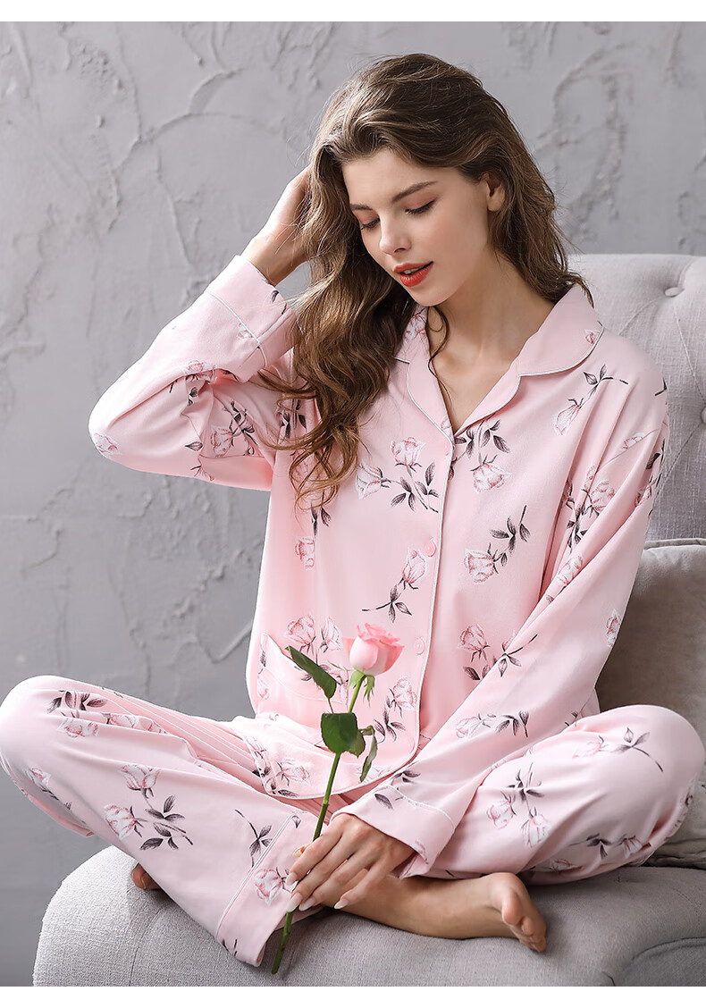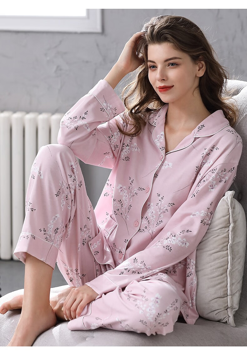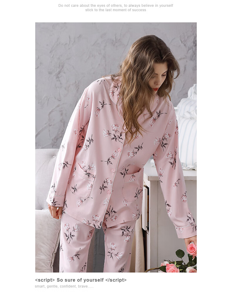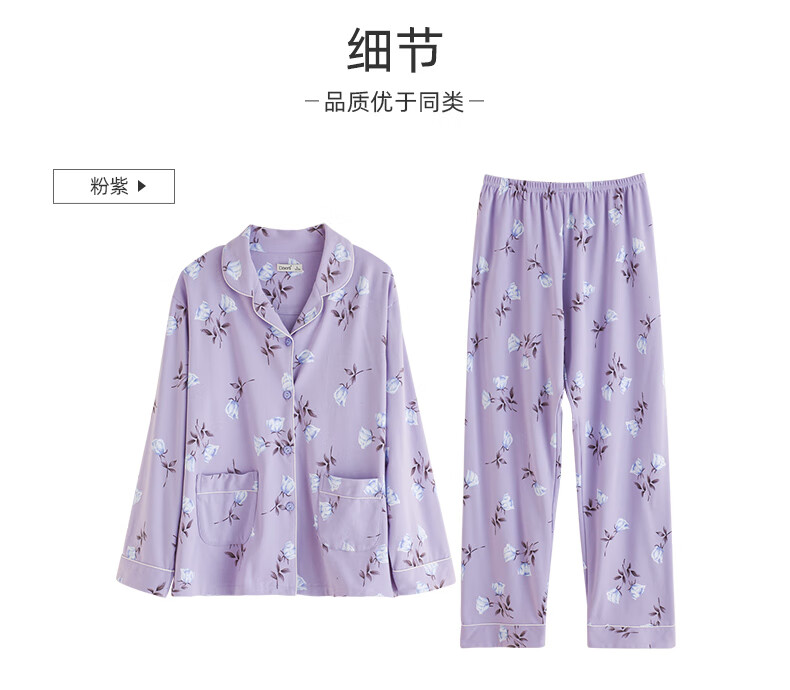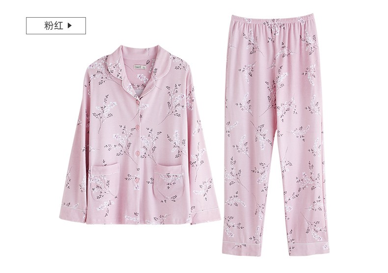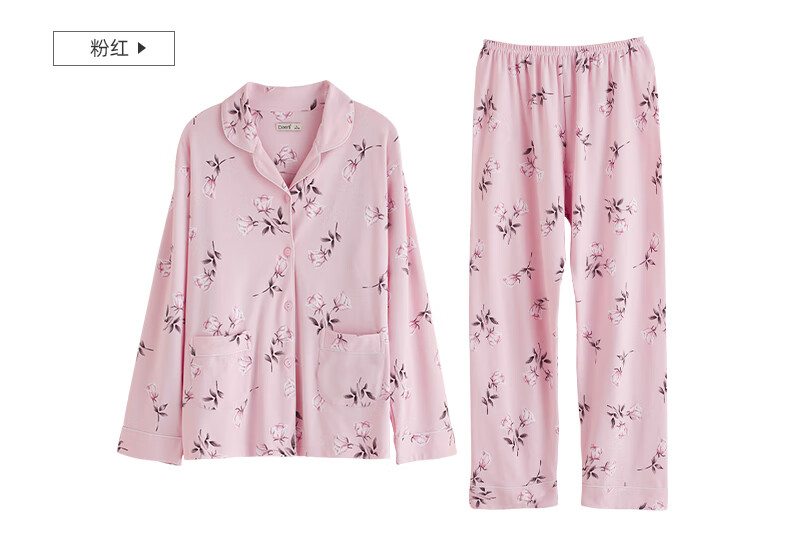 达尔丽睡衣女春秋长袖玫瑰印花大码休闲针织棉开衫国风家居服套装夏新款 T8245118-018-杏色 XL
