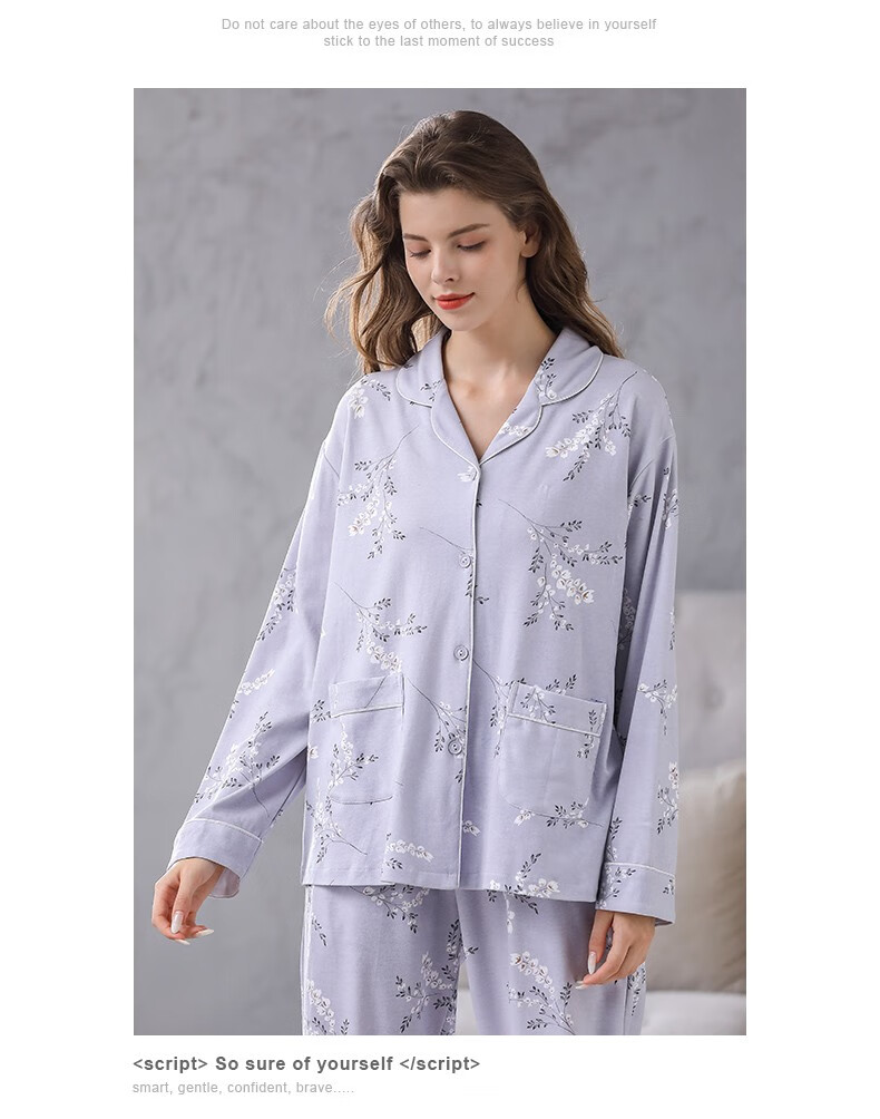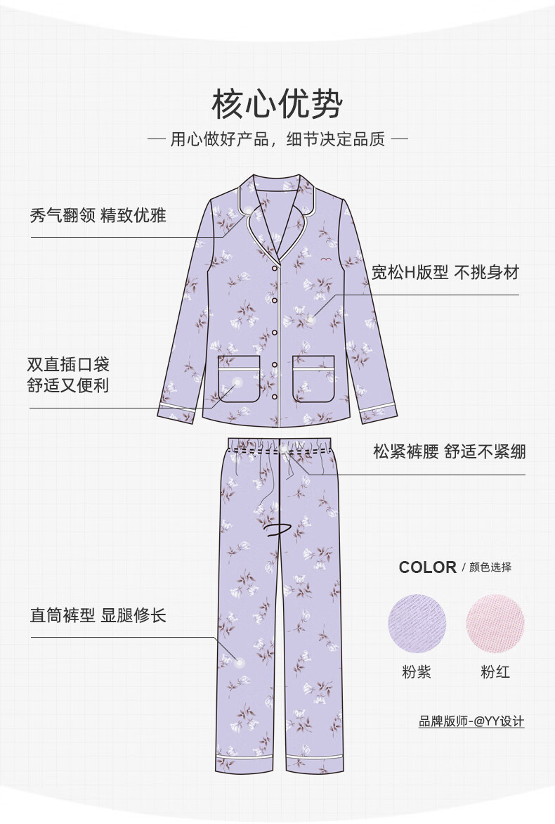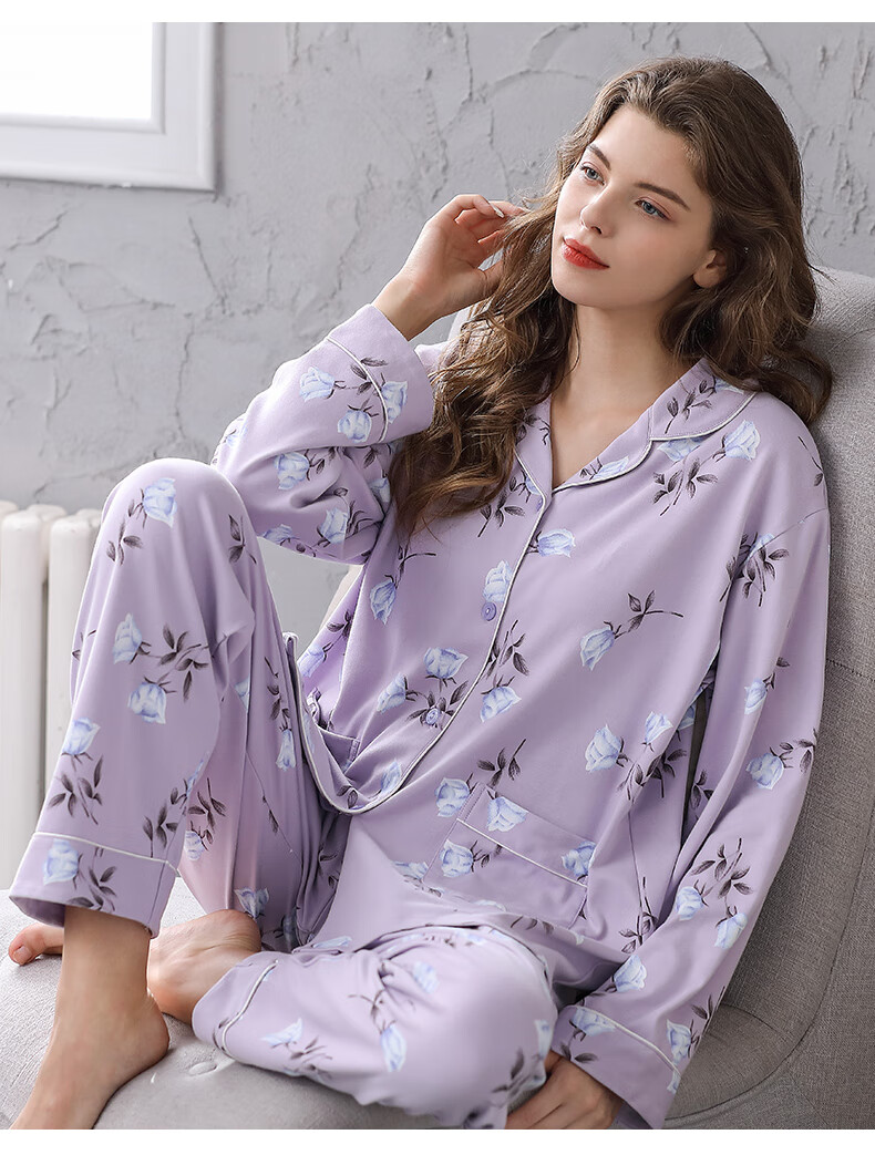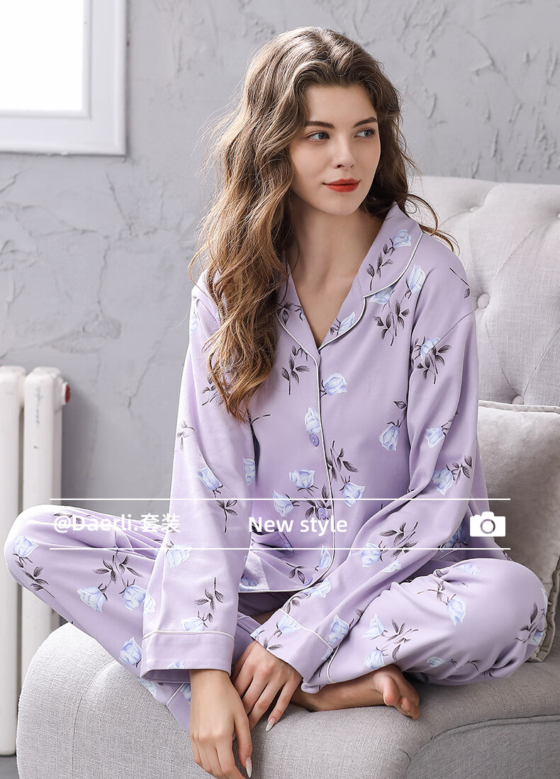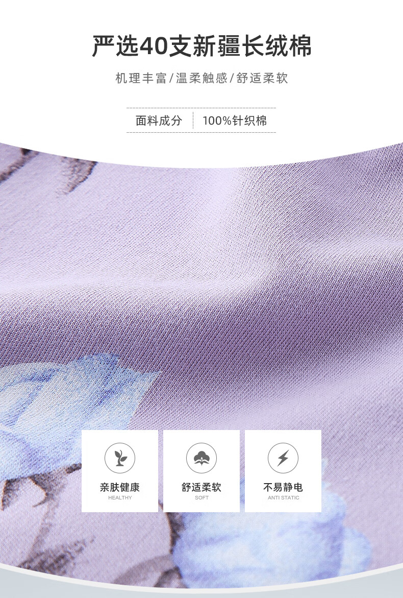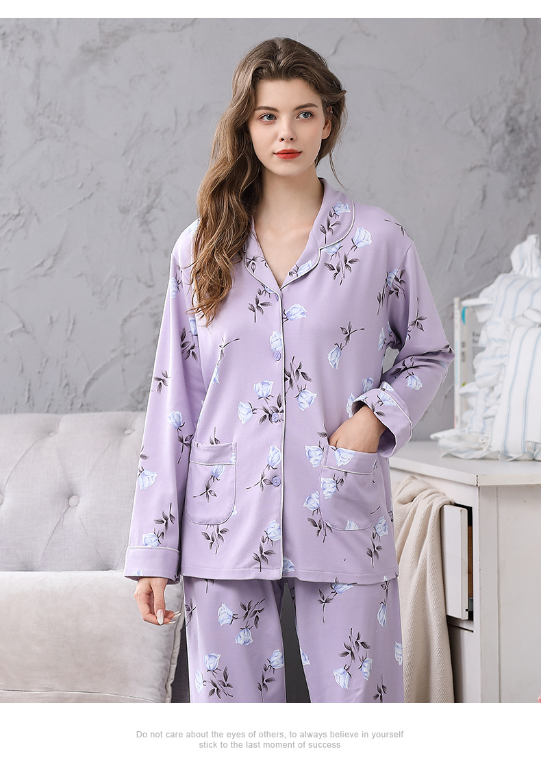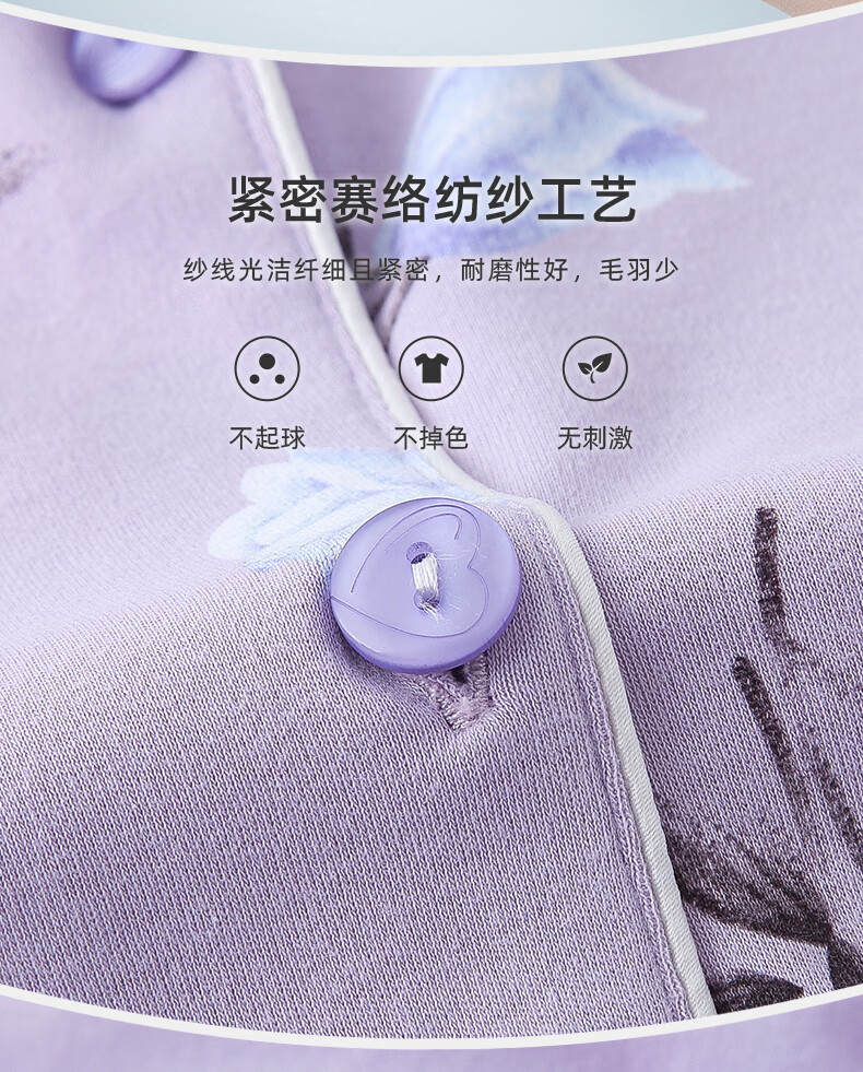 达尔丽睡衣女春秋长袖玫瑰印花大码休闲针织棉开衫国风家居服套装夏新款 T8245118-018-杏色 XL