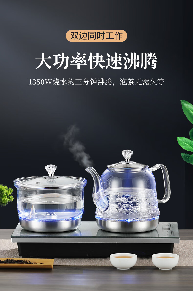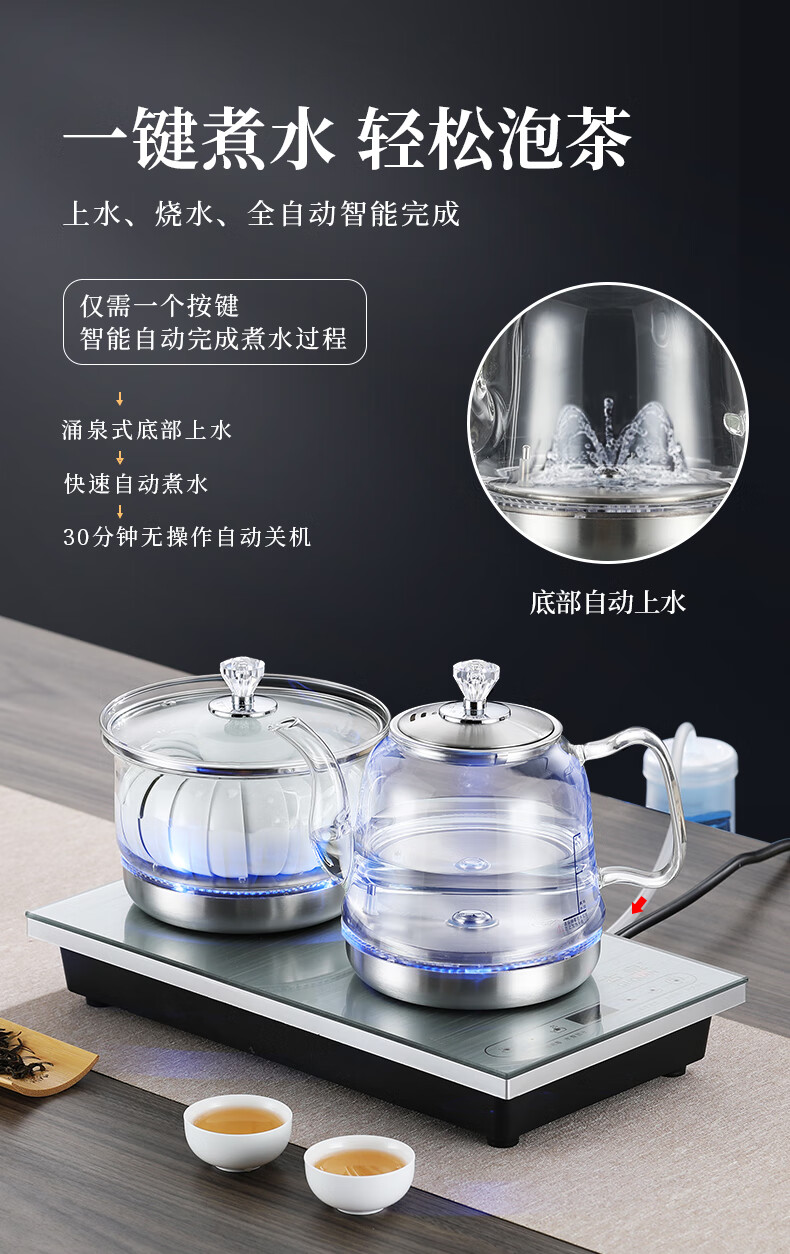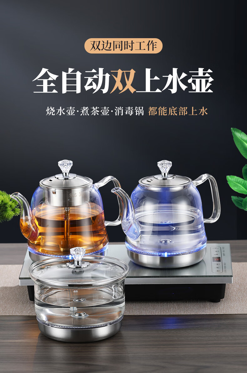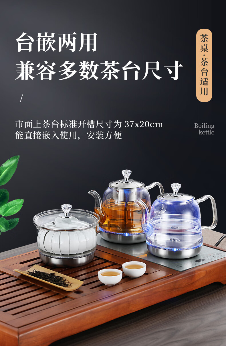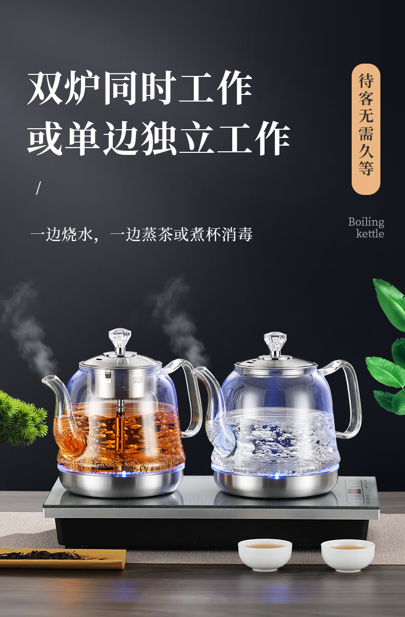 金格仕(KinGaz)自动上水电热水壶 双炉可同时加热功夫茶套装 底部加水自动烧水壶 家用玻璃电茶炉嵌入式茶台一体 1.2L 双上水 (拉丝银色) 三件套 23X37cm