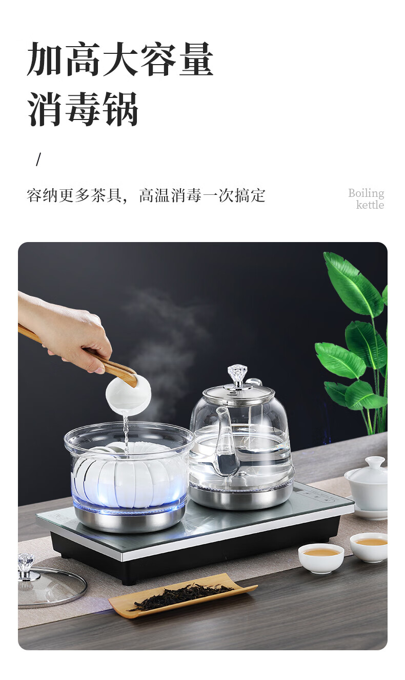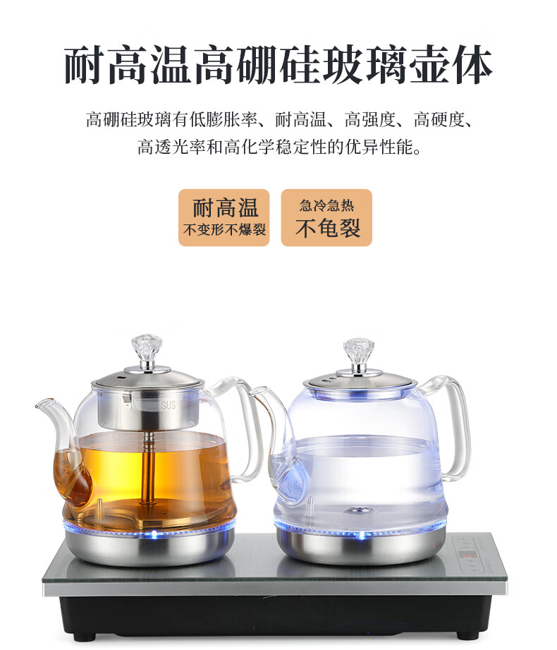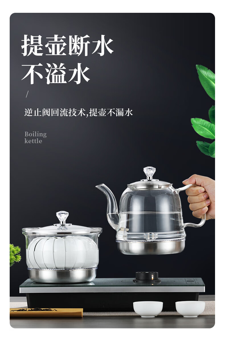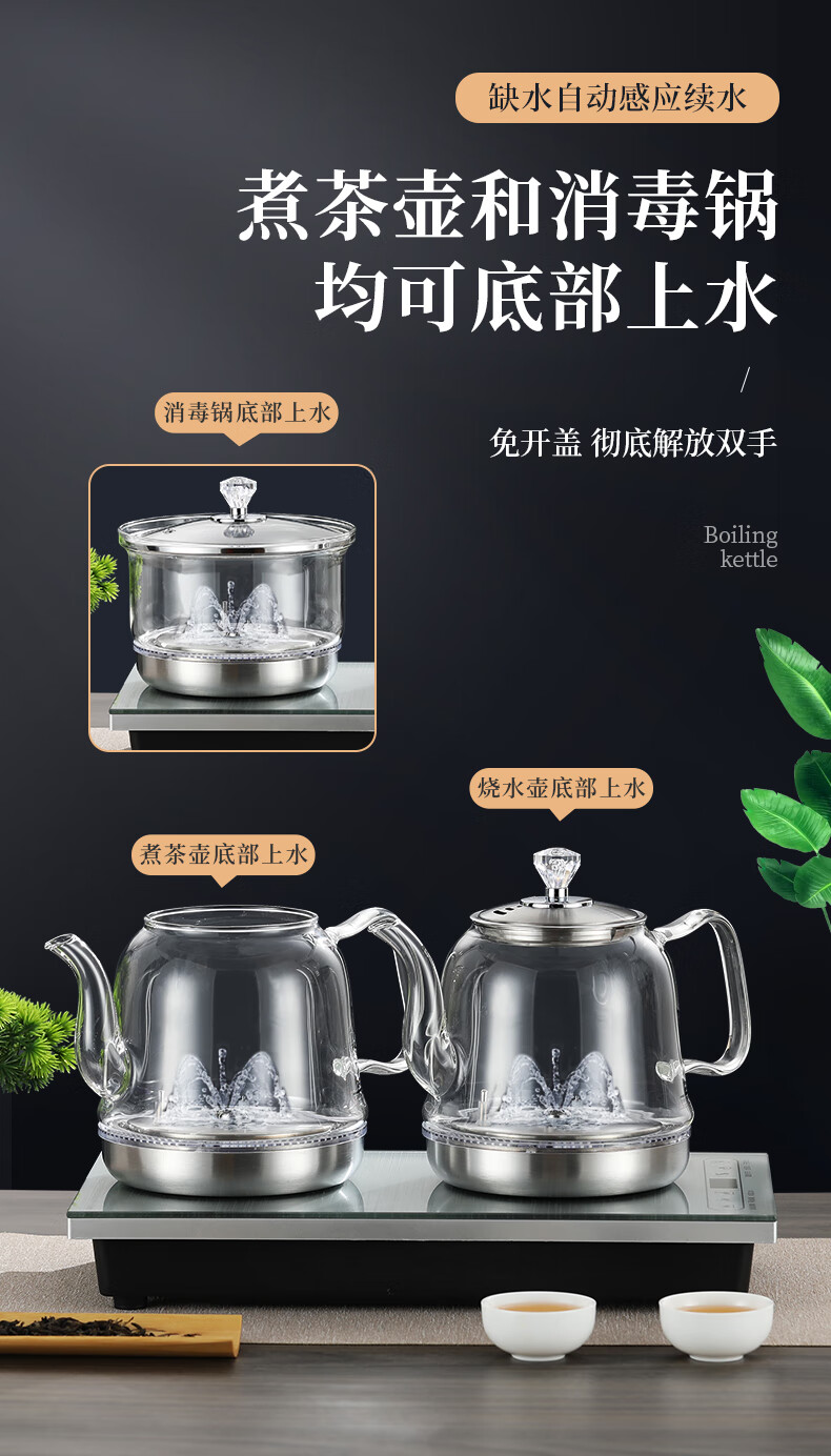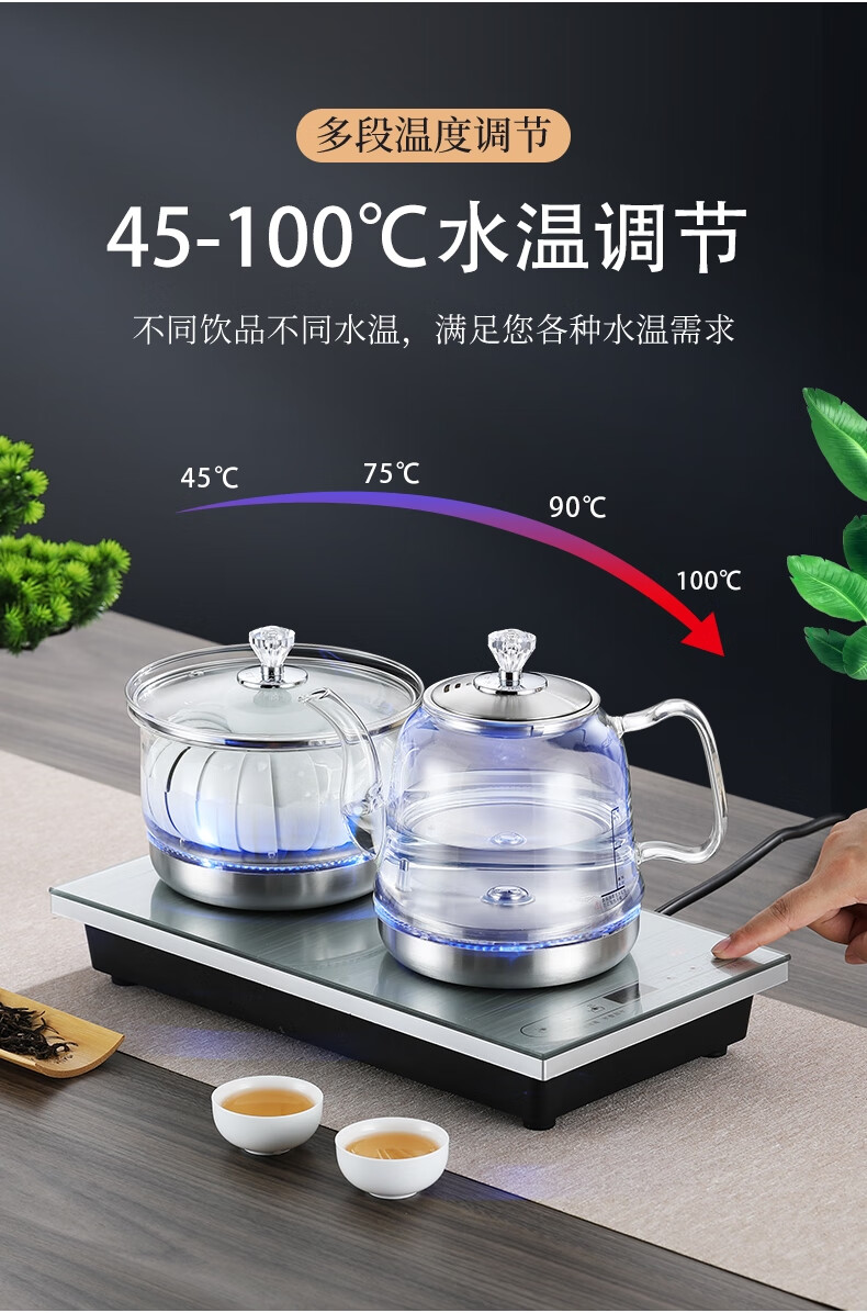 金格仕(KinGaz)自动上水电热水壶 双炉可同时加热功夫茶套装 底部加水自动烧水壶 家用玻璃电茶炉嵌入式茶台一体 1.2L 双上水 (拉丝银色) 三件套 23X37cm