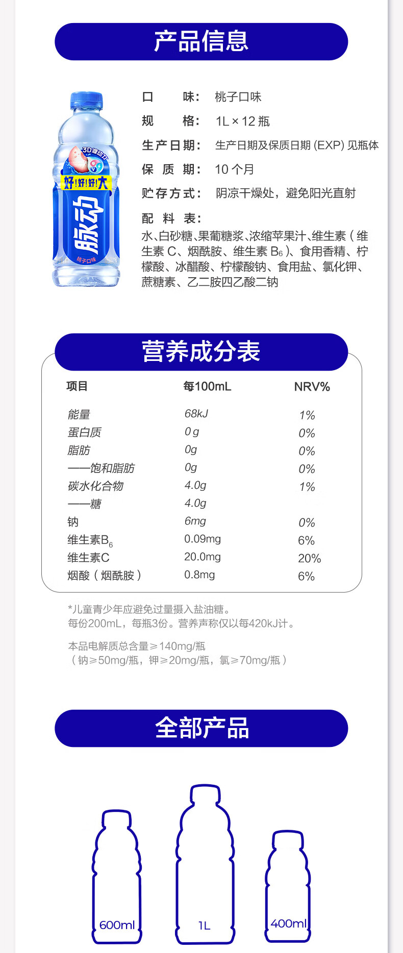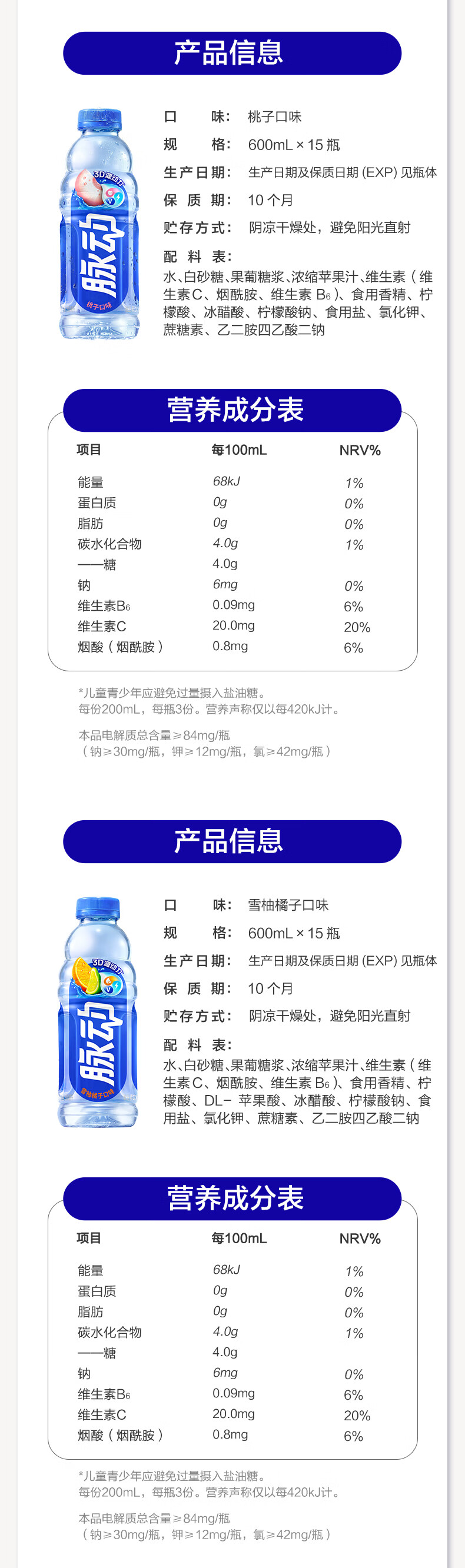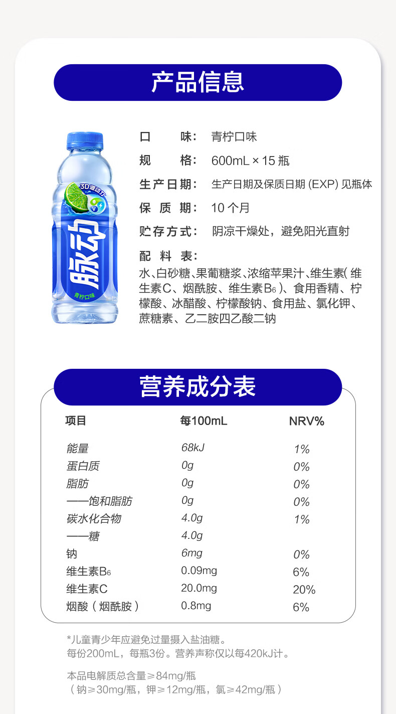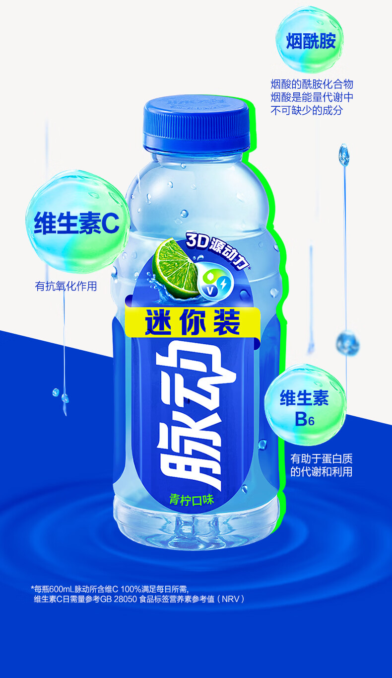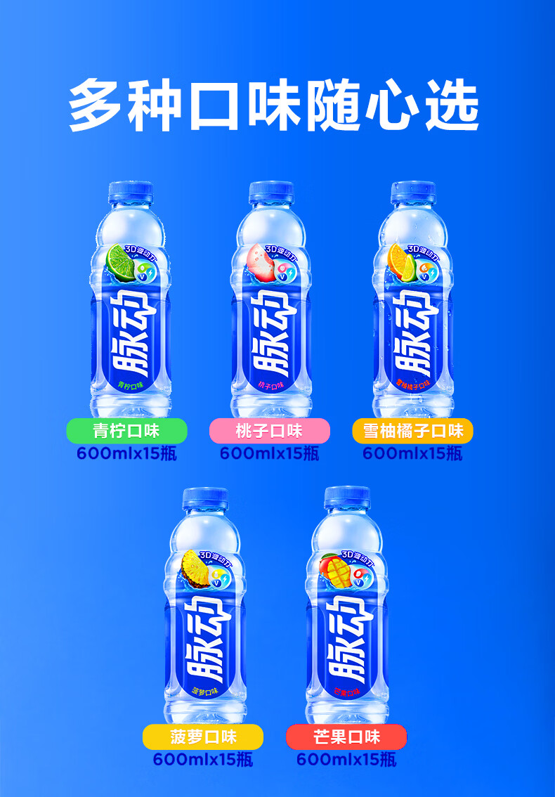 脉动夏季饮品水果混合口味含维生素C低糖运动饮料家庭装便携装出游装 青柠600*6+蜜桃600*6