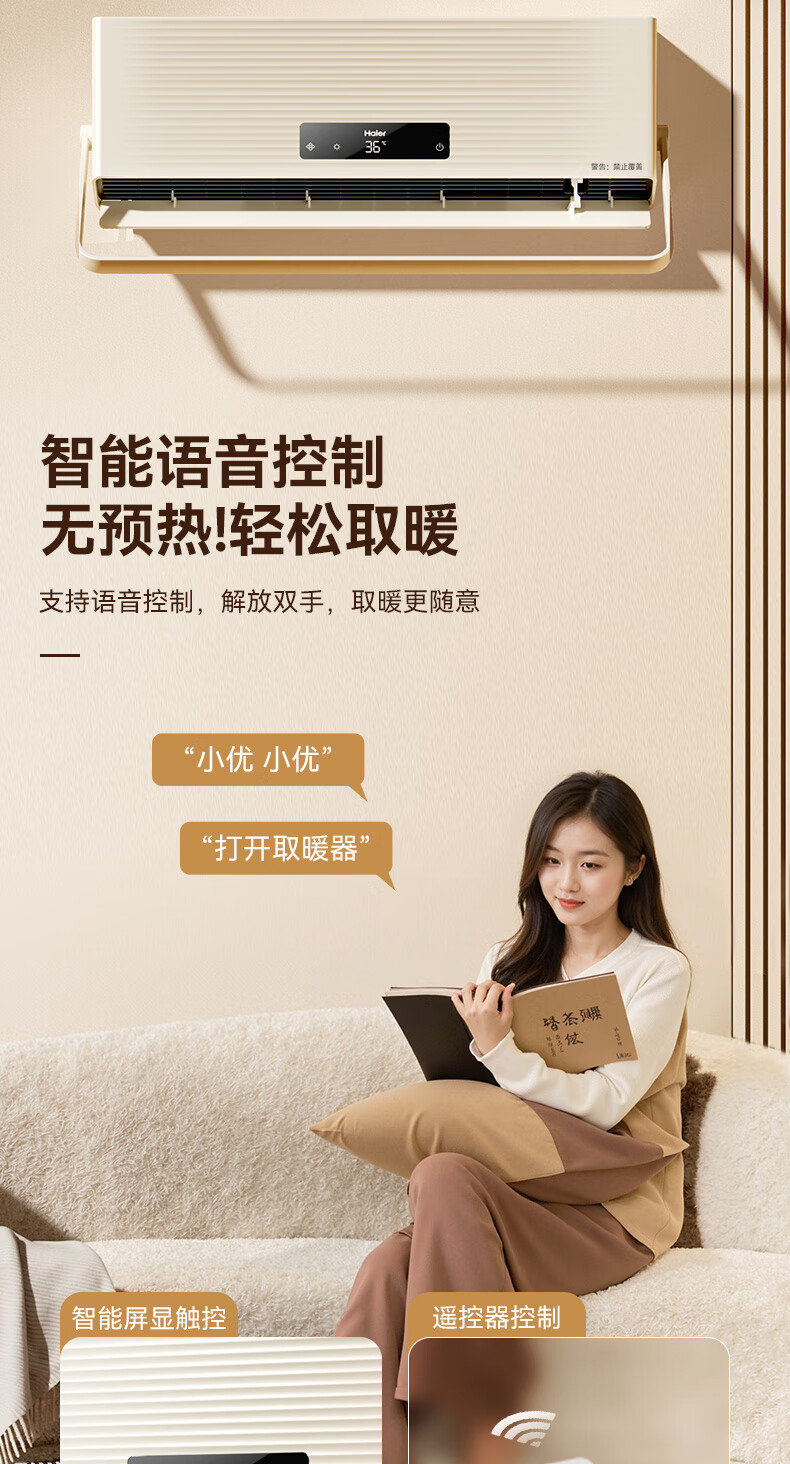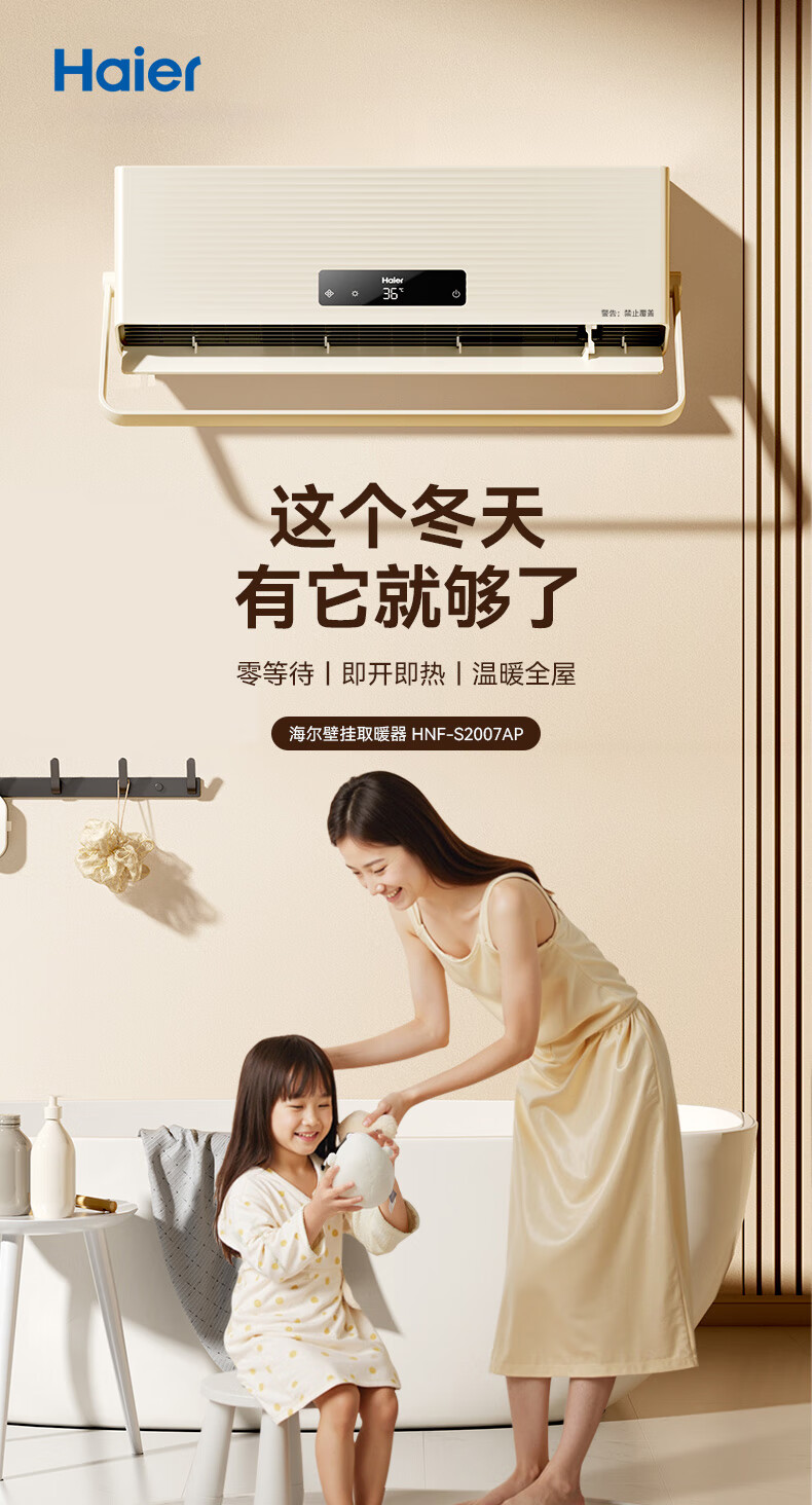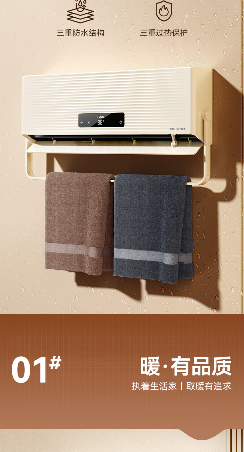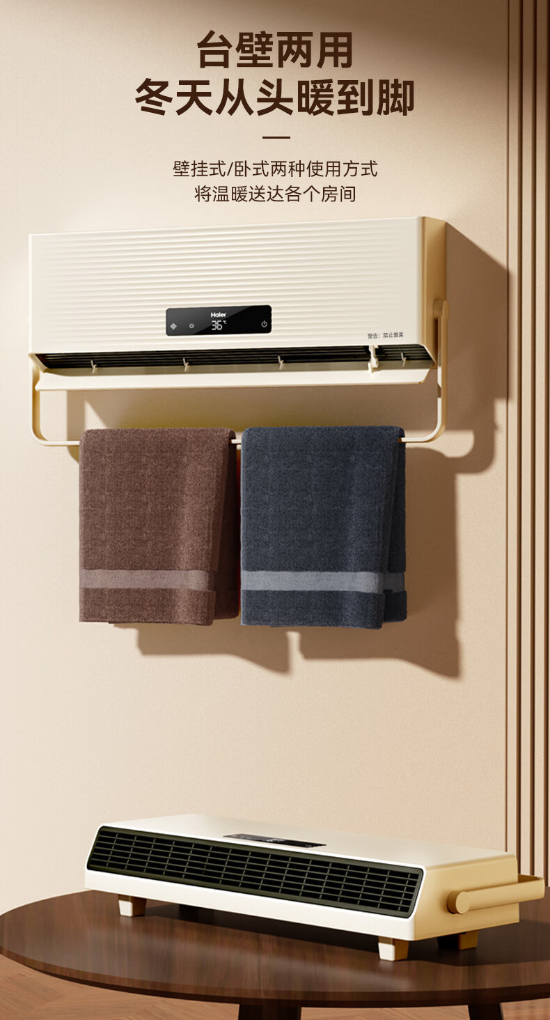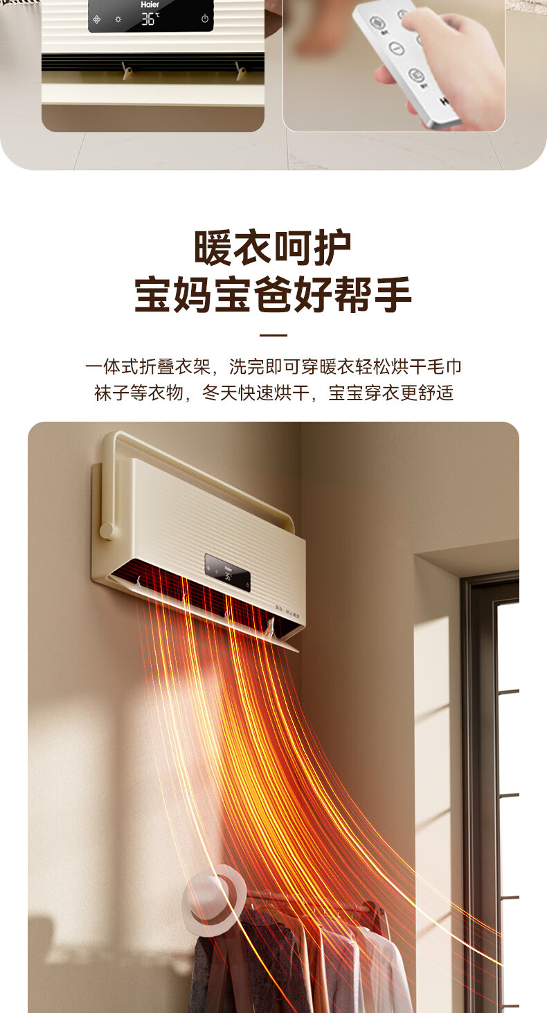 海尔(Haier)壁挂暖风机免打孔悬挂台壁两用取暖器浴室洗澡防水浴霸电暖器轻音电暖气智能语音卧室卫生间热风机 浴室防水/台壁两用/遥控款HNF-2007