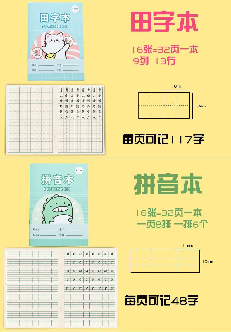 小学生拼习习字作业本子汉语拼音田字本生字一年级全国标准数学英语语文田字格练字练习写字本幼儿园小字方格 20本拼习本