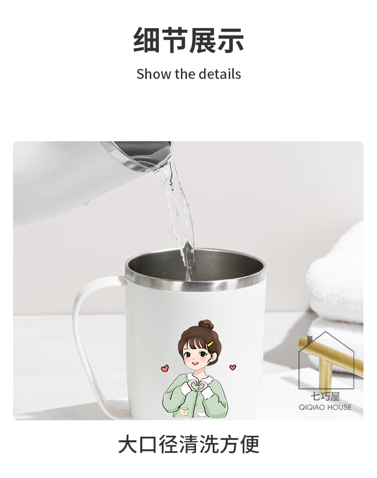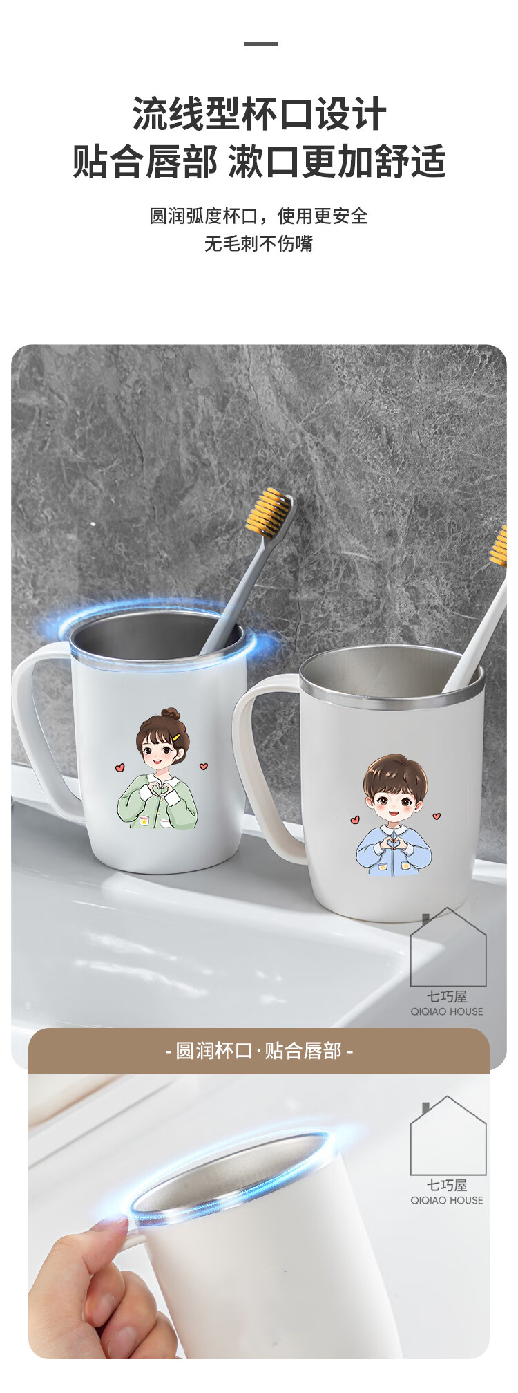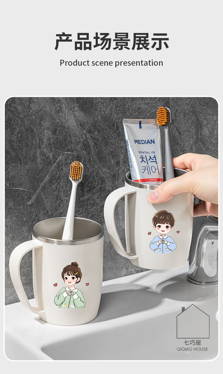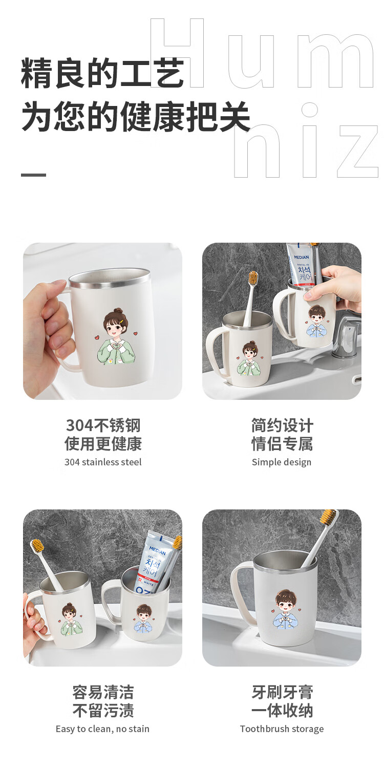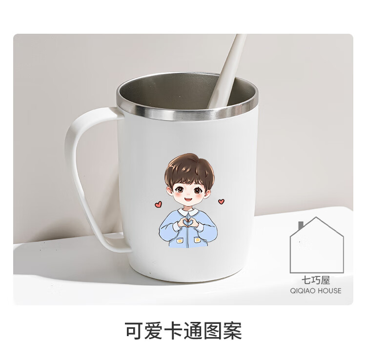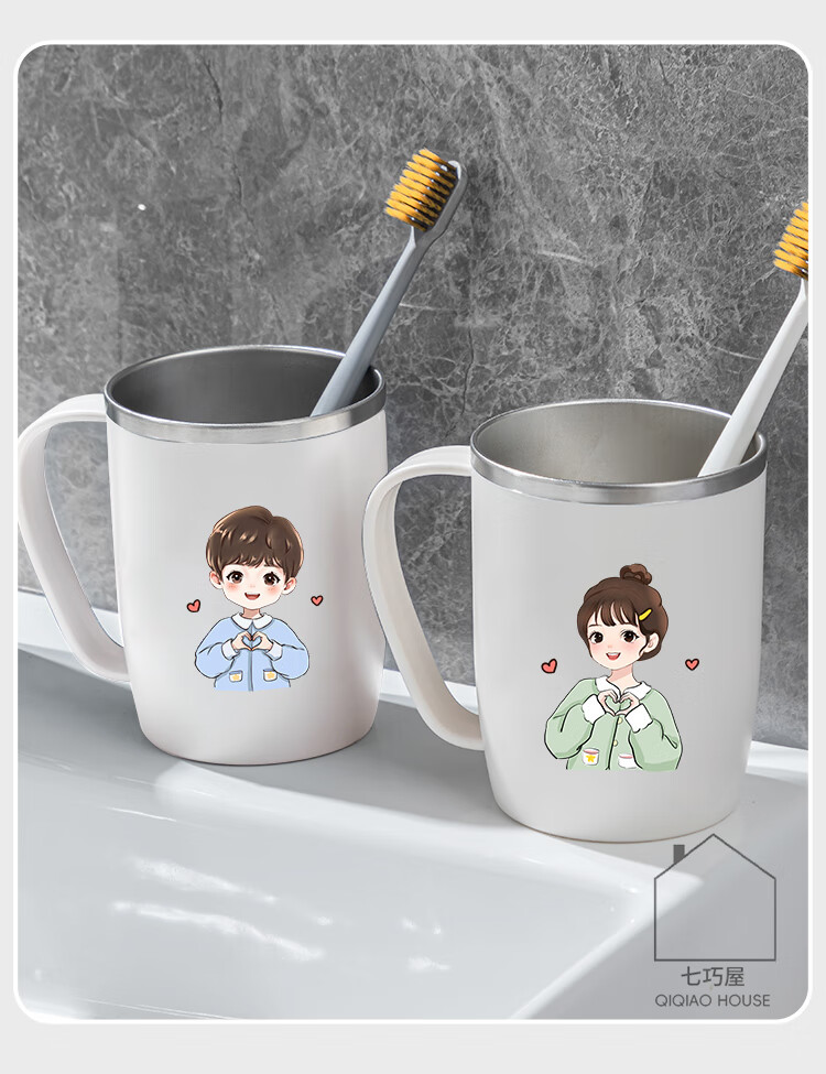304不锈钢漱口杯情侣刷牙杯高颜值学生牙刷杯牙缸洗漱杯牙杯牙具 情侣2个装带把【爱心男孩+爱心女孩】