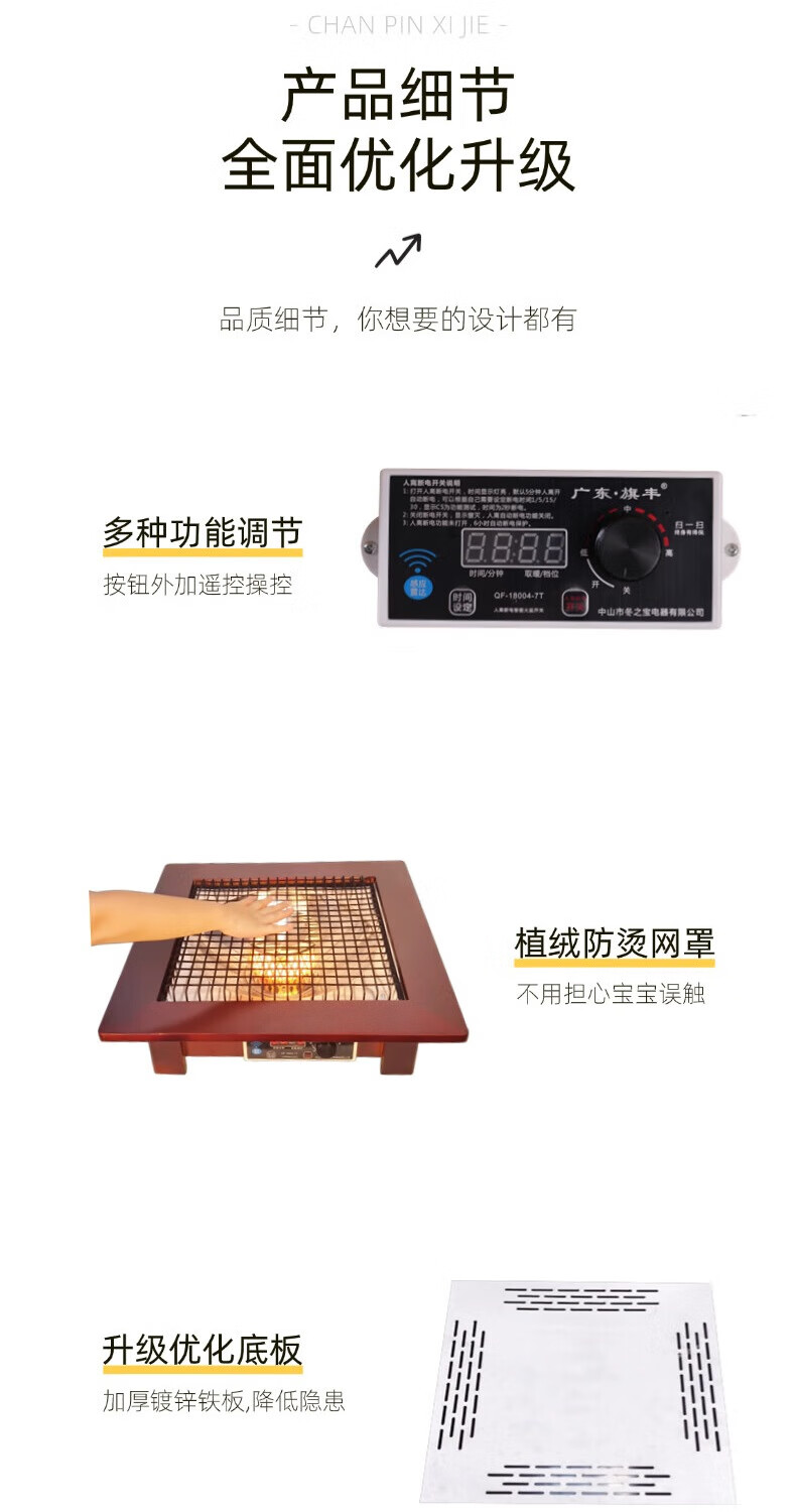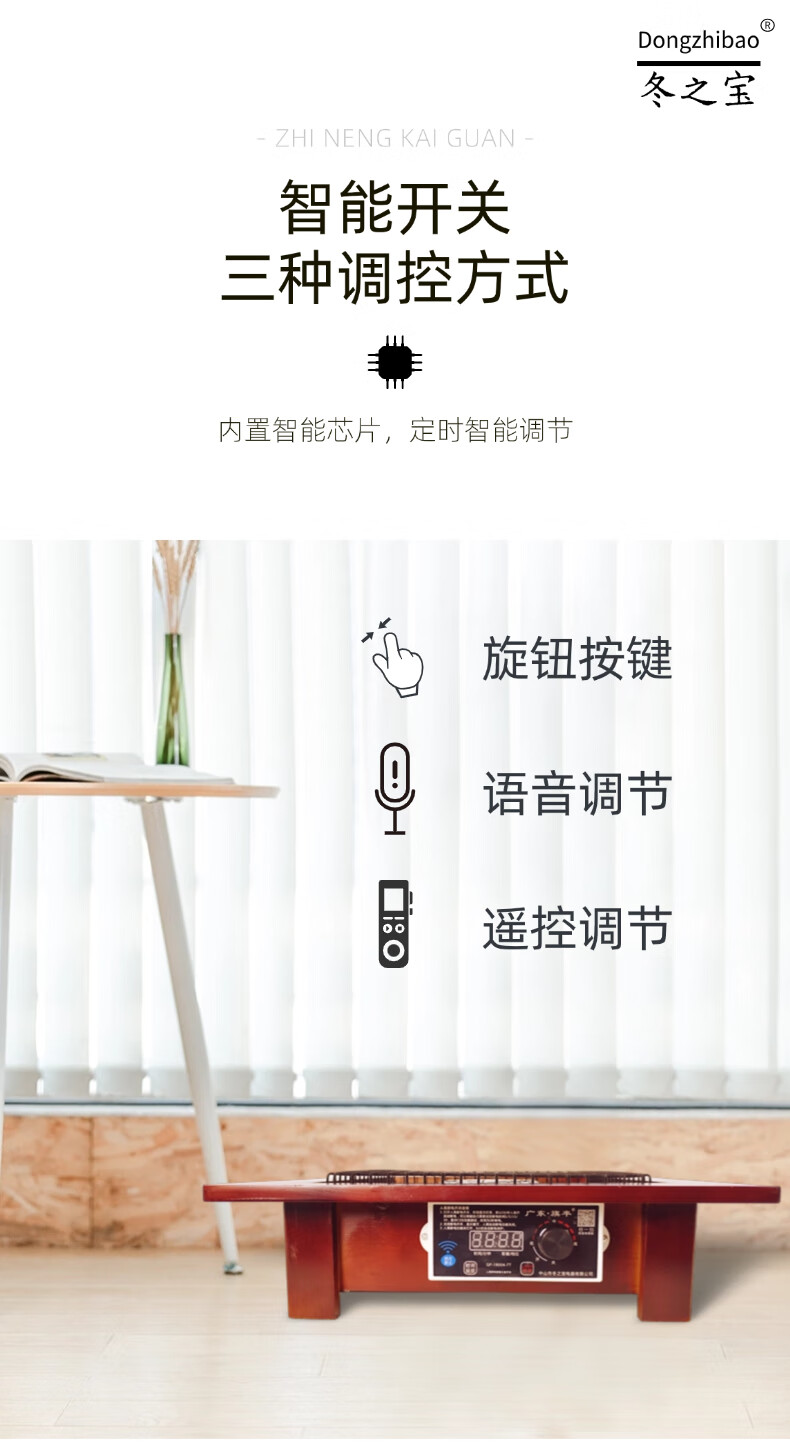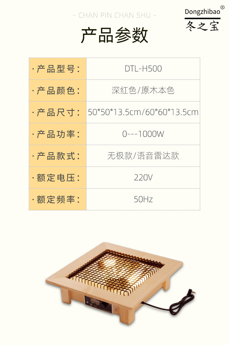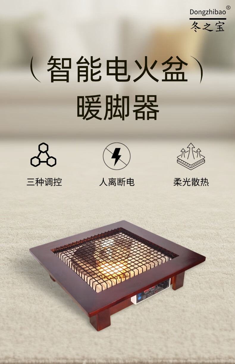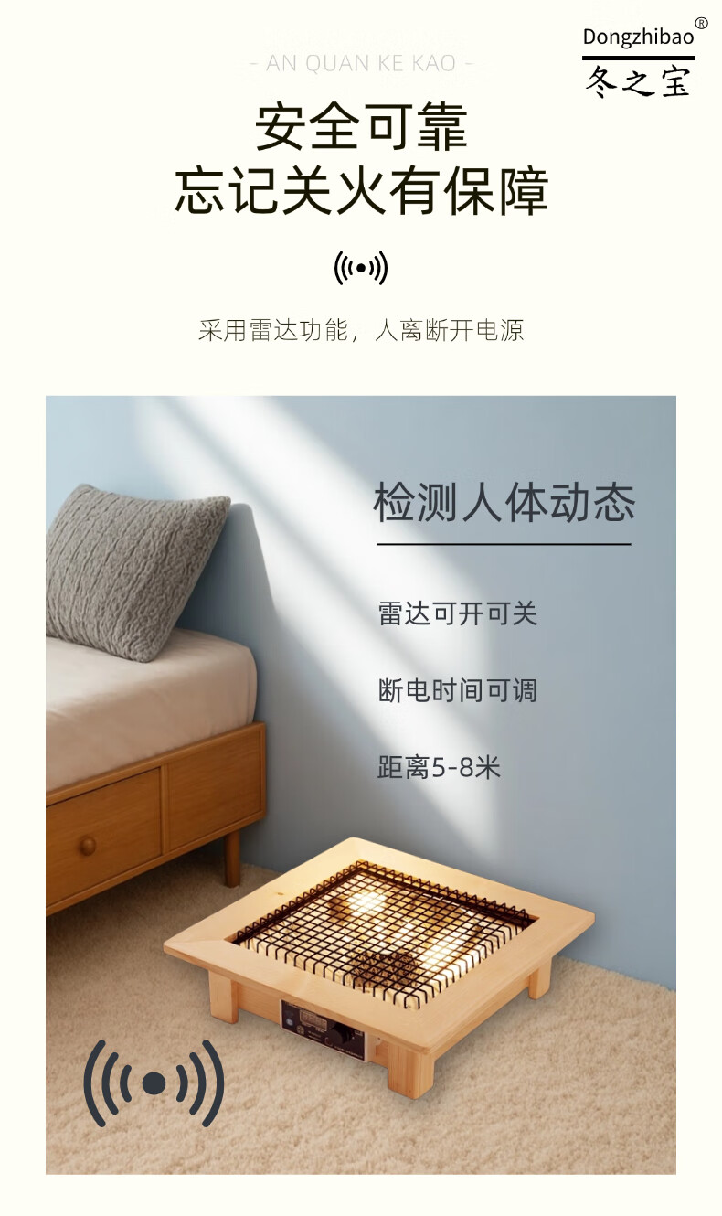 DONGZHIBAO【人离自动断电】语音控制远程遥控家用实木取暖器暖脚烤火盆电热烤火炉四方形取暖器桌下烤脚火炉 人离断电【60*60*13.5cm】原木色