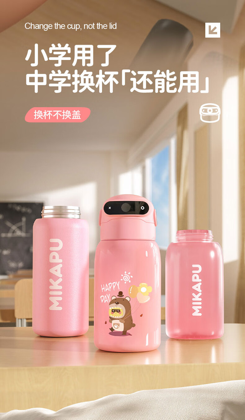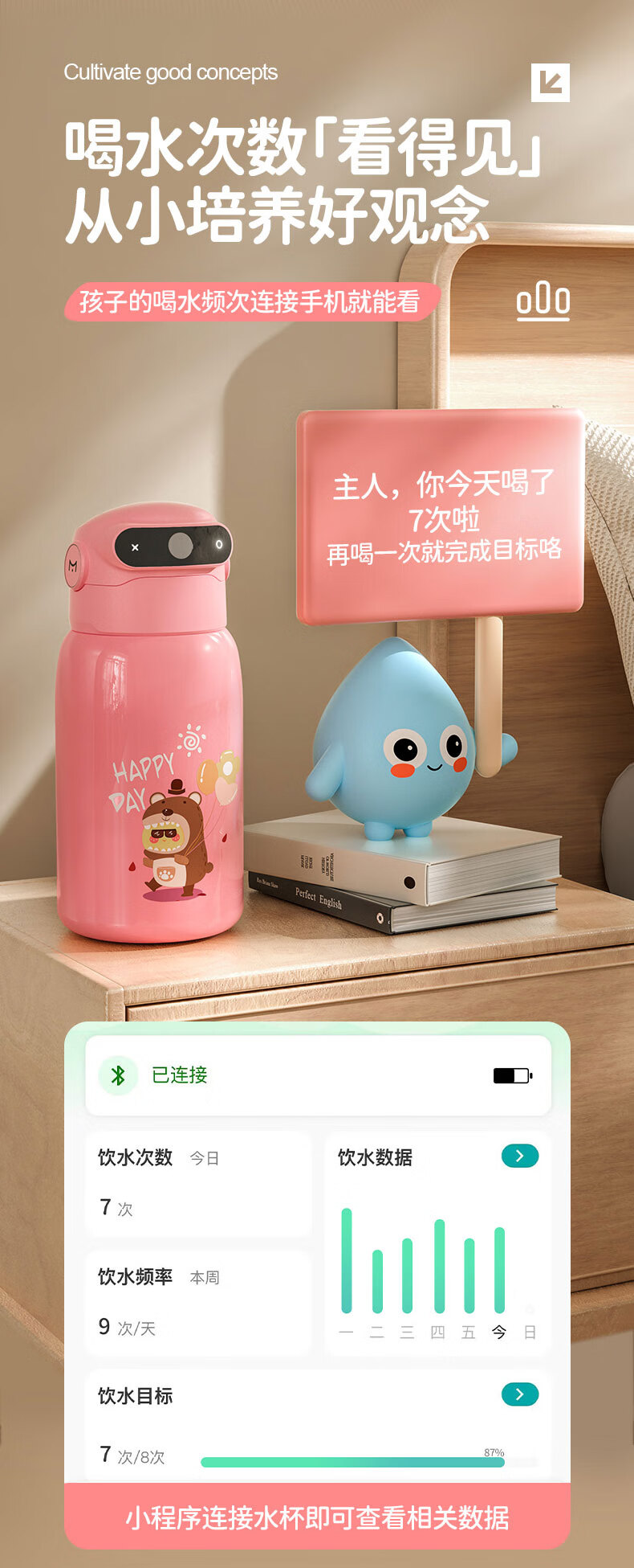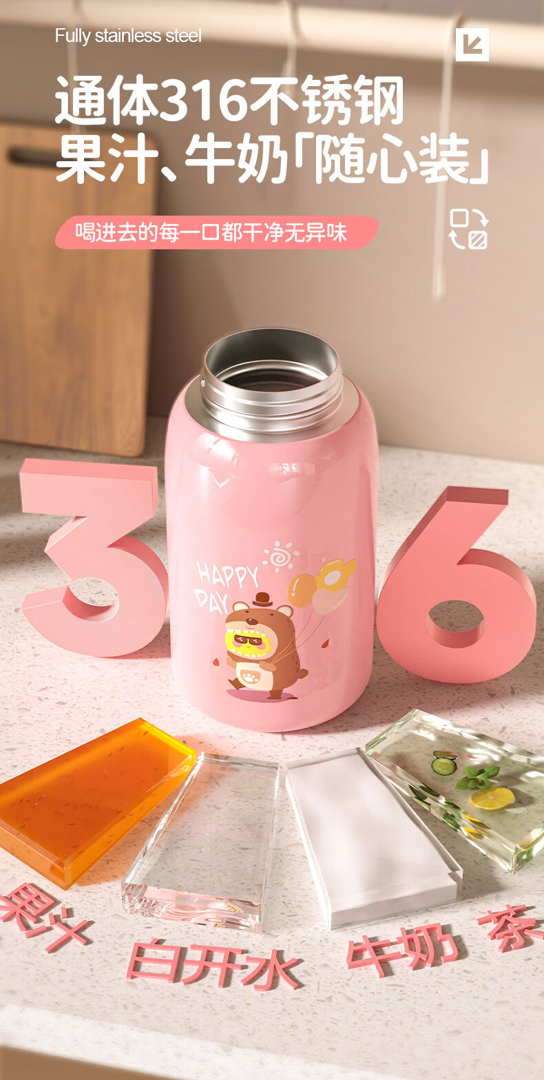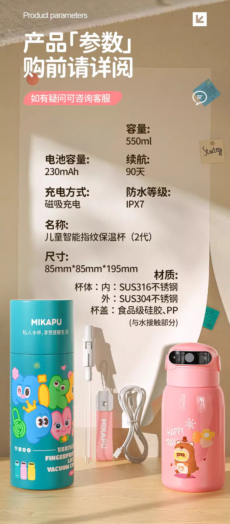 指纹解锁保温杯儿童学生上学专用女2025新款智能密码水杯 圆气粉550ml 【智能蓝牙版+316不锈钢】