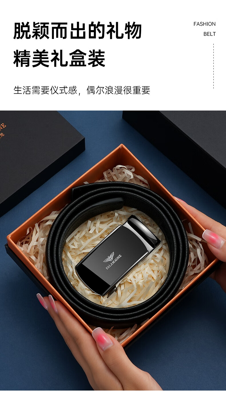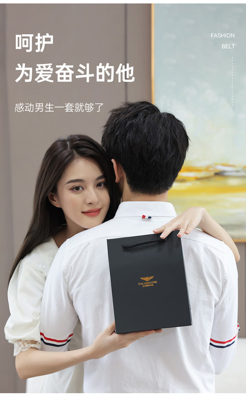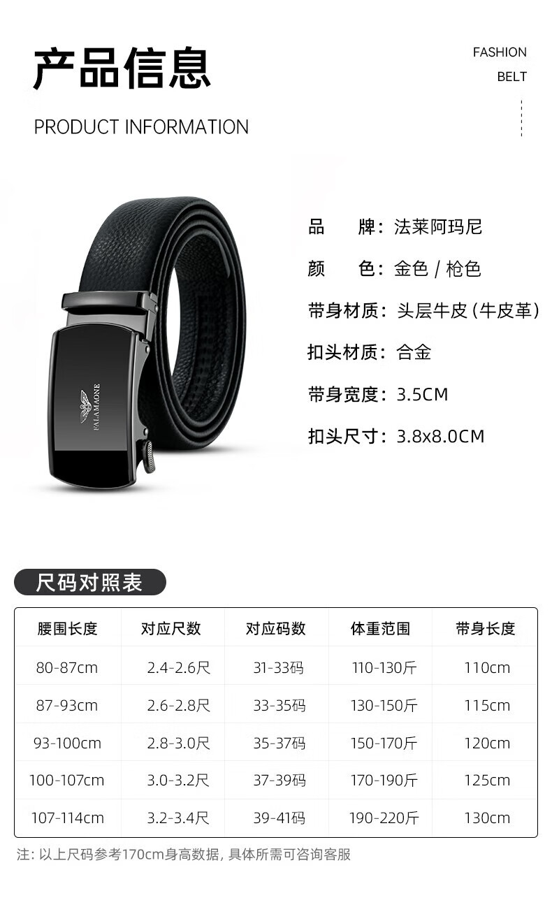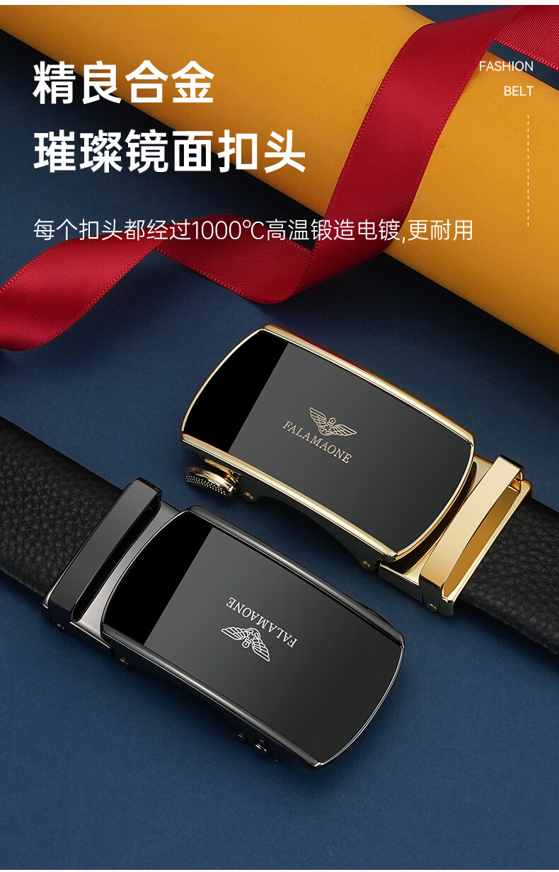 FALAMAONE法莱阿玛尼男士皮带自动扣头层牛皮腰带裤腰带生日礼物送男友老公 枪色【红色爱心礼盒】PD4565Q 110cm -130cm长度请联系客服备注