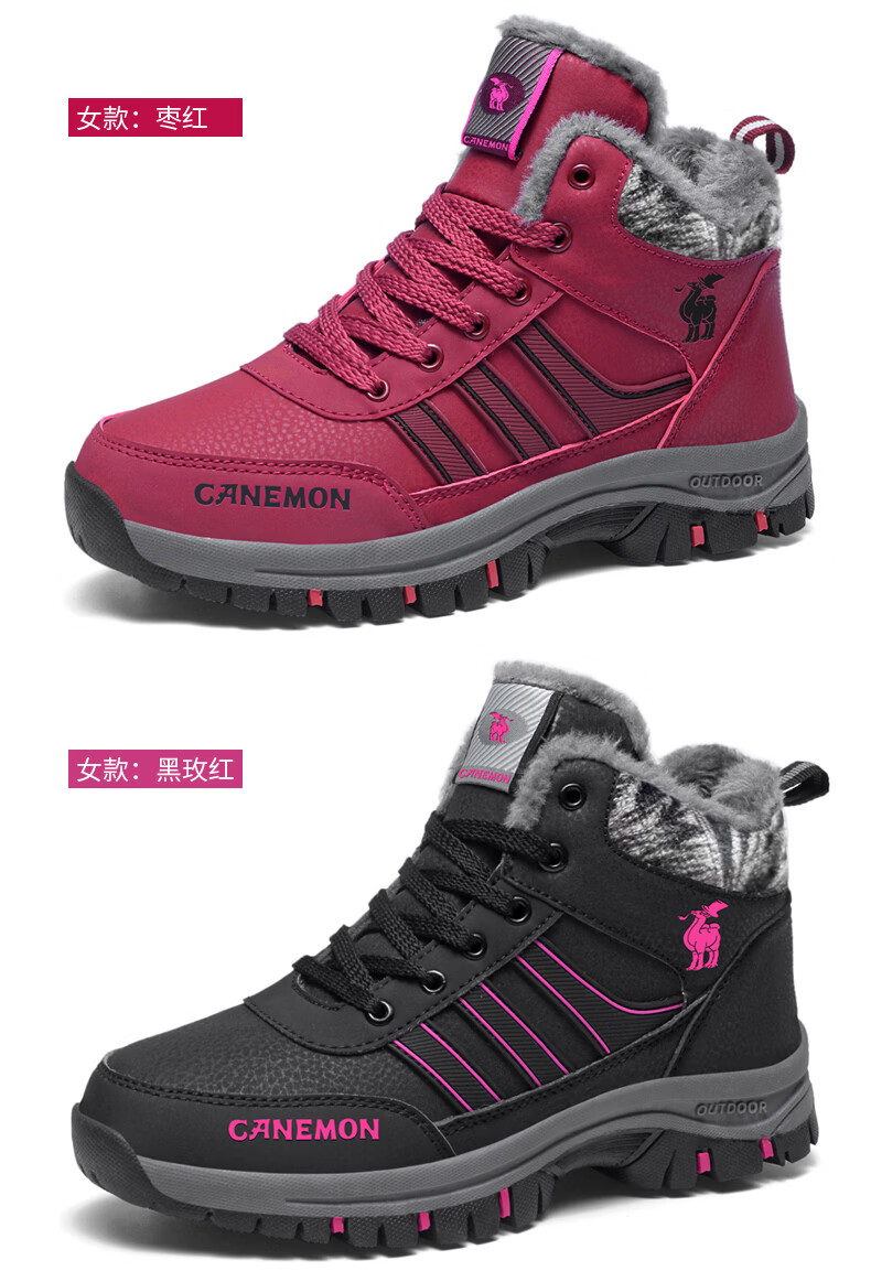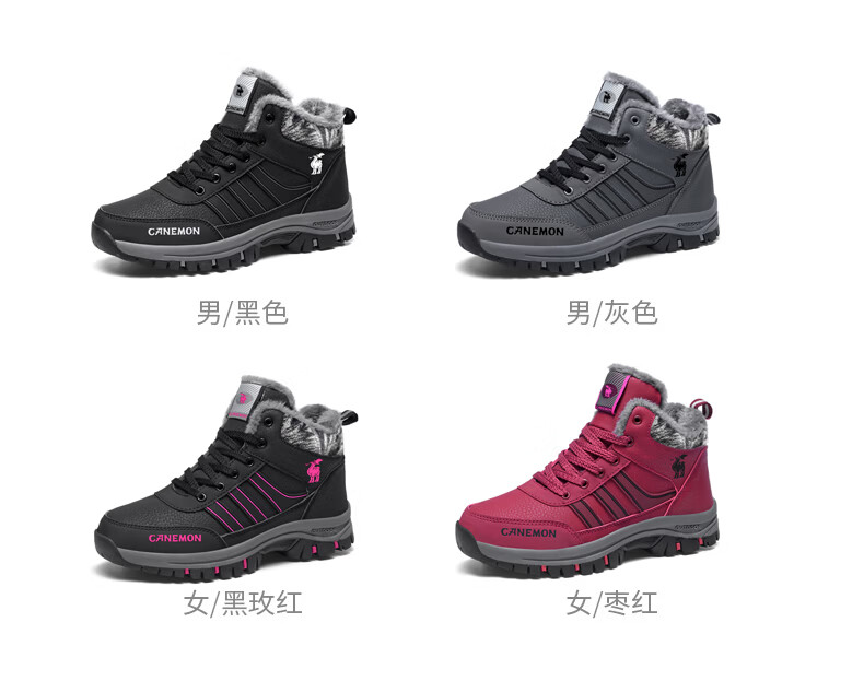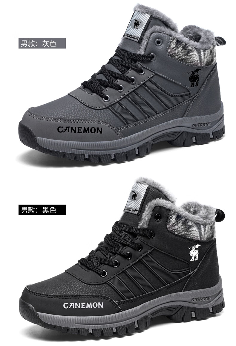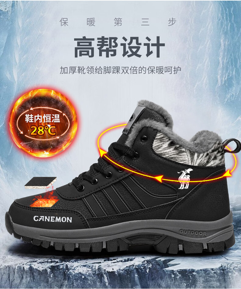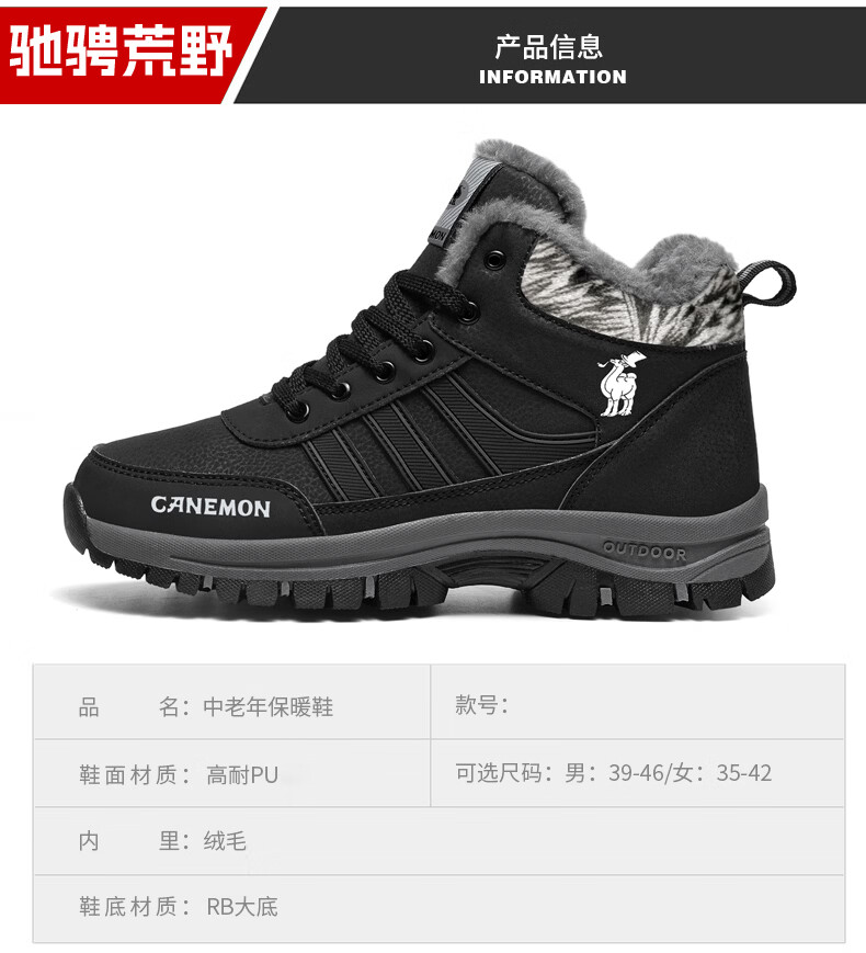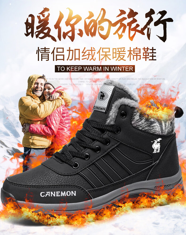 保罗骆驼保暖棉鞋 2026冬季新款加绒男女鞋 保暖防水防滑户外登山鞋 黑色男款 35 【标准运动鞋码】