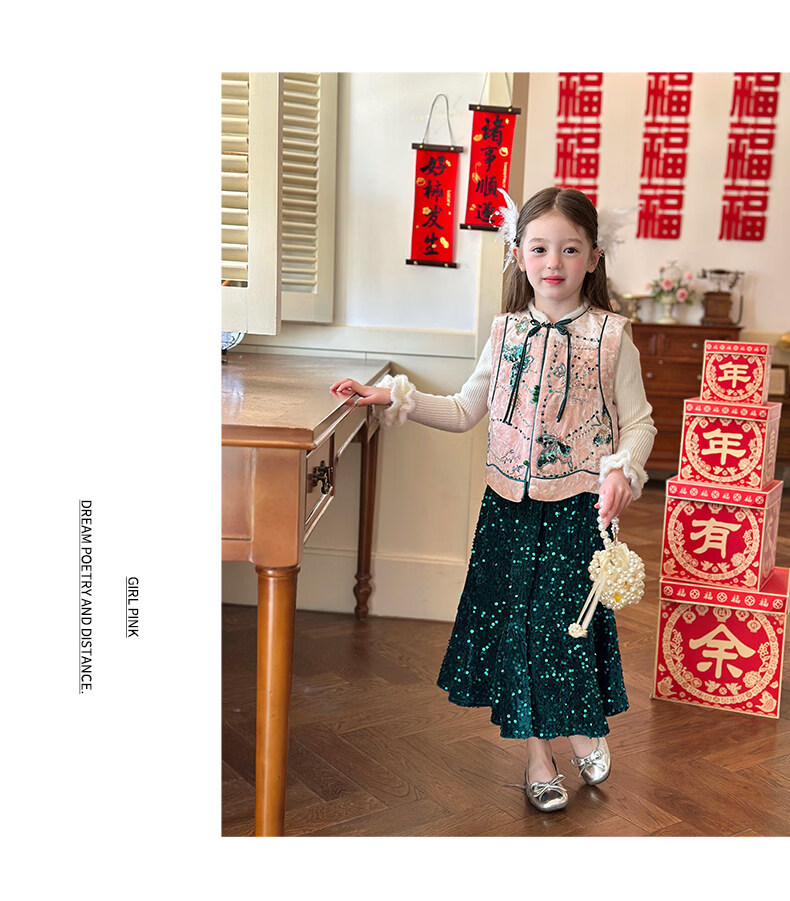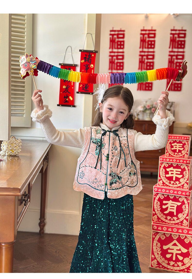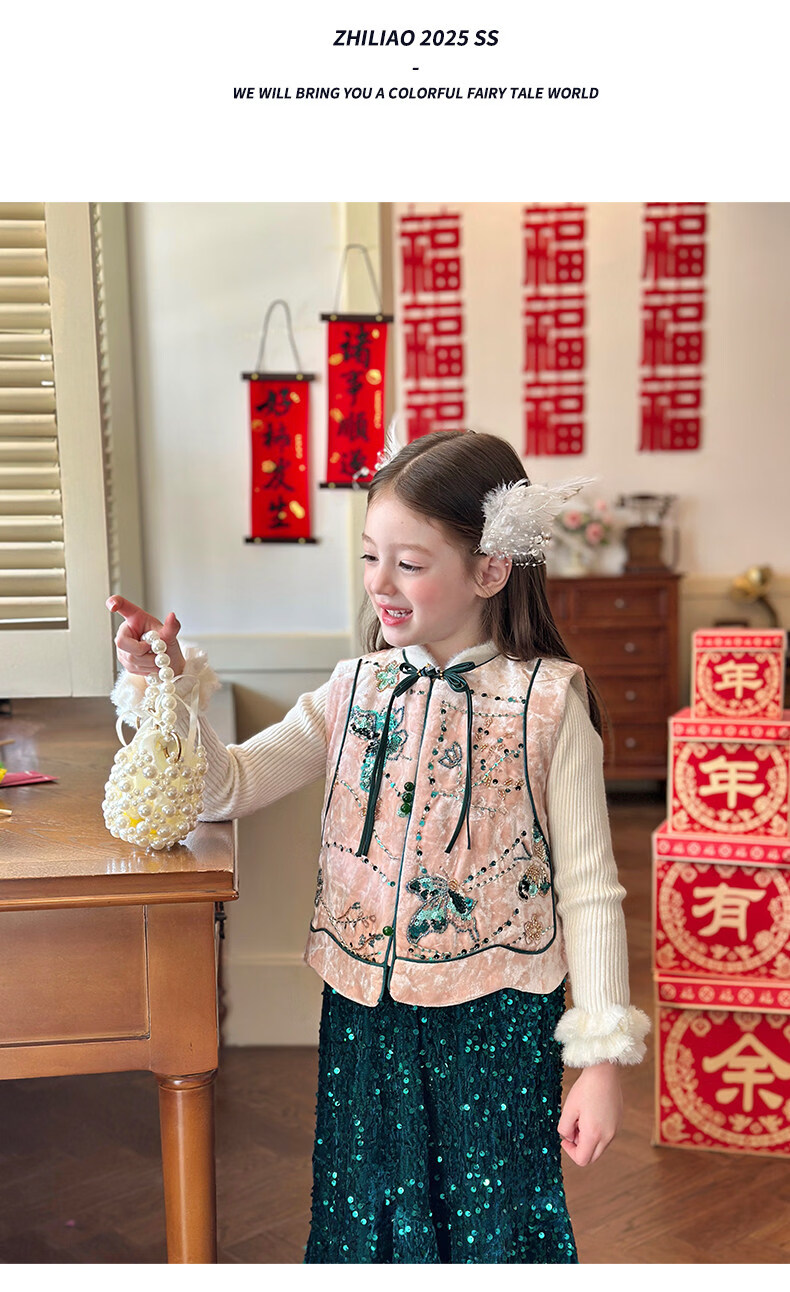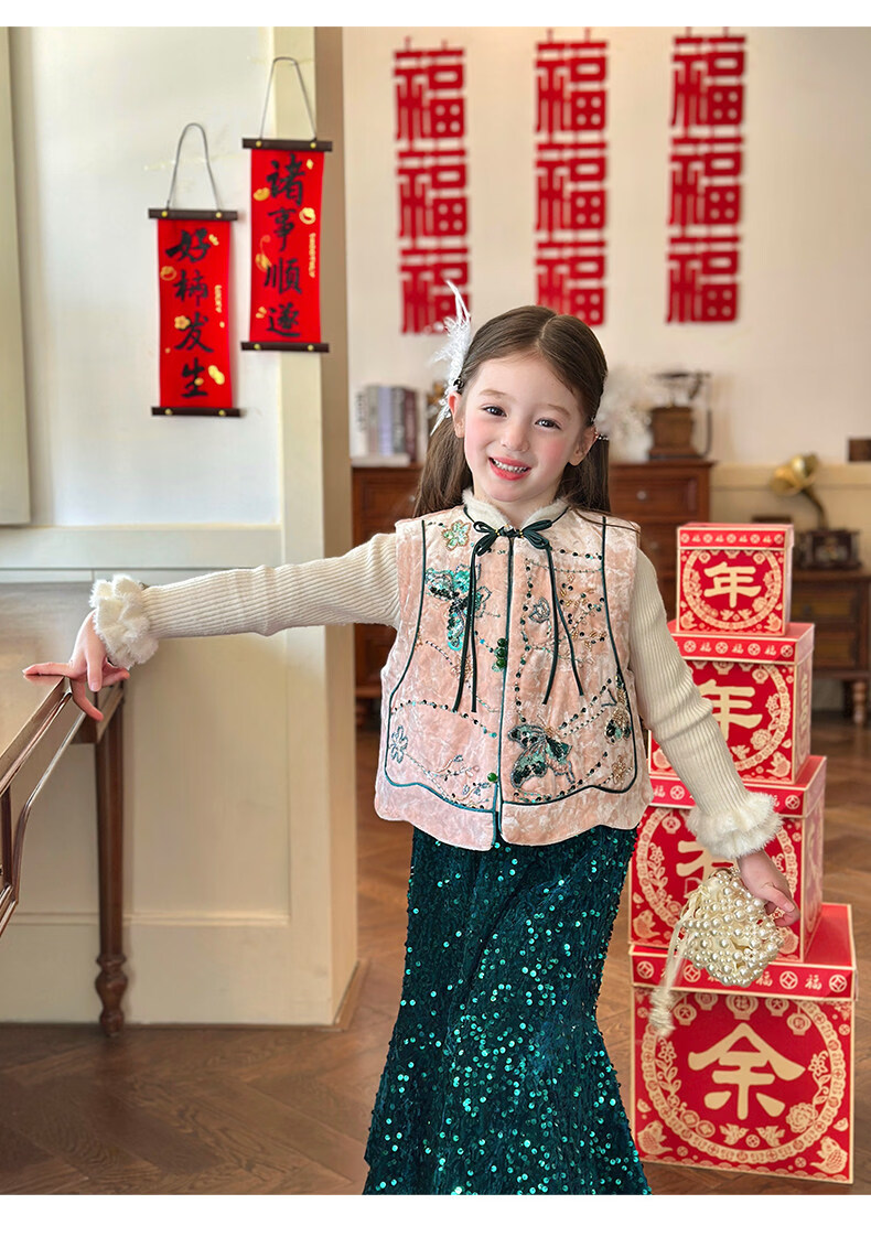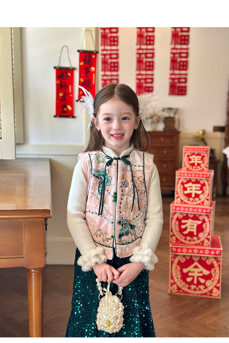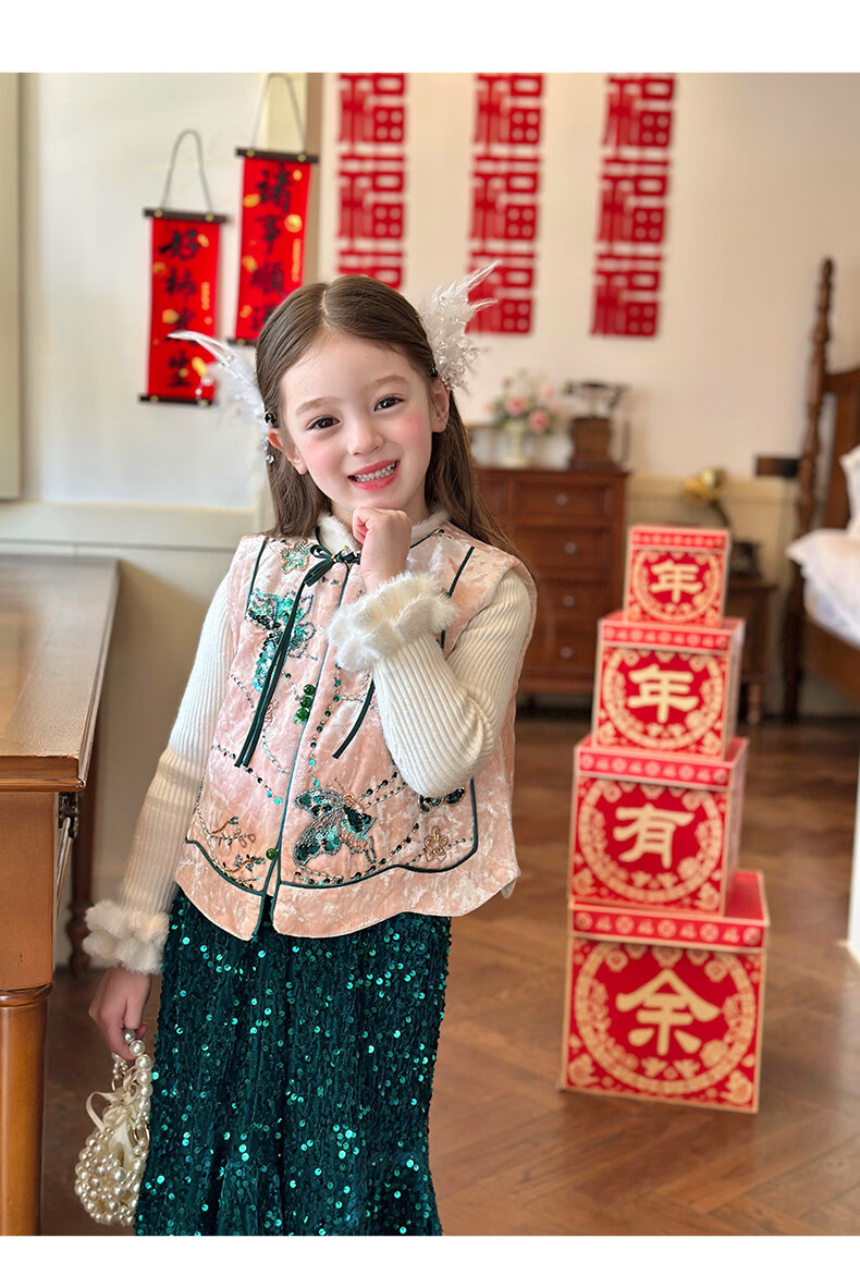 栀了成长记童装女童新中式夹棉唐装上衣2025冬季国风丝绒刺绣马甲 粉色 马甲 100