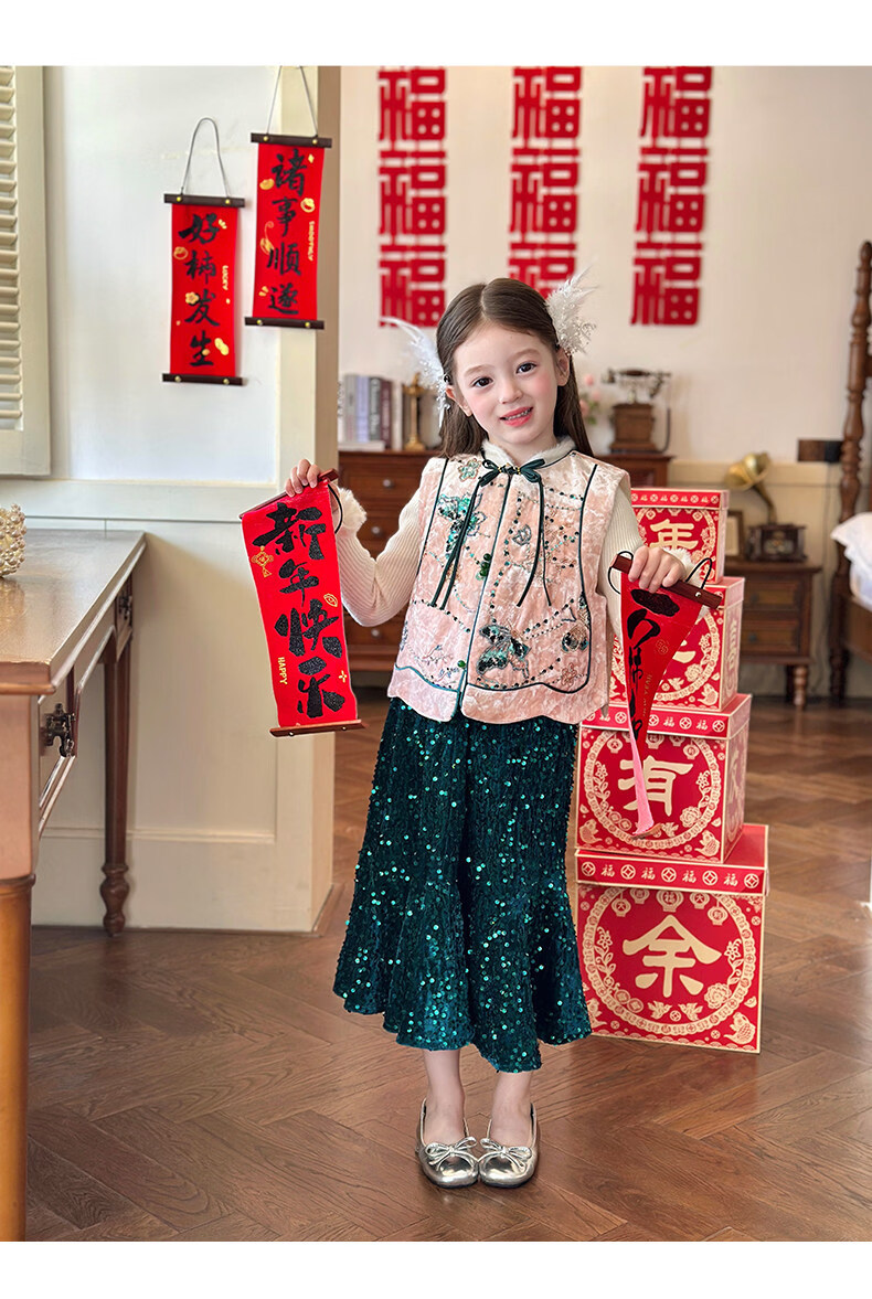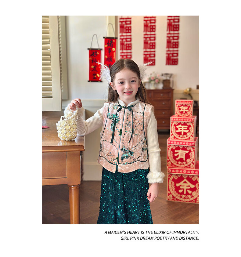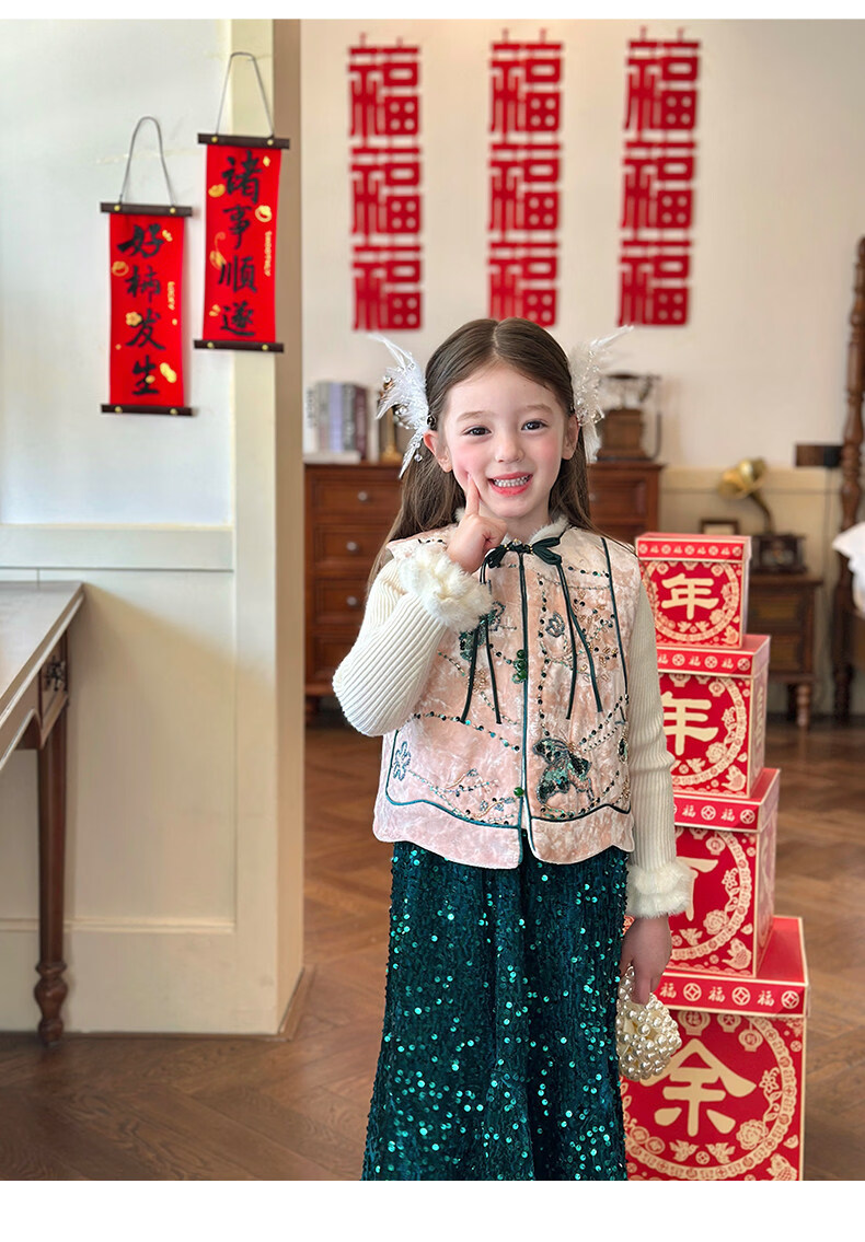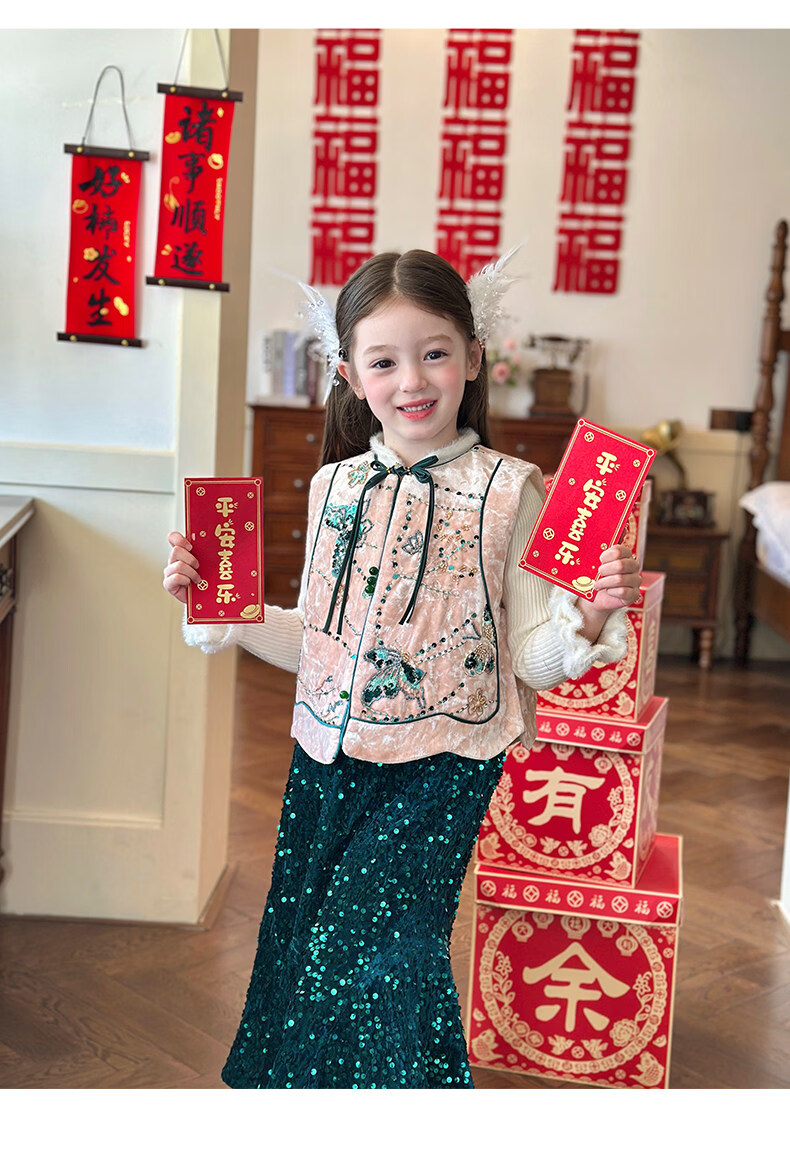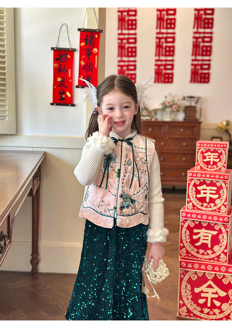 栀了成长记童装女童红色国风套装2025冬季儿童新年夹棉马甲两件套 红色 套装 100 cm