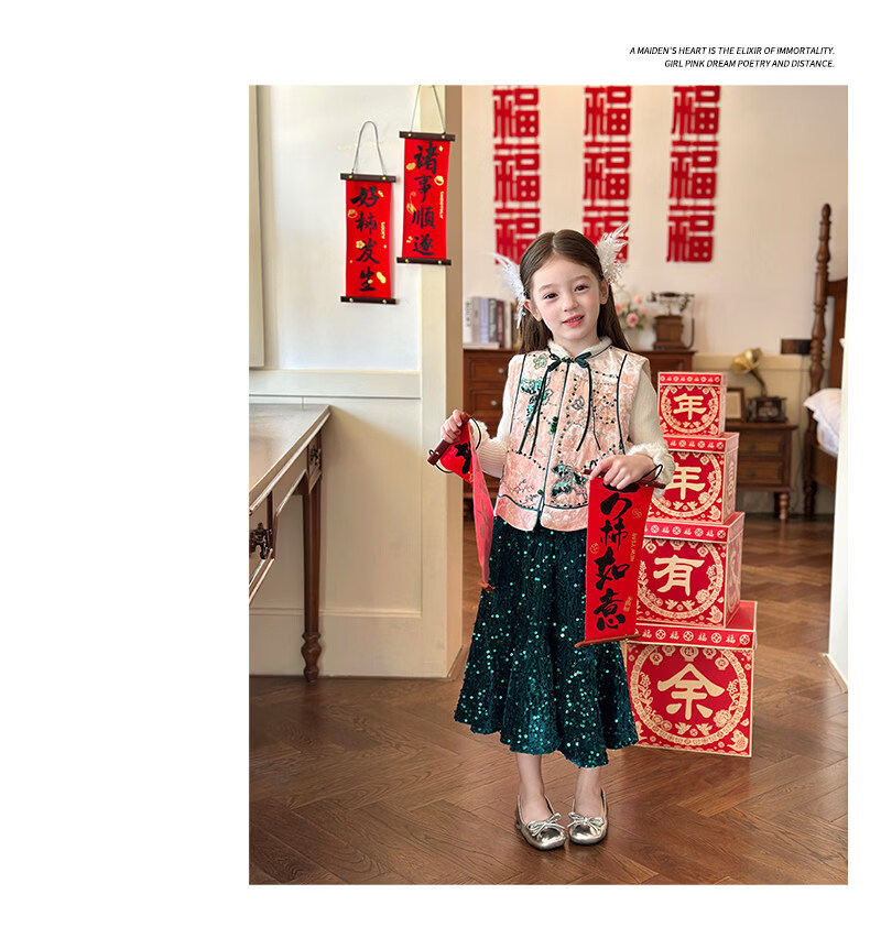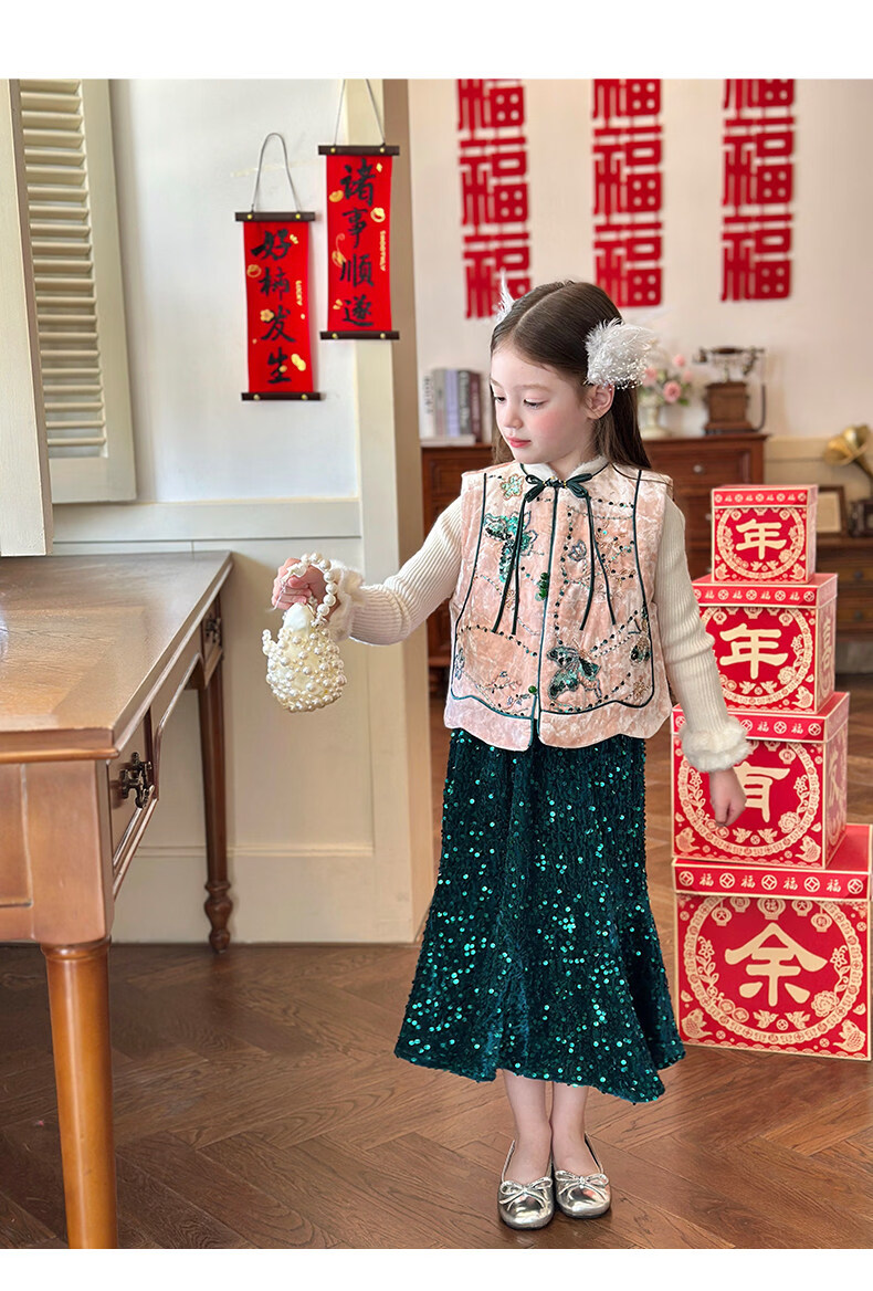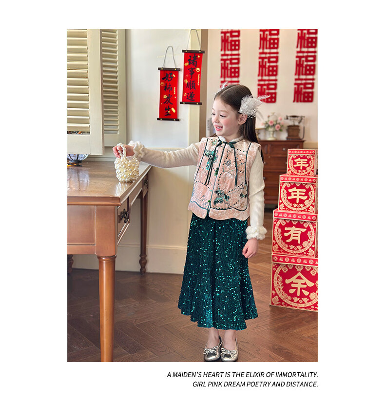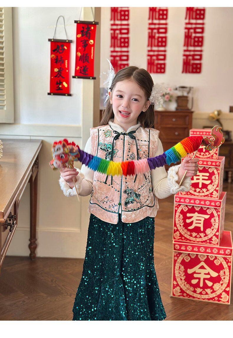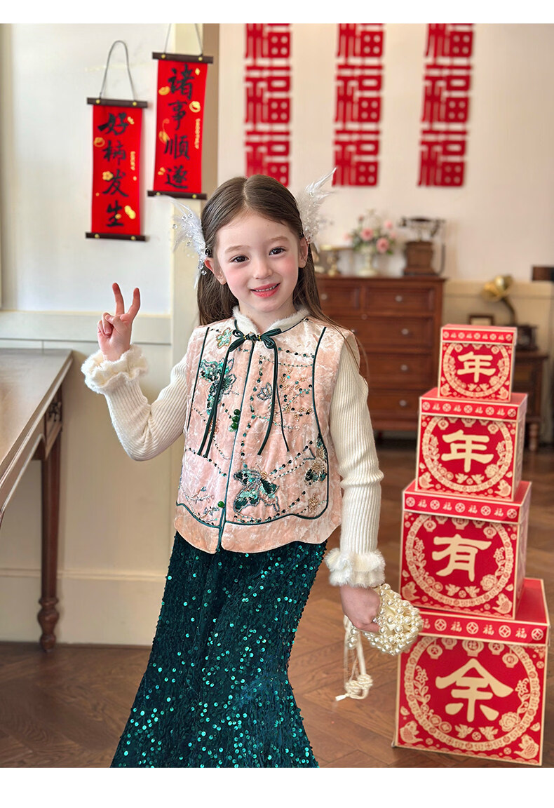 栀了成长记童装女童红色国风套装2025冬季儿童新年夹棉马甲两件套 红色 套装 100 cm