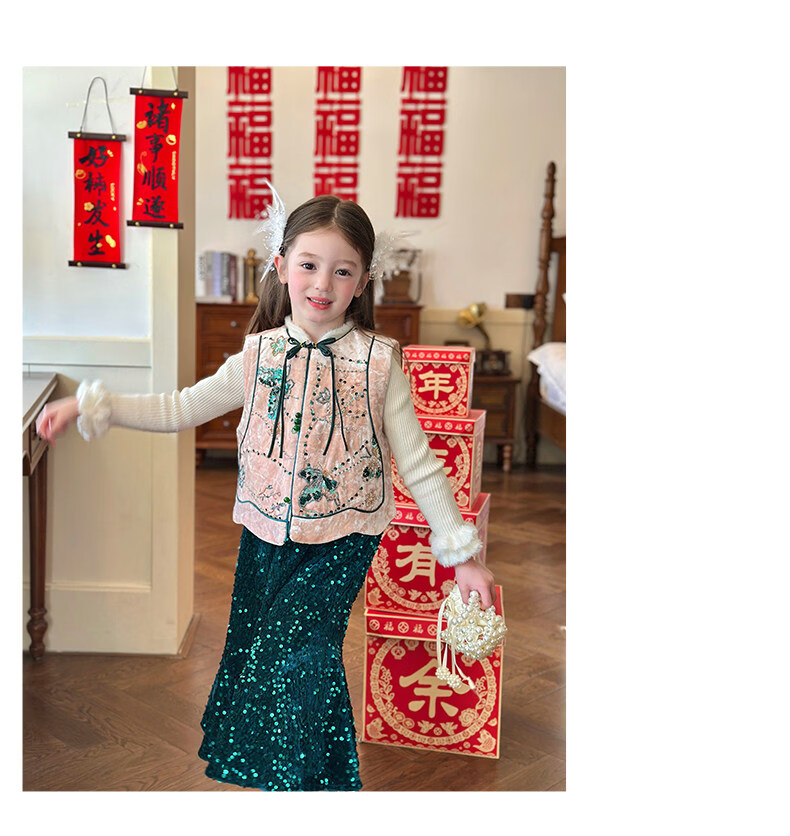 栀了成长记童装女童红色可爱亮片套装2025冬季儿童新年加绒两件套 红色 套装 100 cm