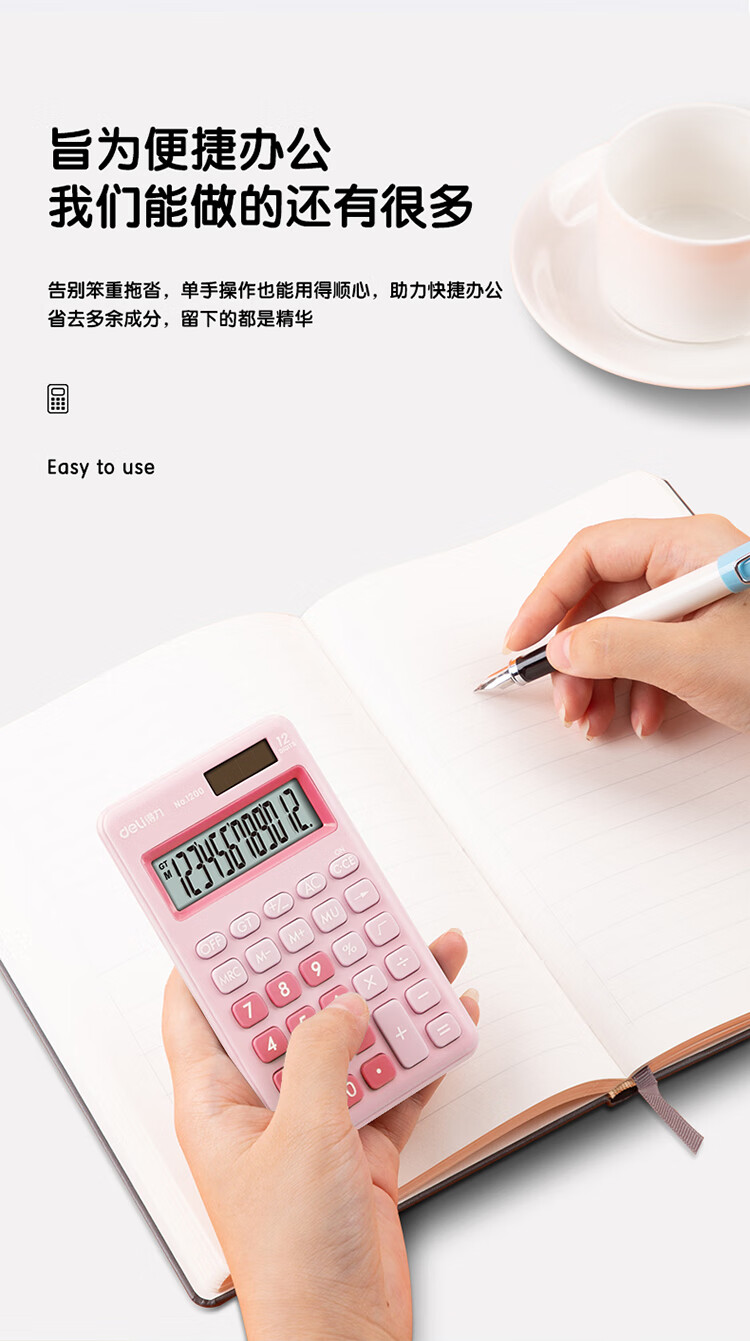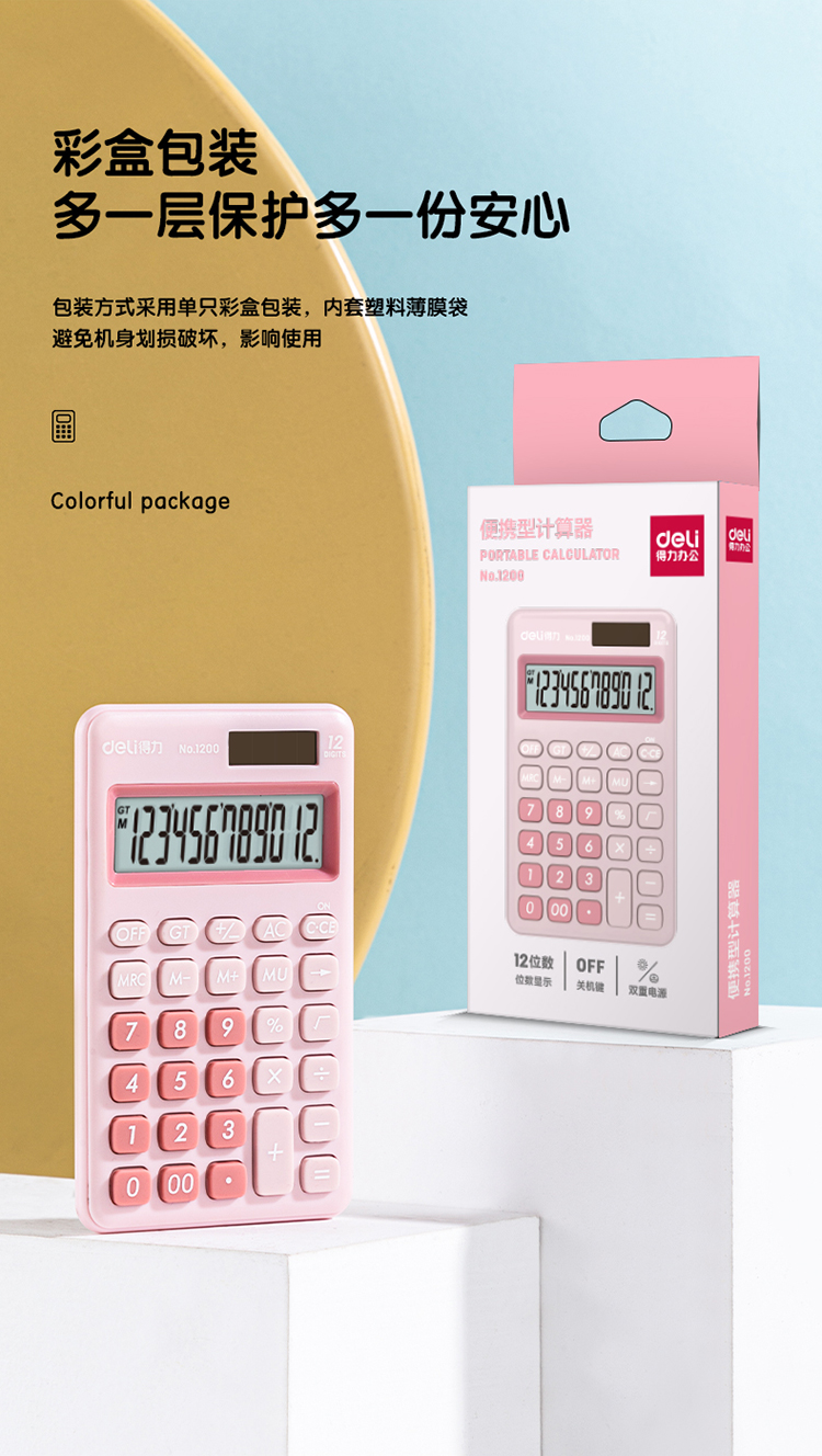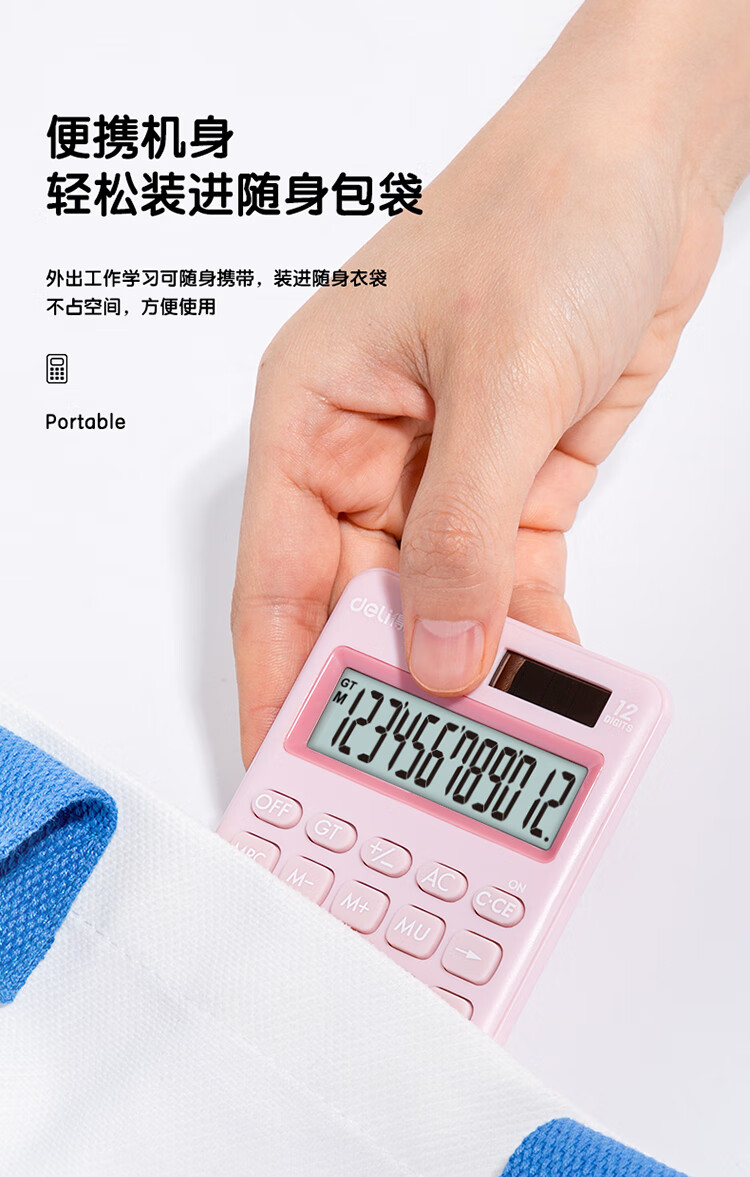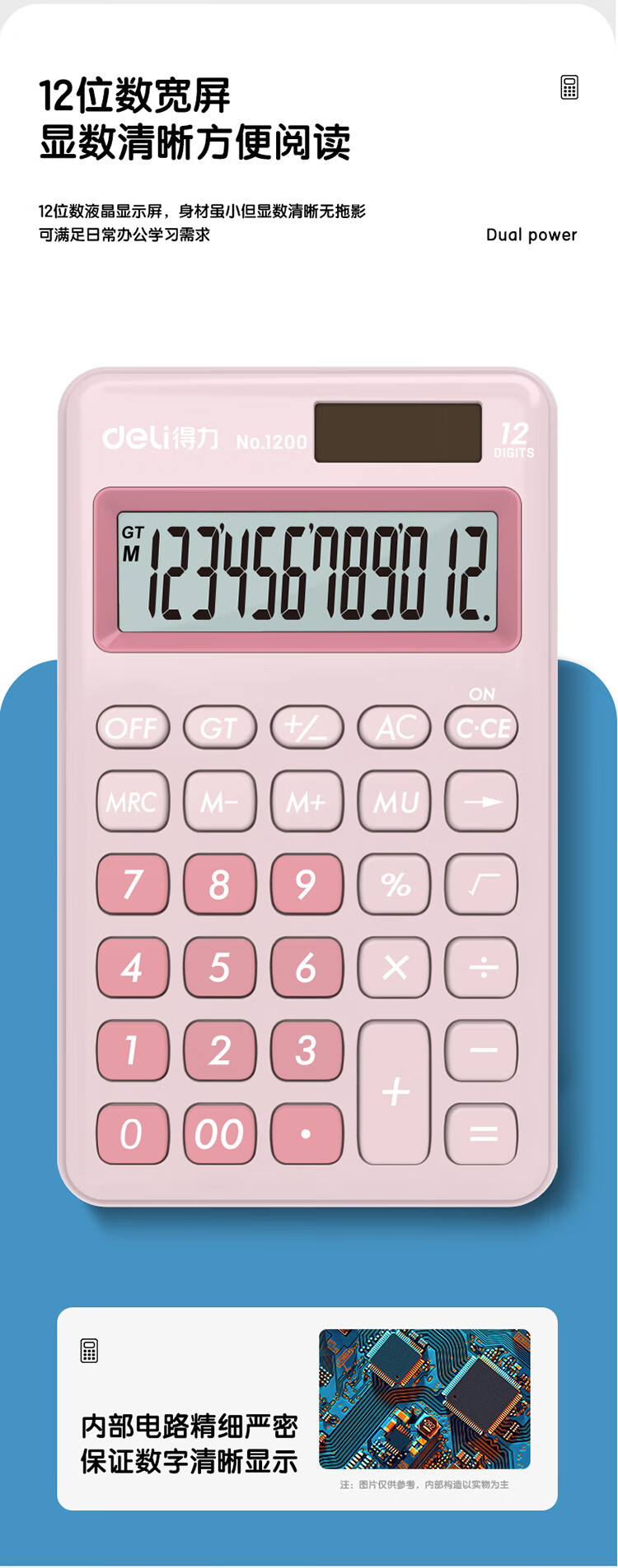 得力(deli)双电源便携时尚计算器 轻薄机身硅胶按键 学生四年级可爱桌面计算机 学习用品 浅红1200
