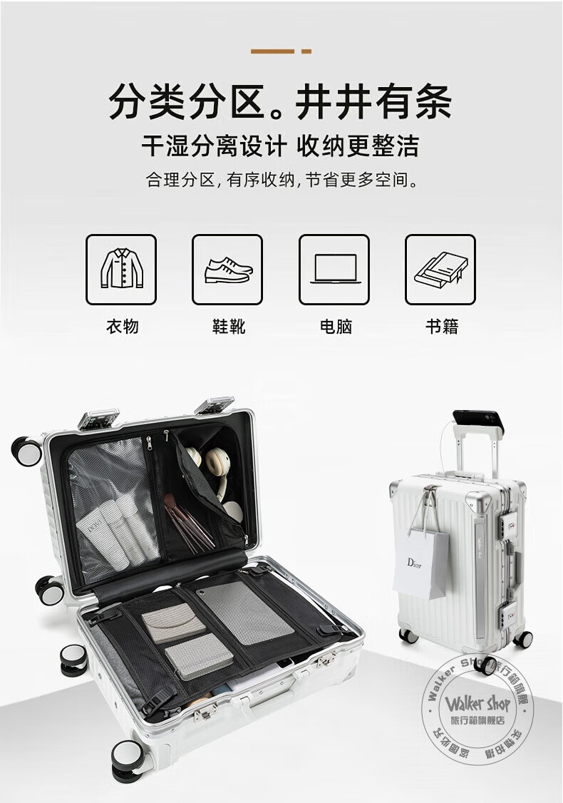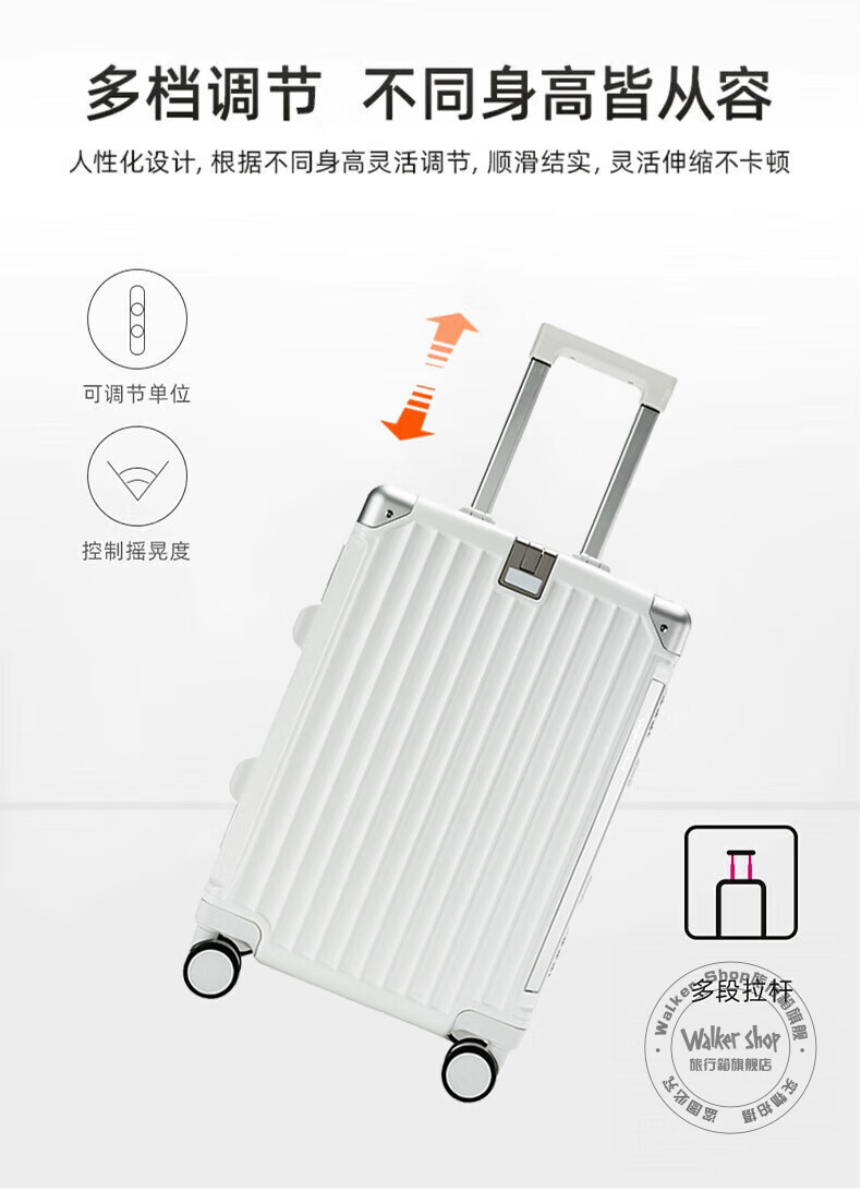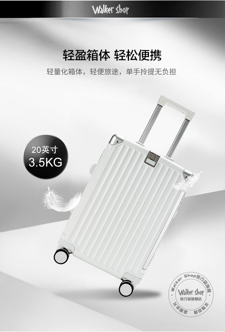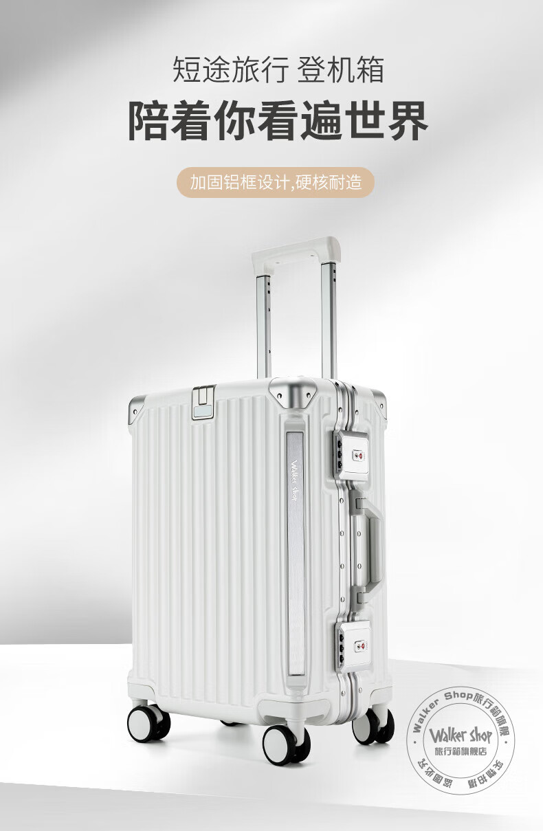 Walker Shop轻奢品牌行李箱男多功能大容量出差登机旅行箱女PC铝框防撞拉杆箱 白色【杯架+手机支架+USB口】 26英寸 【需托运】