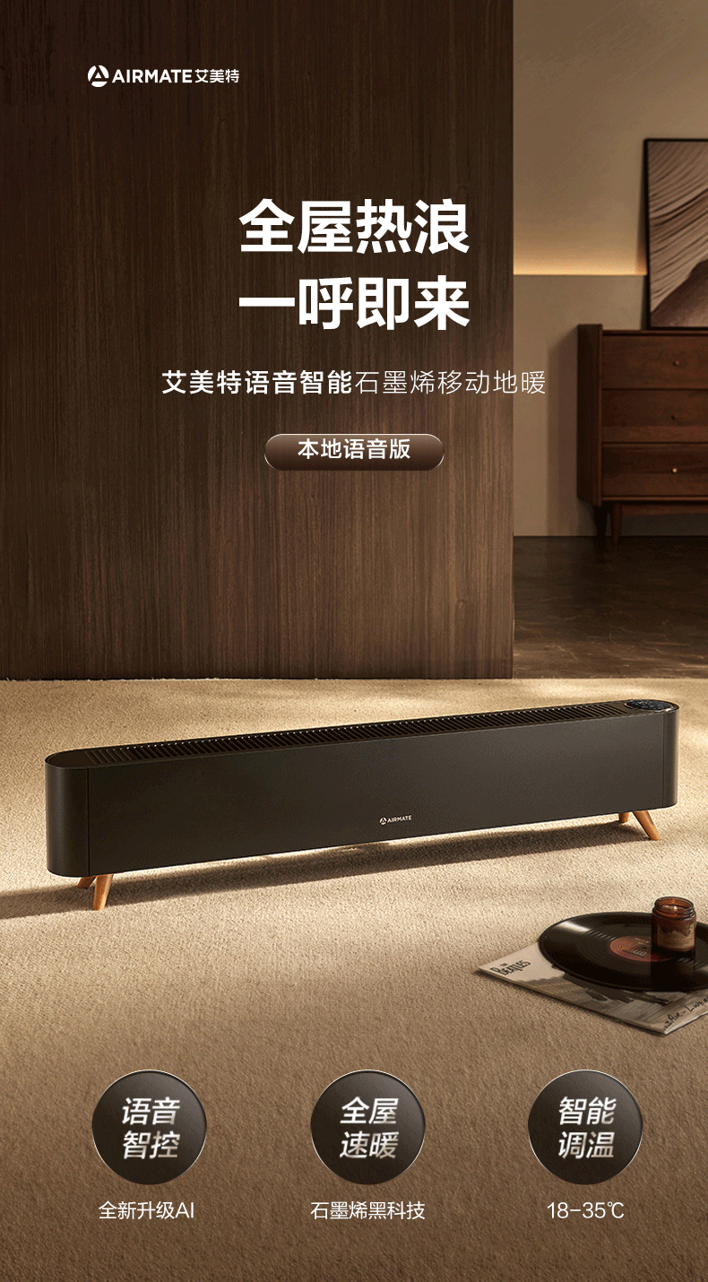 艾美特(AIRMATE)【热销爆款】石墨烯踢脚线/电热取暖器/暖风机/电暖器/电暖气片 家用大面积防水温控移动地暖 R40