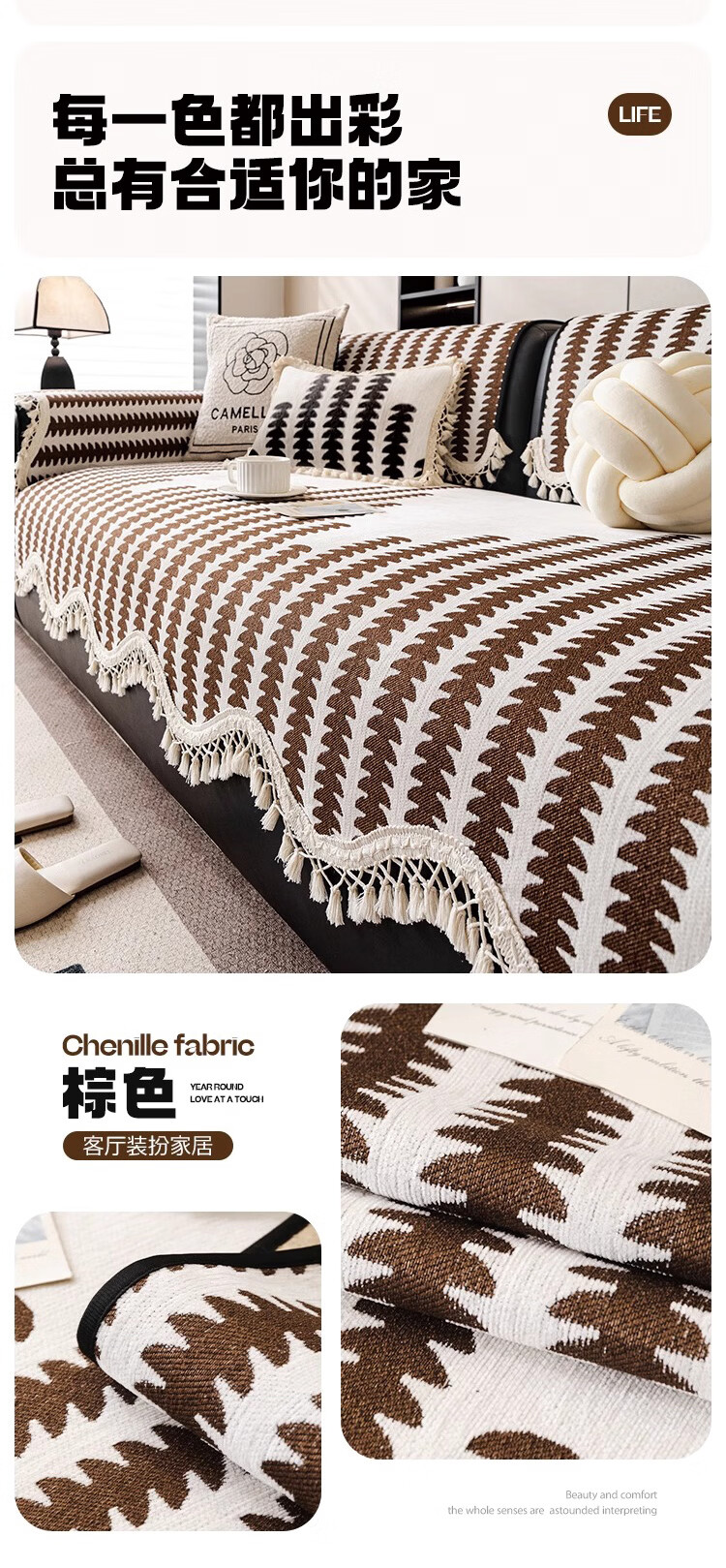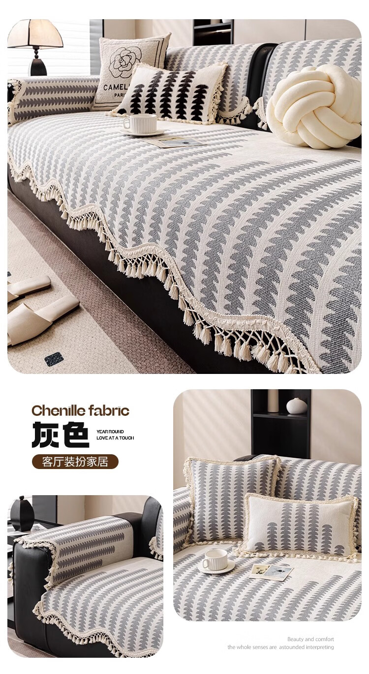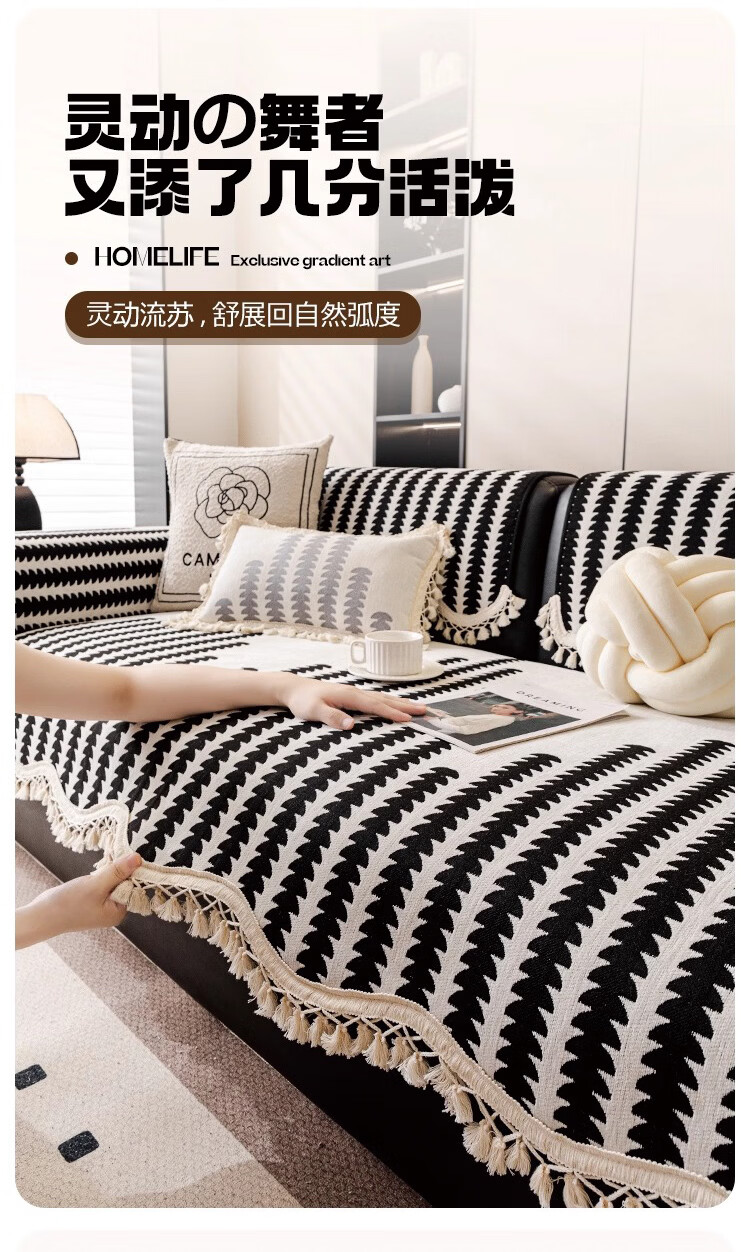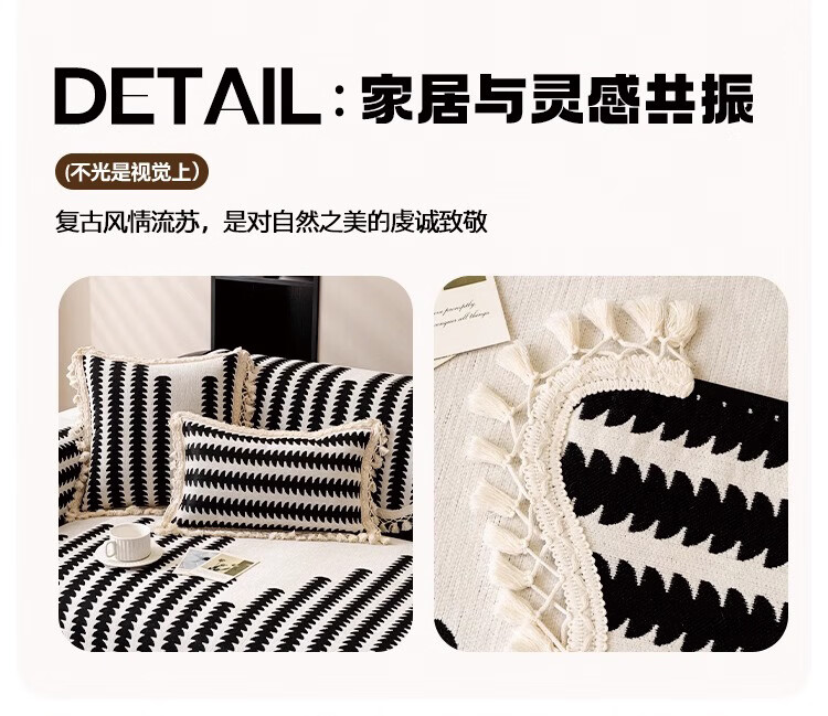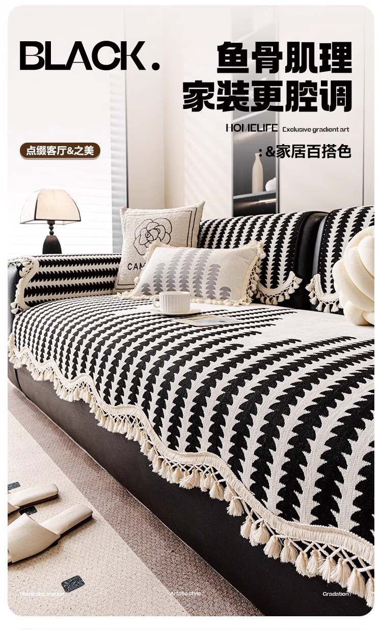 金拾美月复古雪尼尔沙发垫四季通用2026新款高级感直排防滑坐垫套盖布巾 流苏古川-黑色 70cm*70cm