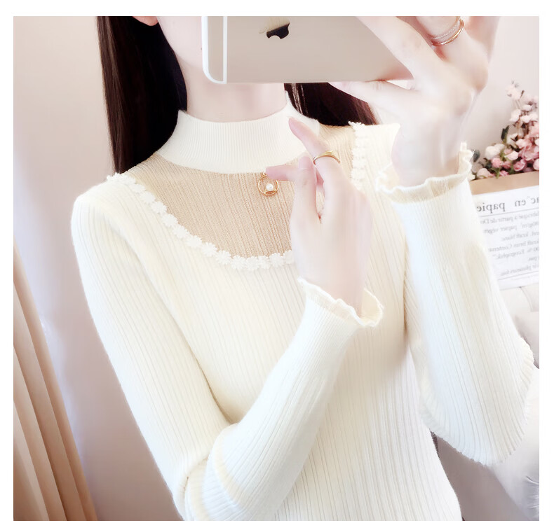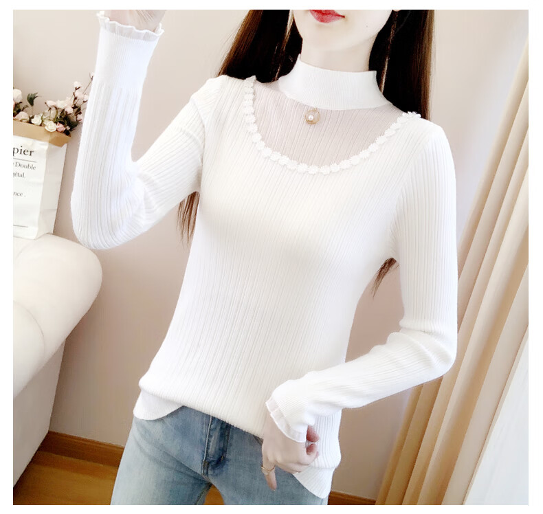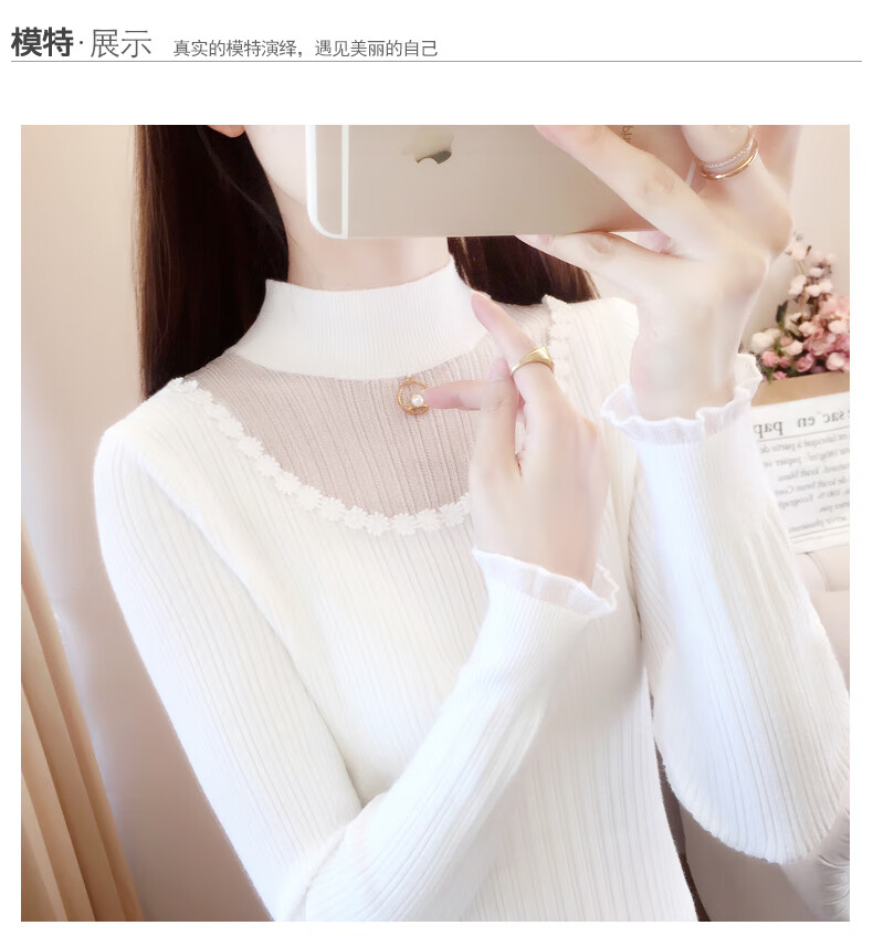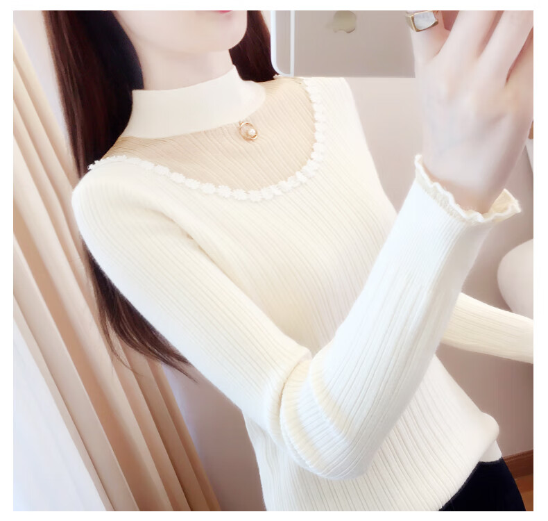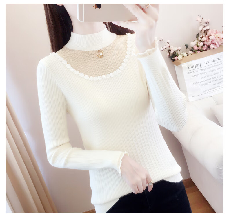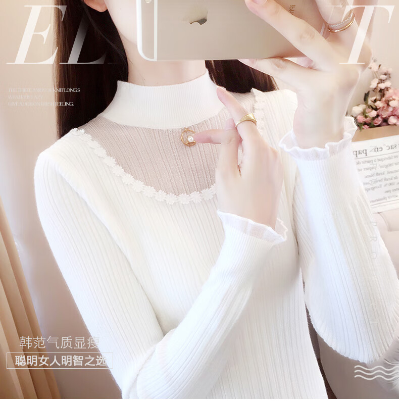 香影纯半高领镂空毛衣打底衫女内搭2025新款春秋短款长袖修身针织衫上衣 白色 L (建议105-115斤)