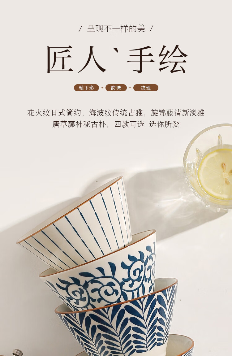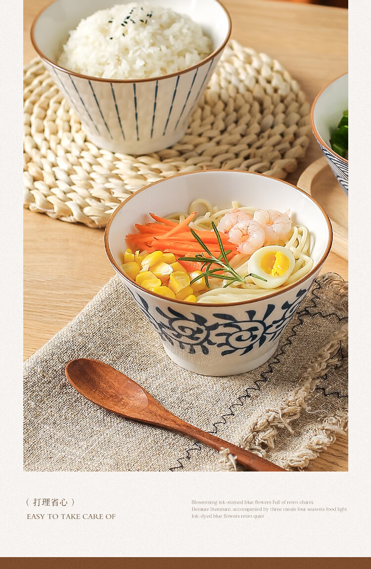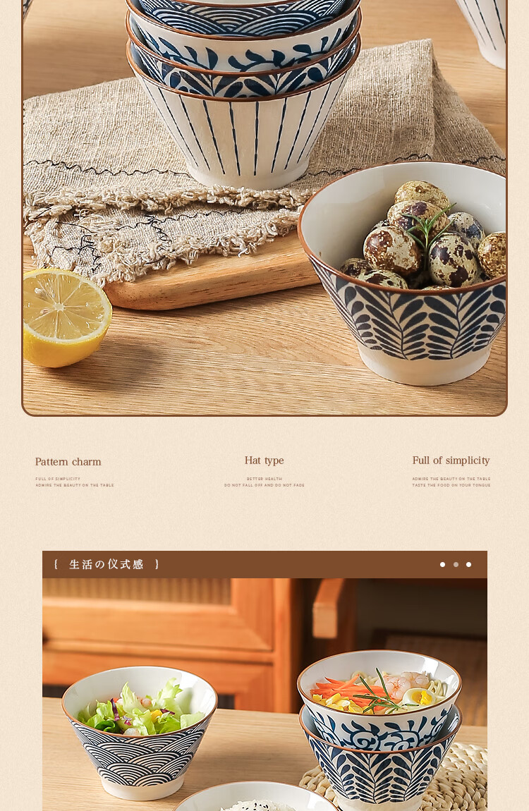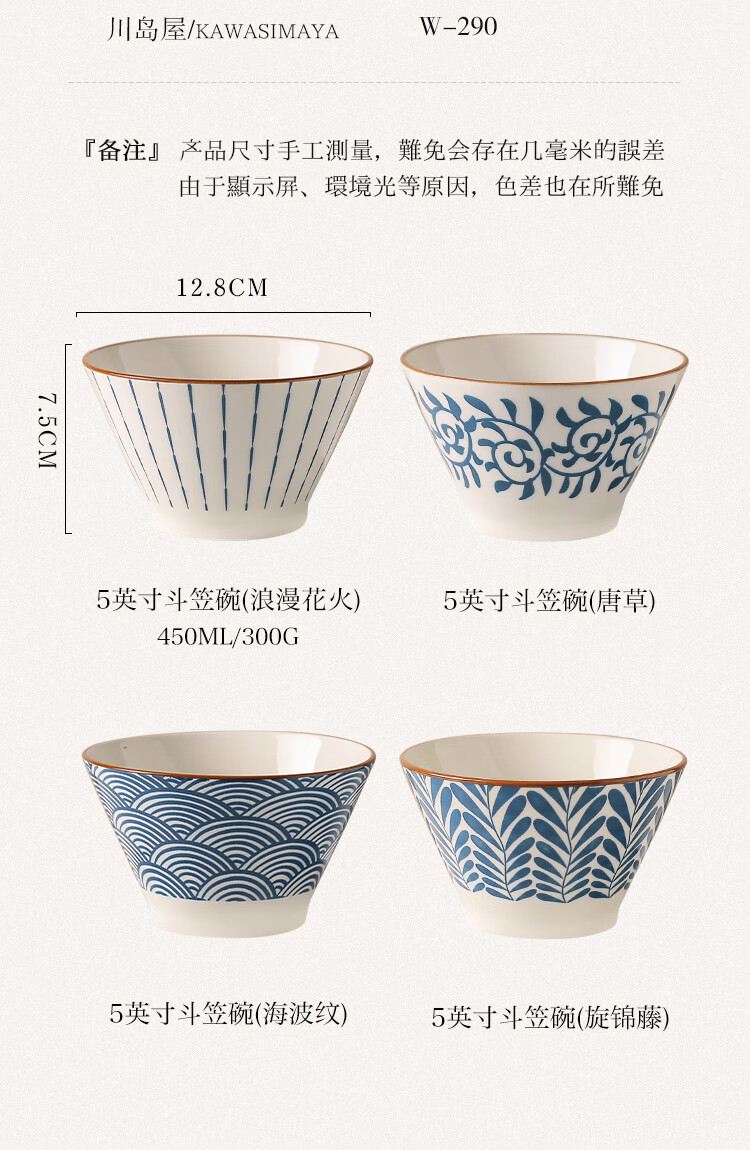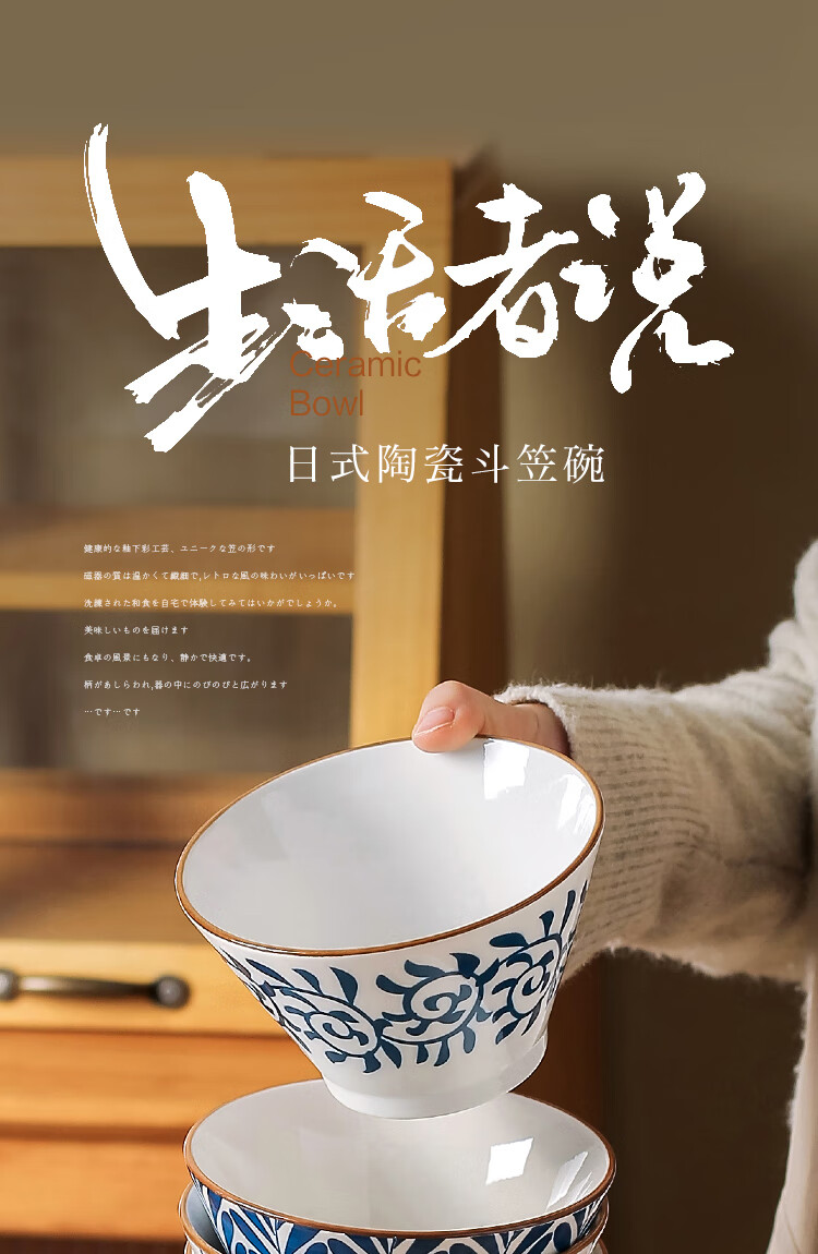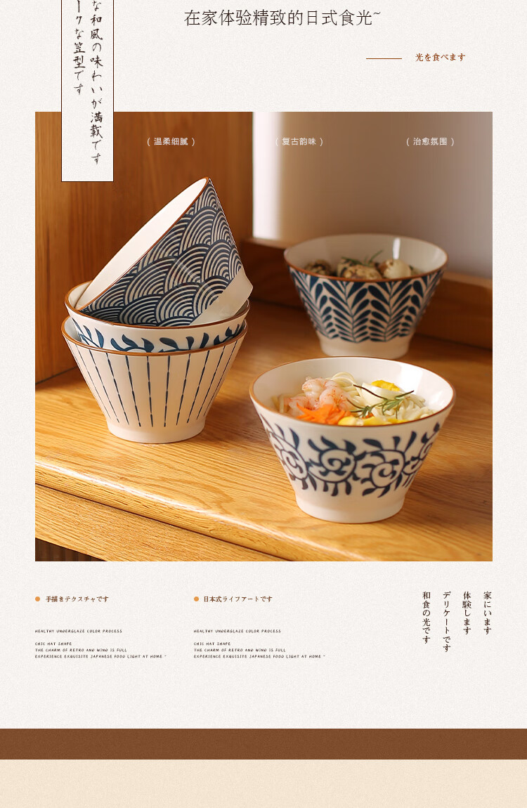 几物森林复古风5英寸斗笠碗家用创意高脚釉下彩日式陶瓷餐具饭碗面碗小碗 唐草5英寸斗笠碗【混色四只装】