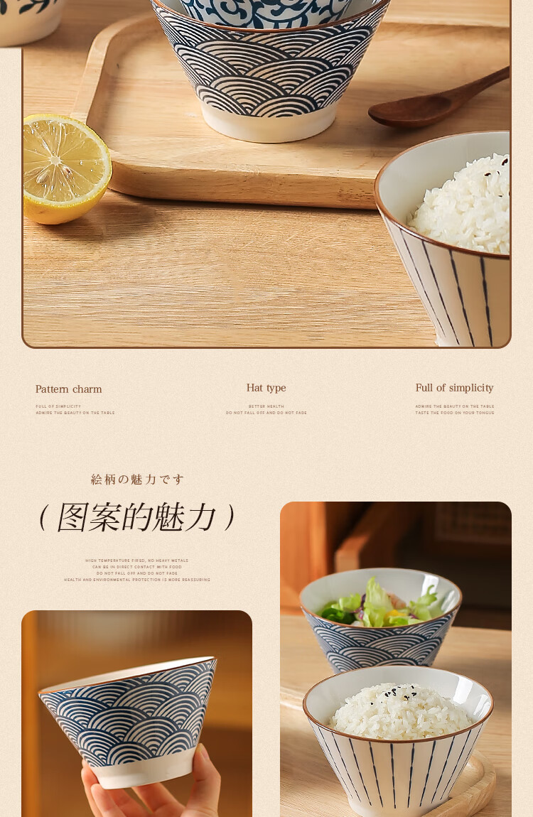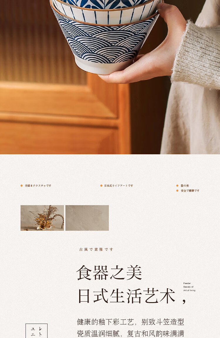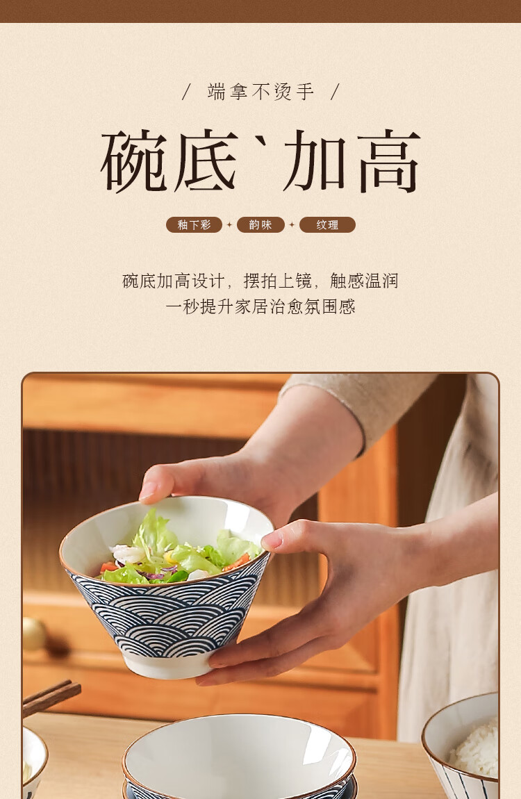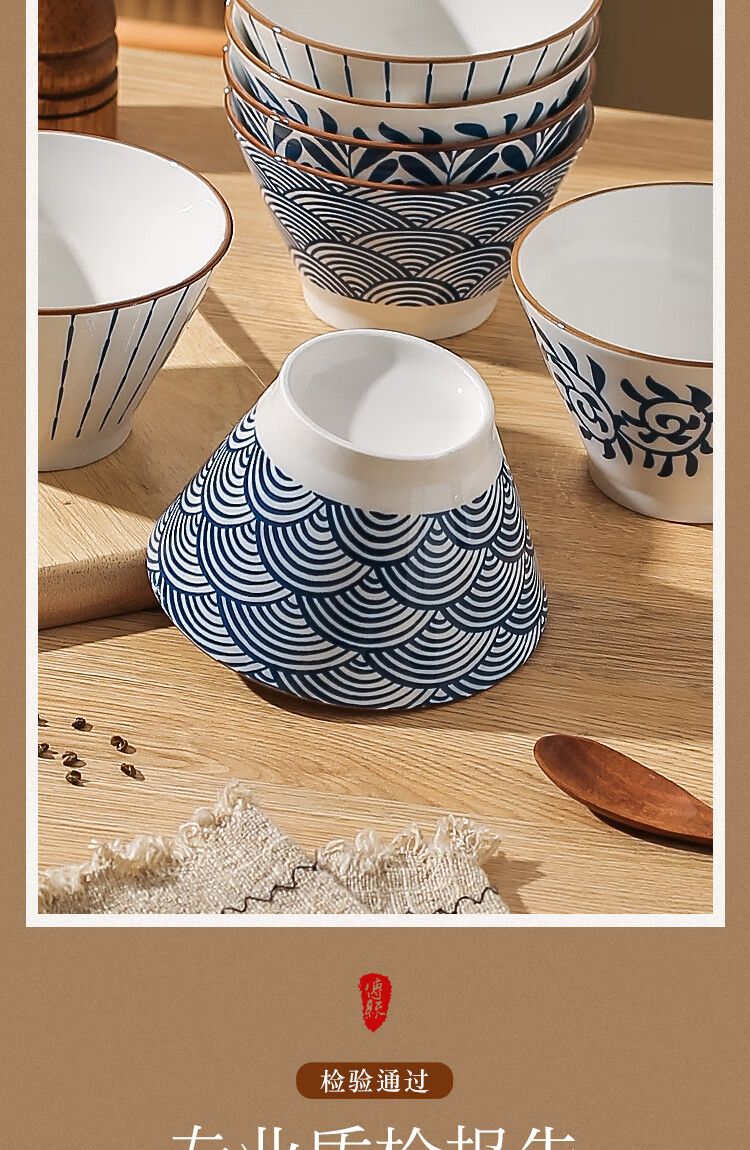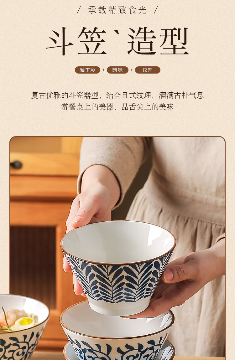 几物森林复古风5英寸斗笠碗家用创意高脚釉下彩日式陶瓷餐具饭碗面碗小碗 唐草5英寸斗笠碗【混色四只装】