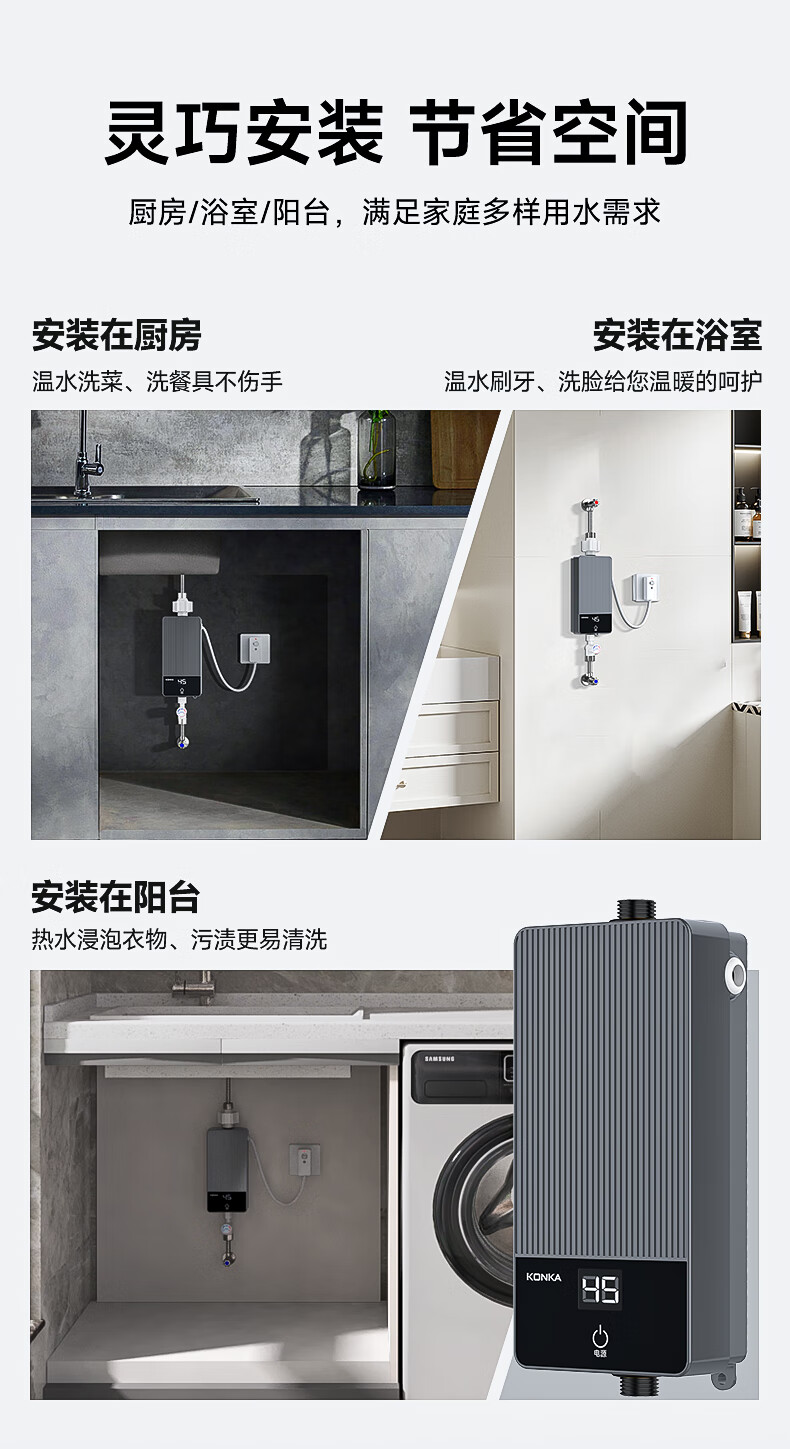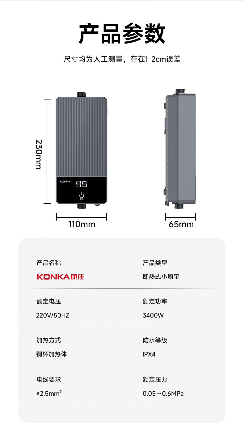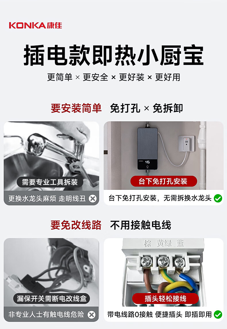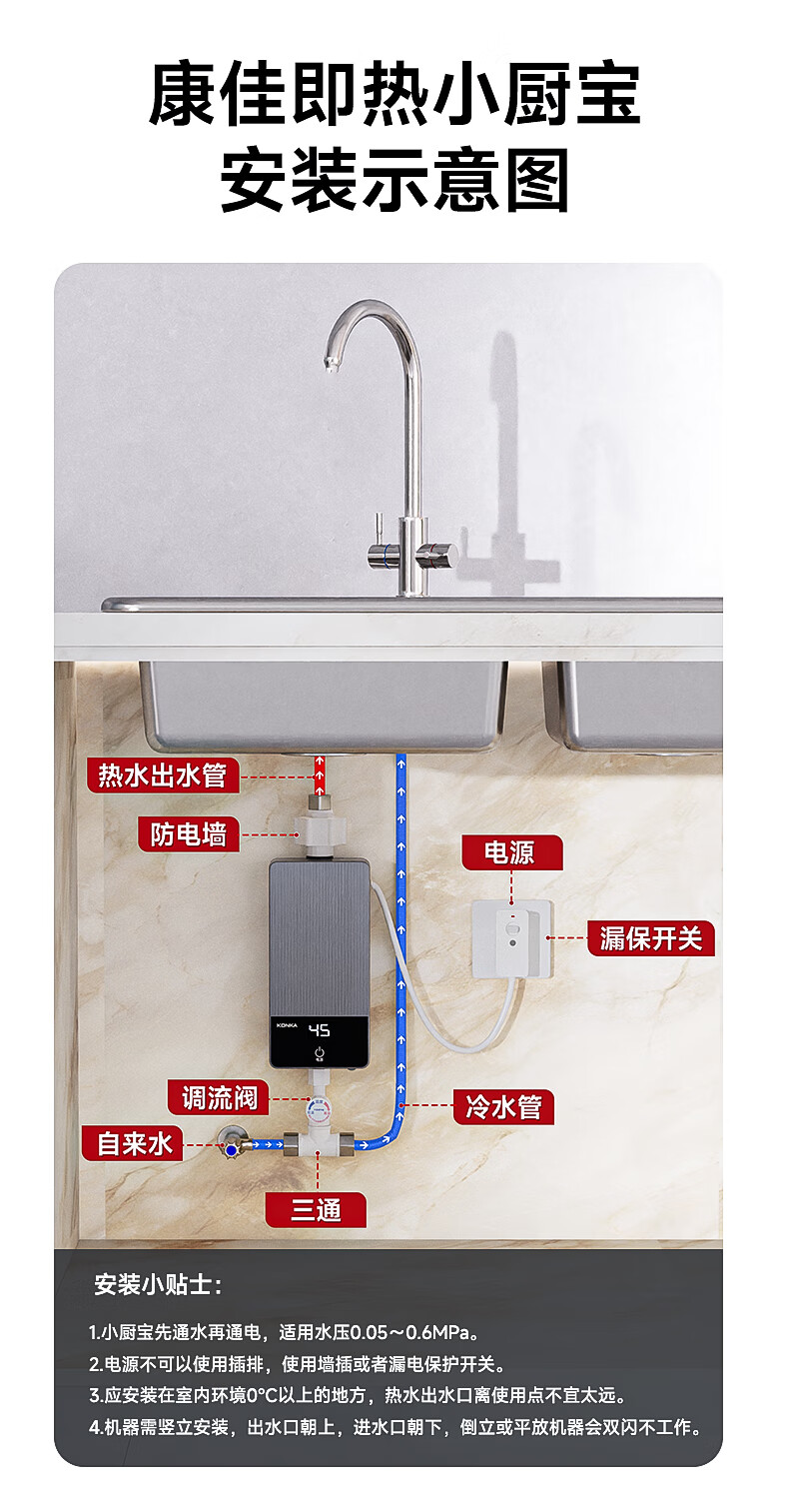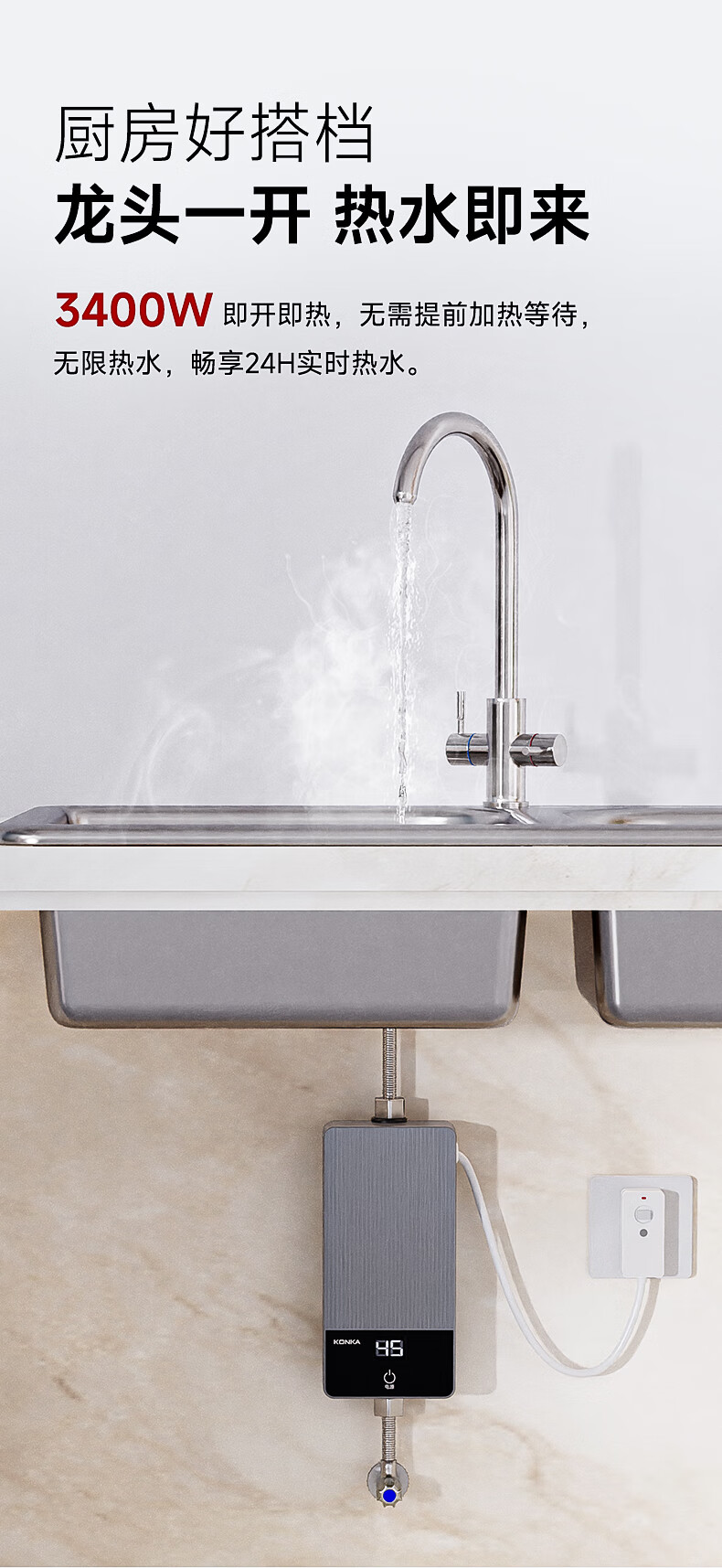 康佳(KONKA)即热式小厨宝 3400W免打孔家用厨房面盆 插头款电热水龙头加热宝热水器DJ34-KSDTF01