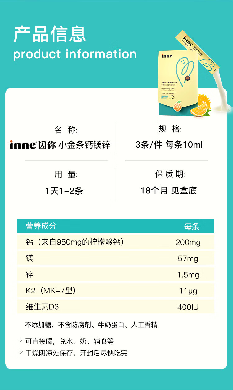 Inne因你钙镁锌小金条液体钙儿童钙维生素d3婴儿香橙味3条体验装