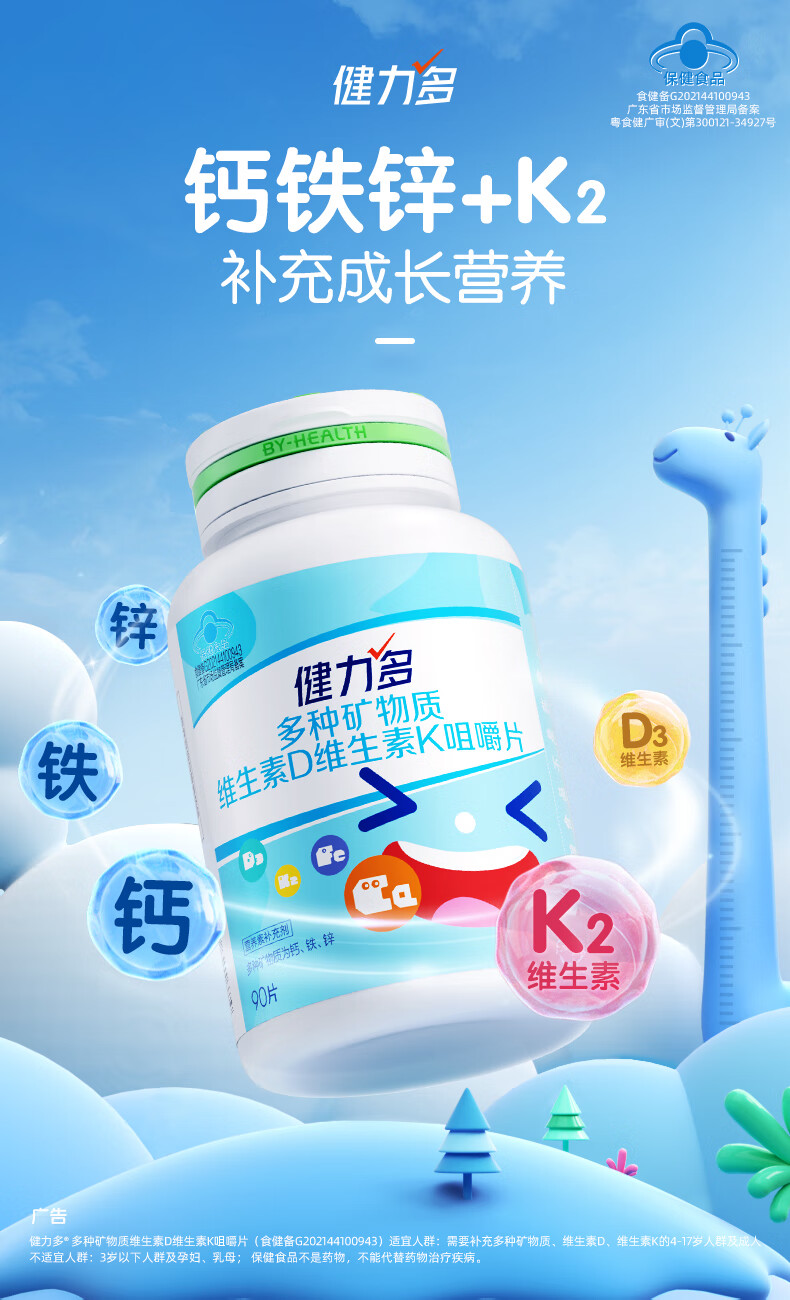 健力多儿童钙DK钙铁锌共270片礼盒装咀嚼片4-17岁青少年成长钙片官方品