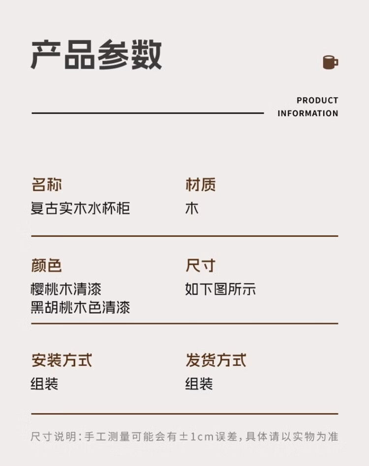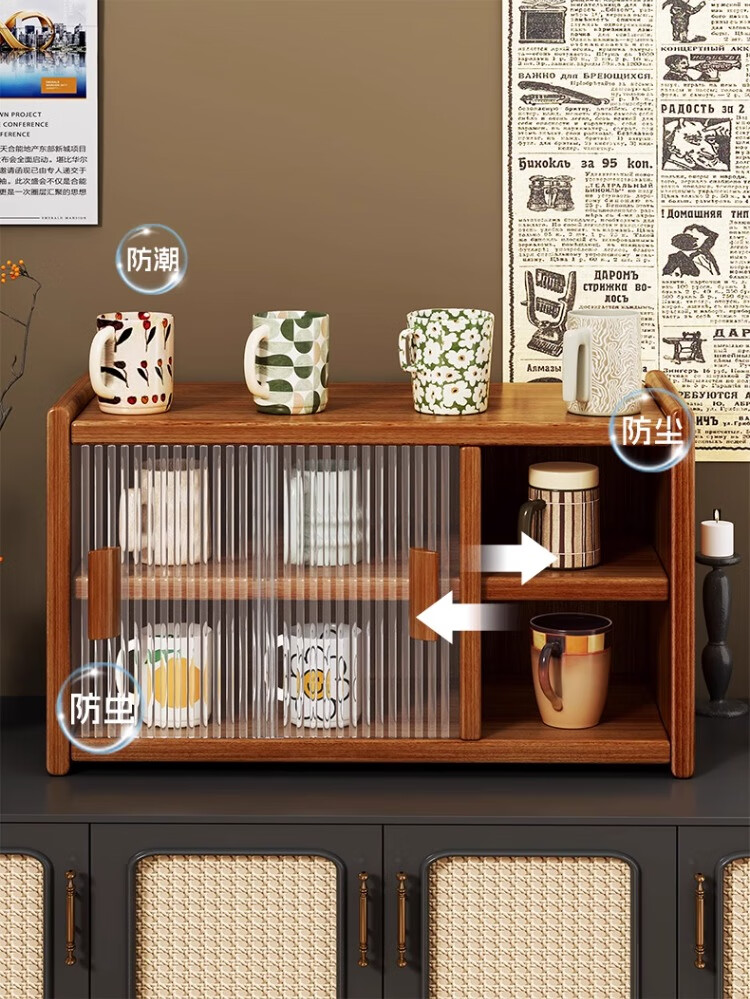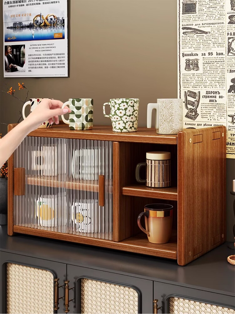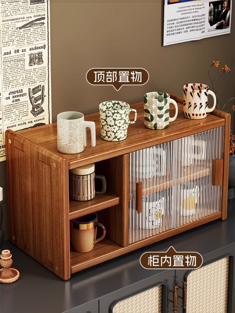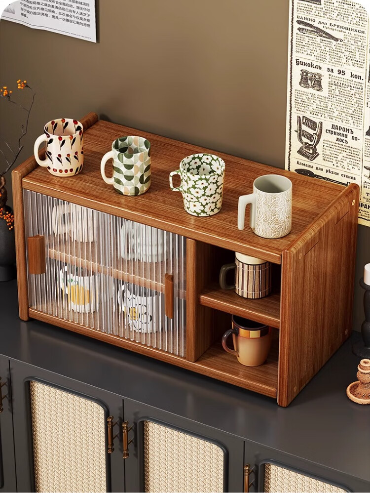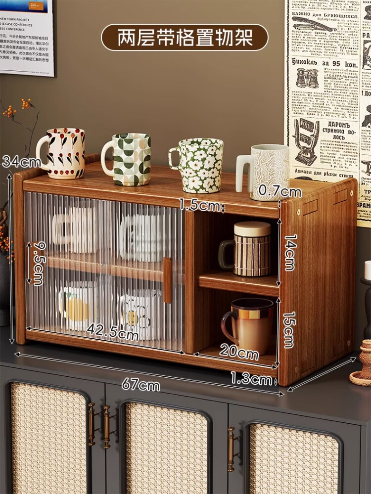 尔思家实木杯架家用台面茶具桌面收纳置物架防尘水杯马克杯餐边收纳柜子 【黑胡桃木色清漆】二层-长虹钢化玻璃柜门*圆润边角