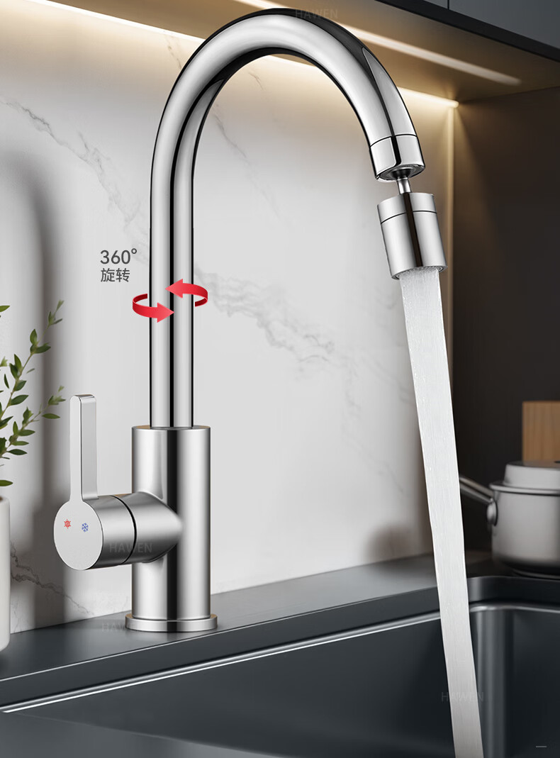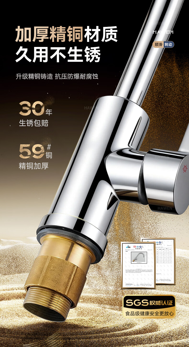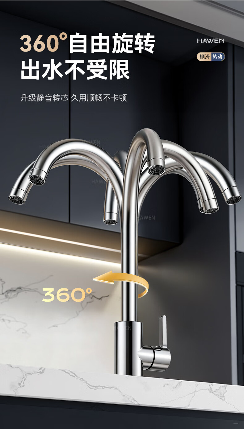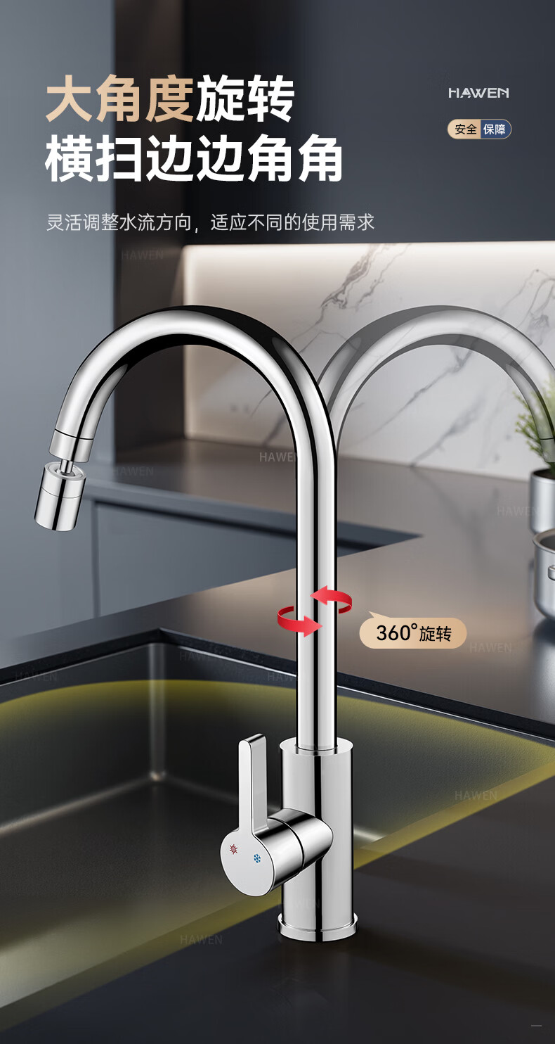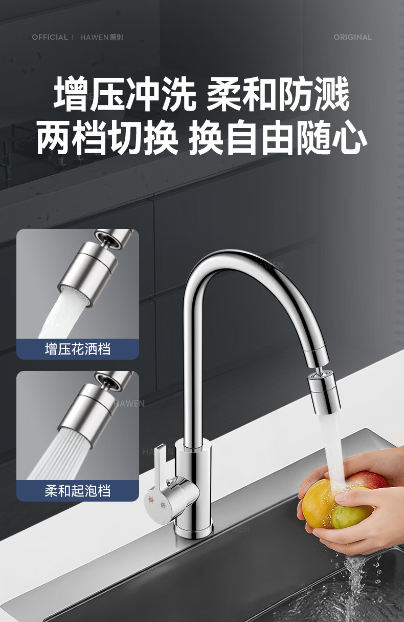 hawen【德国】厨房水龙头冷热双温二合一全铜万向旋转洗菜盆防溅水龙头 【电镀】两档增压防溅+自由万向旋转 精铜防腐防锈丨送冷热不锈钢进水管*2