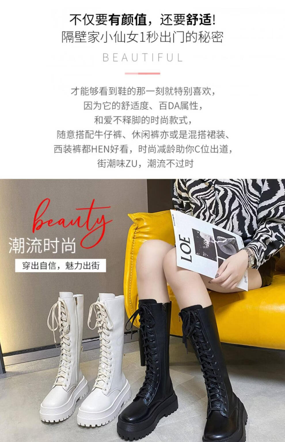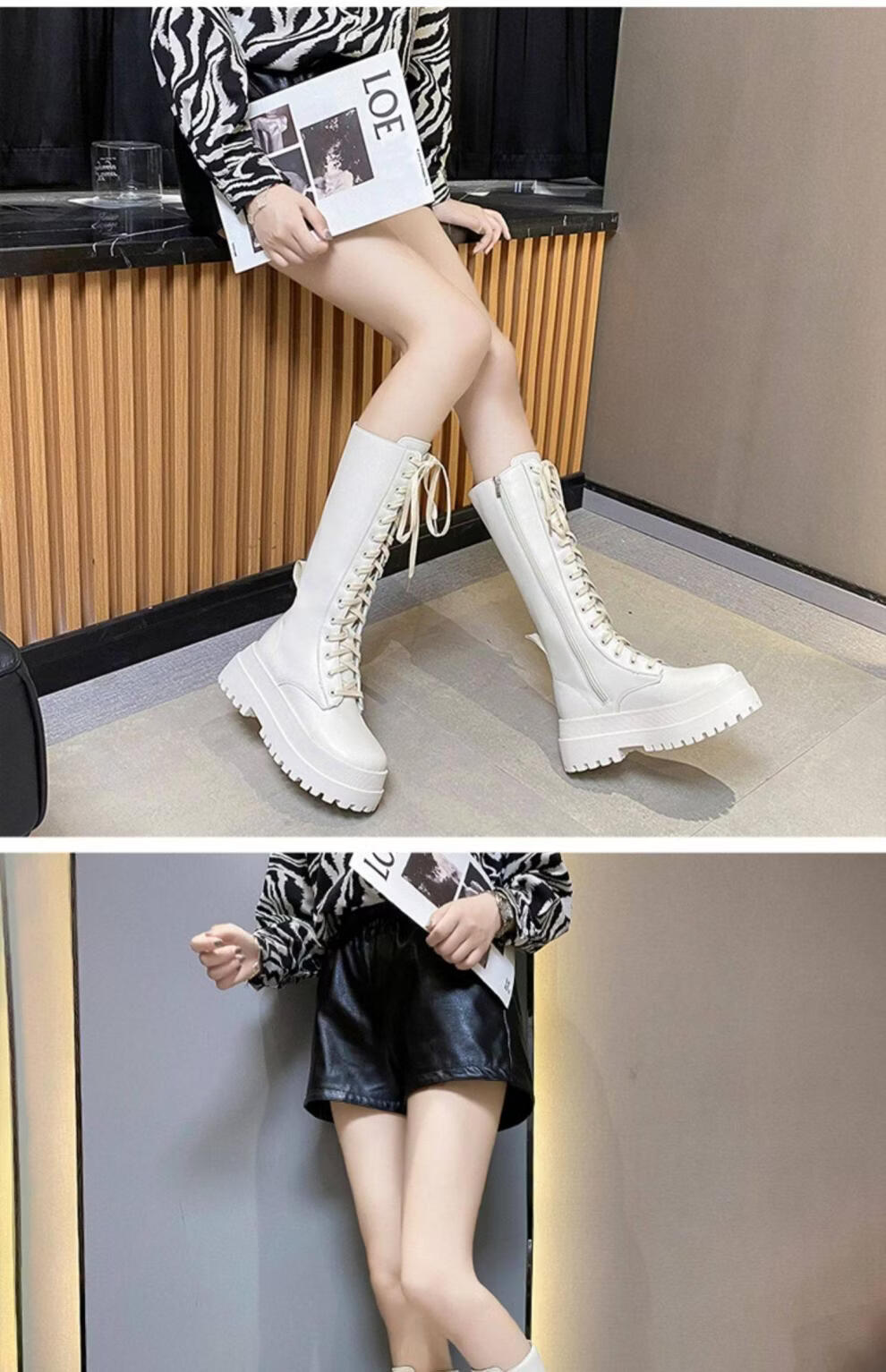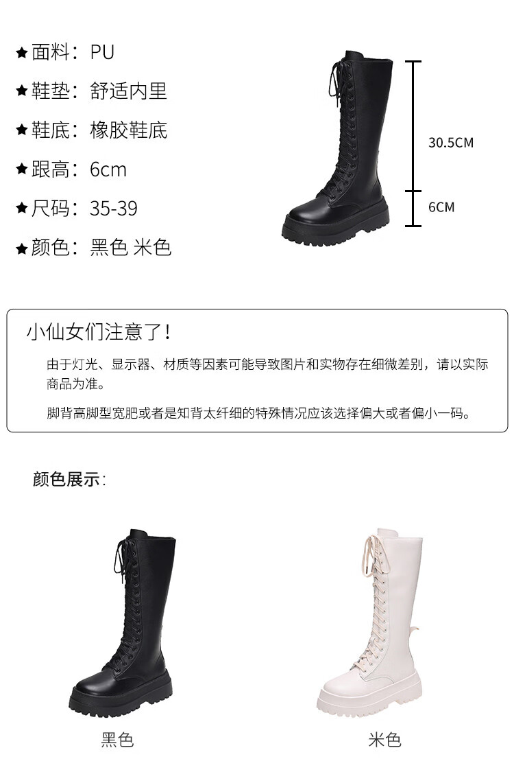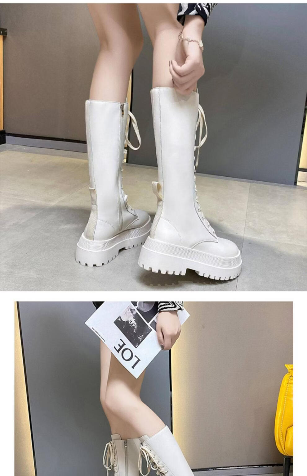 稻草人(MEXICAN)骑士靴女2026新款秋冬厚底小个子中长筒加绒马丁靴高筒白色机车靴 米白色 35