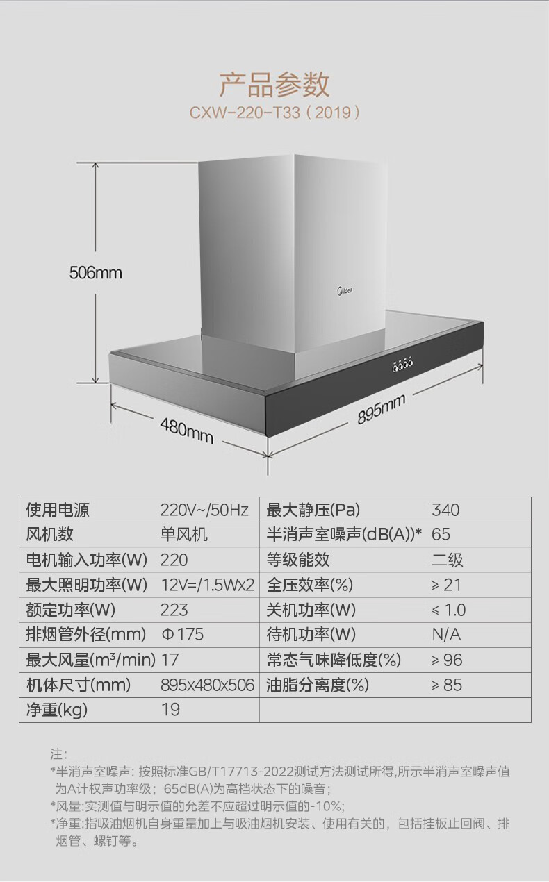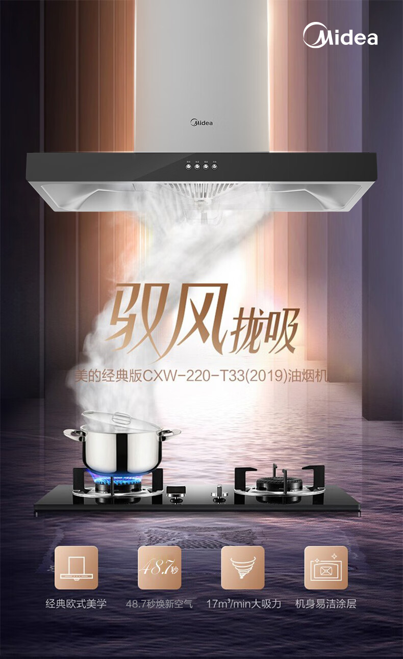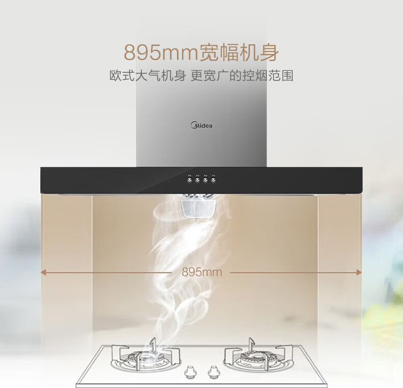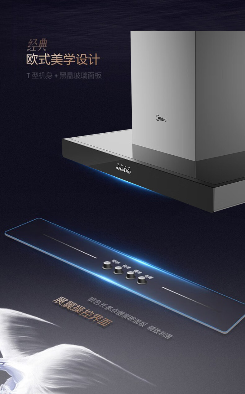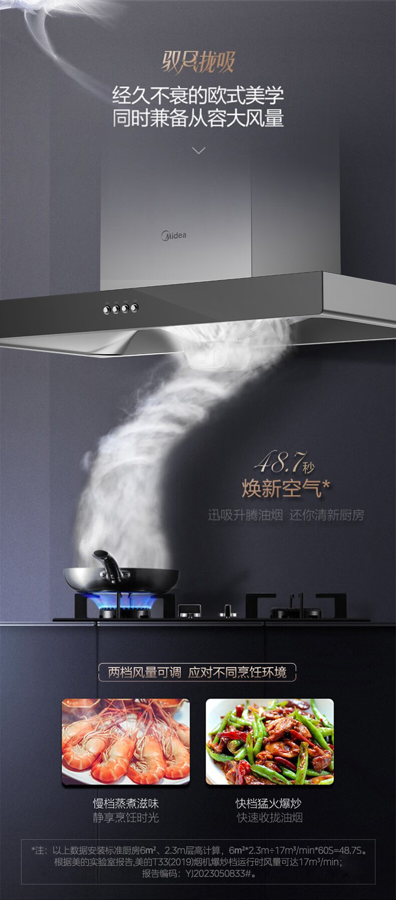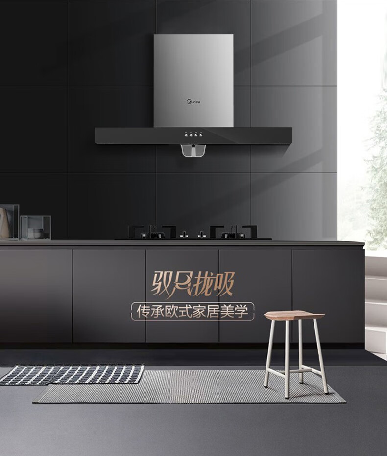 美的(Midea)抽油烟机顶吸欧式T型机身17立方大吸力厨房家用脱排吸油烟机 895宽屏拢烟 1.5秒焕新空气油烟机T33 【单烟机T33】 焕新空气