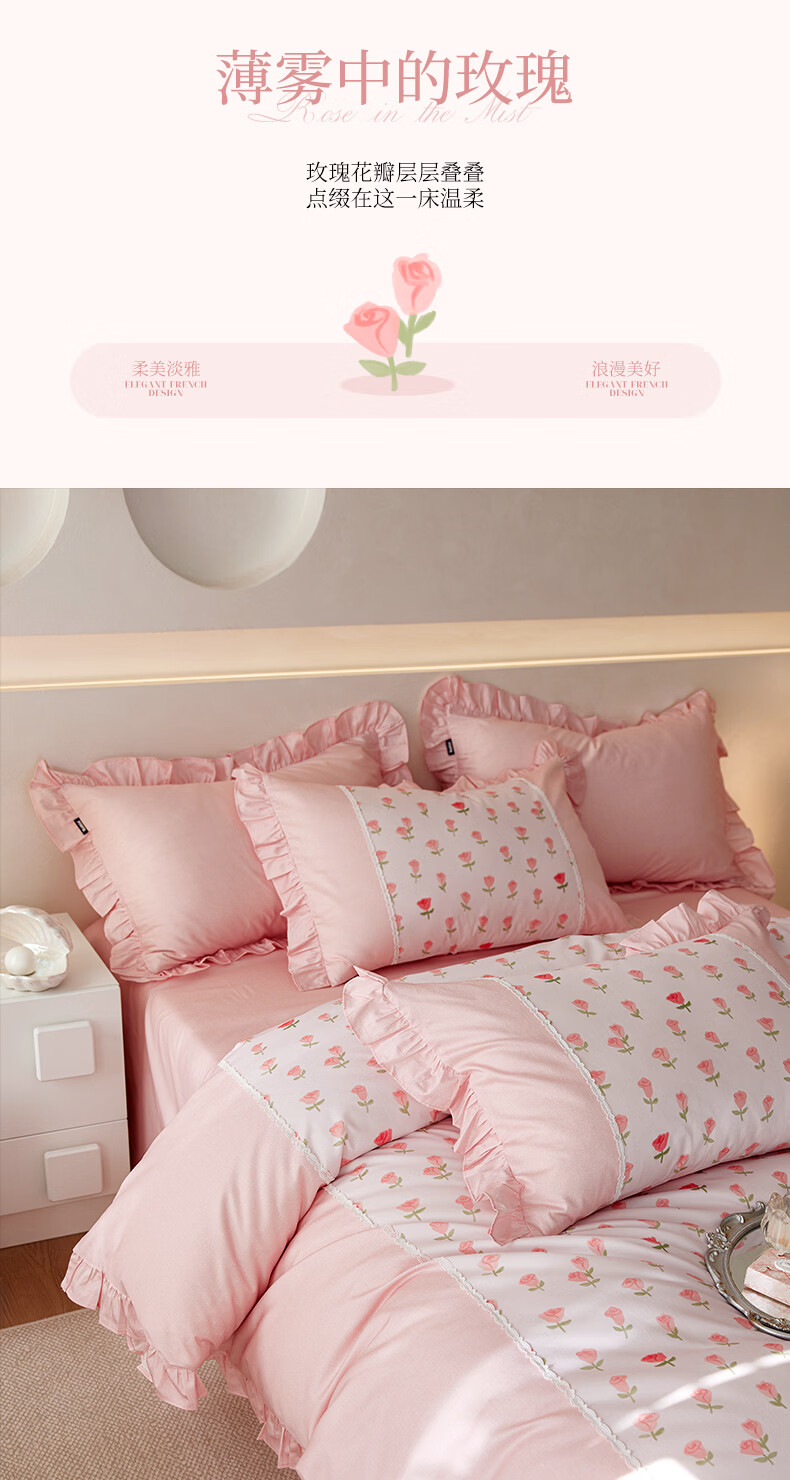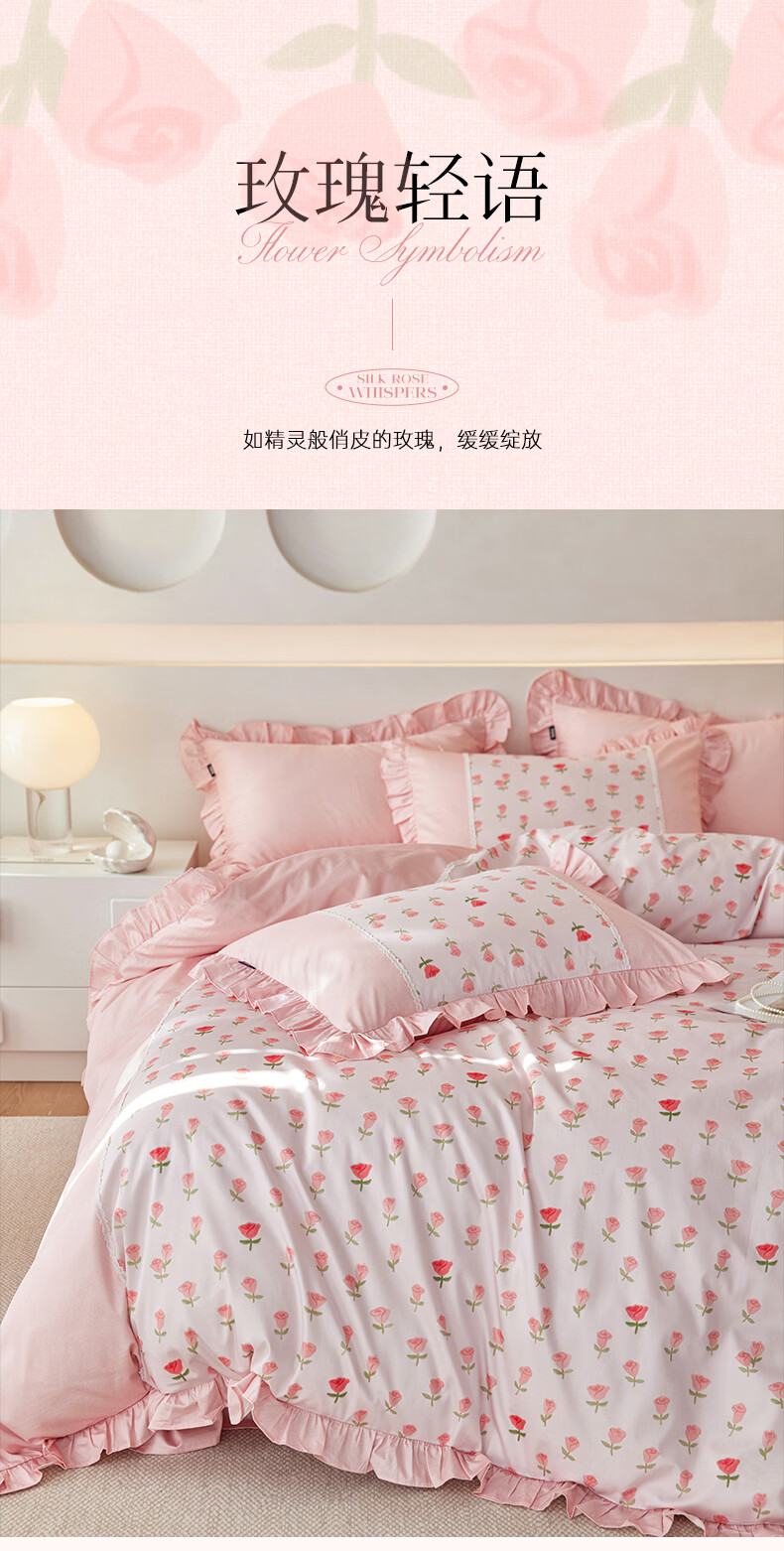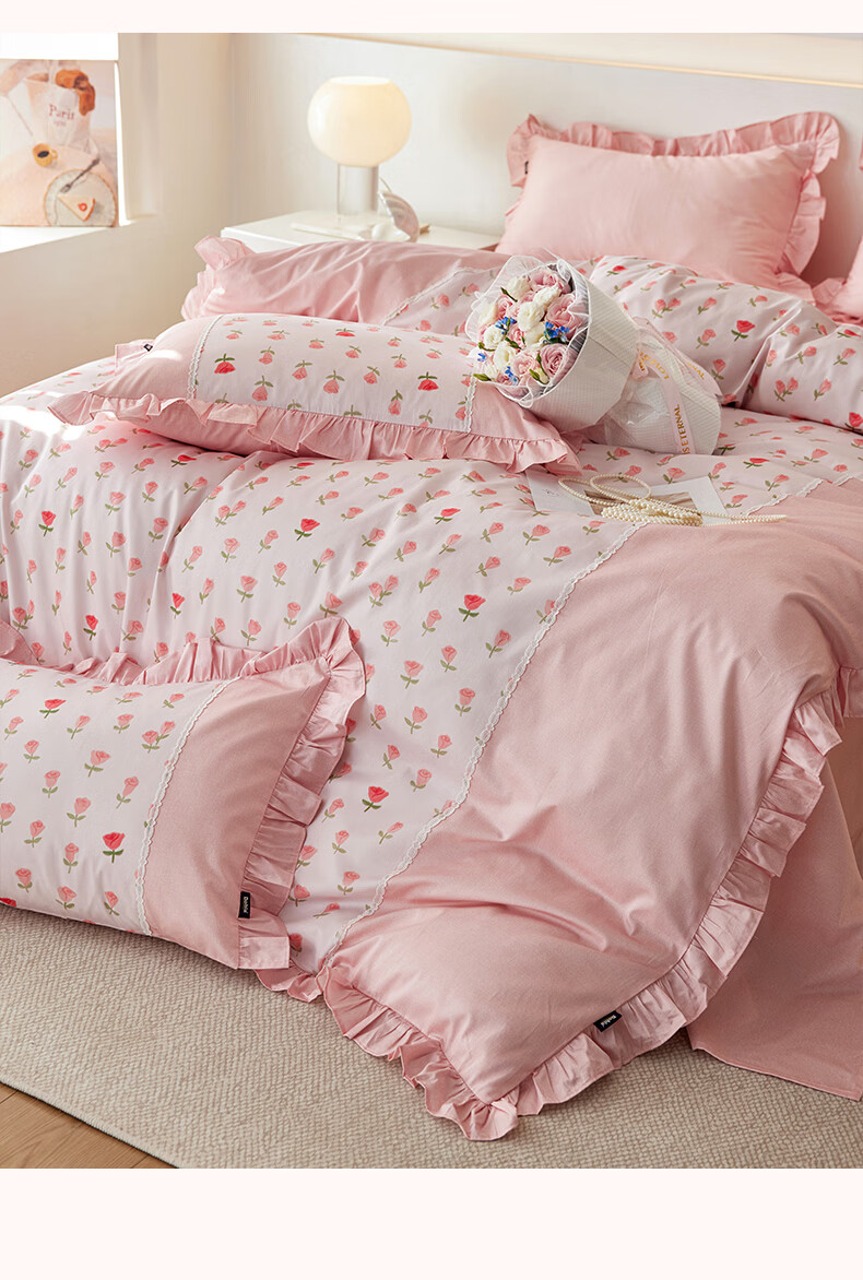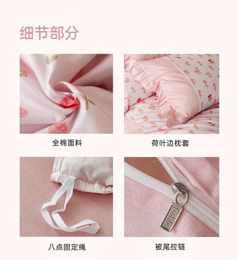 多喜爱家纺纯棉床上四件套 A类全棉床单被套双人套件1.8米床229*230cm荷叶边款