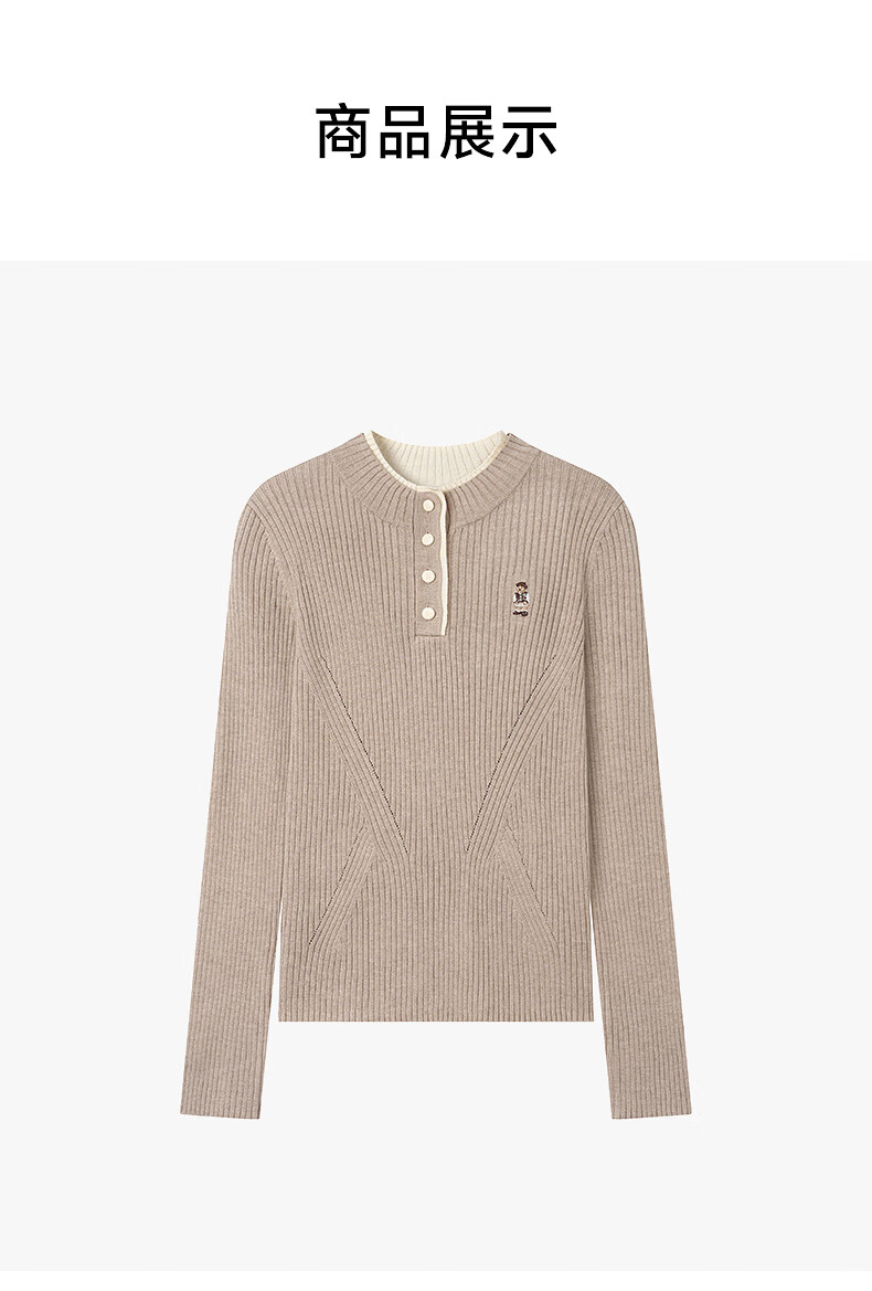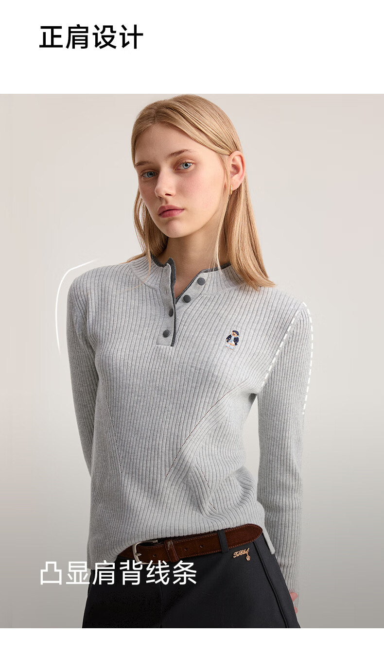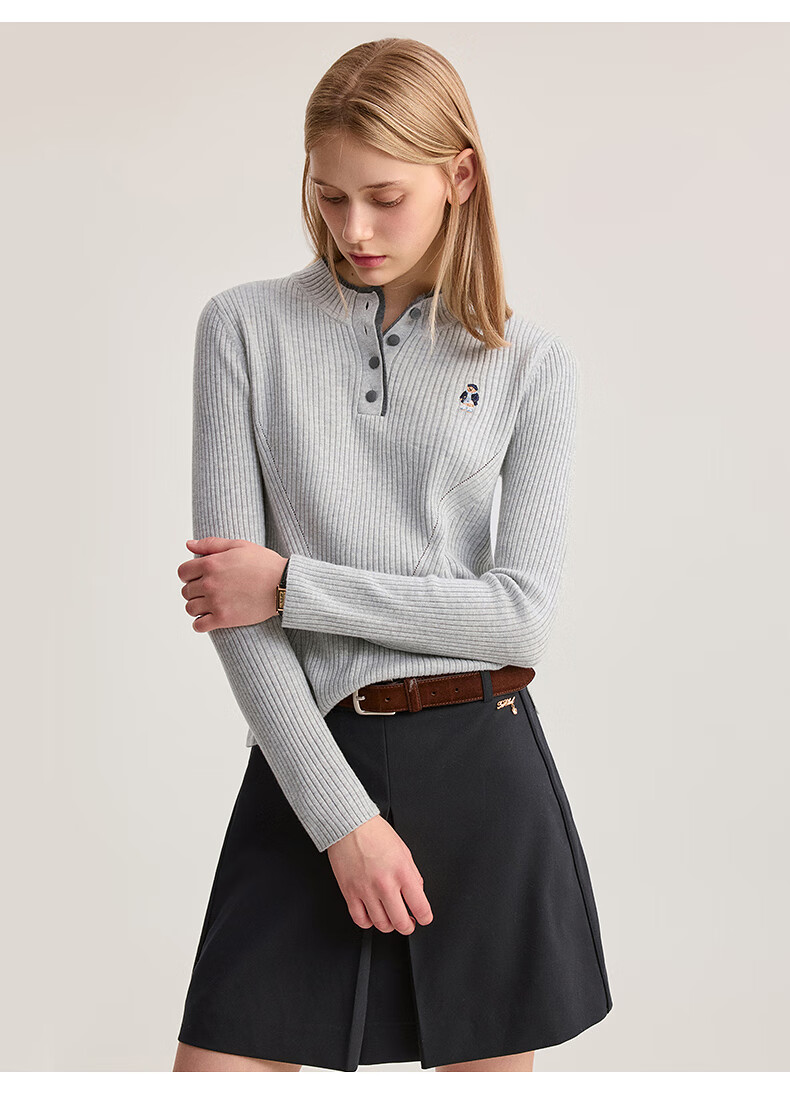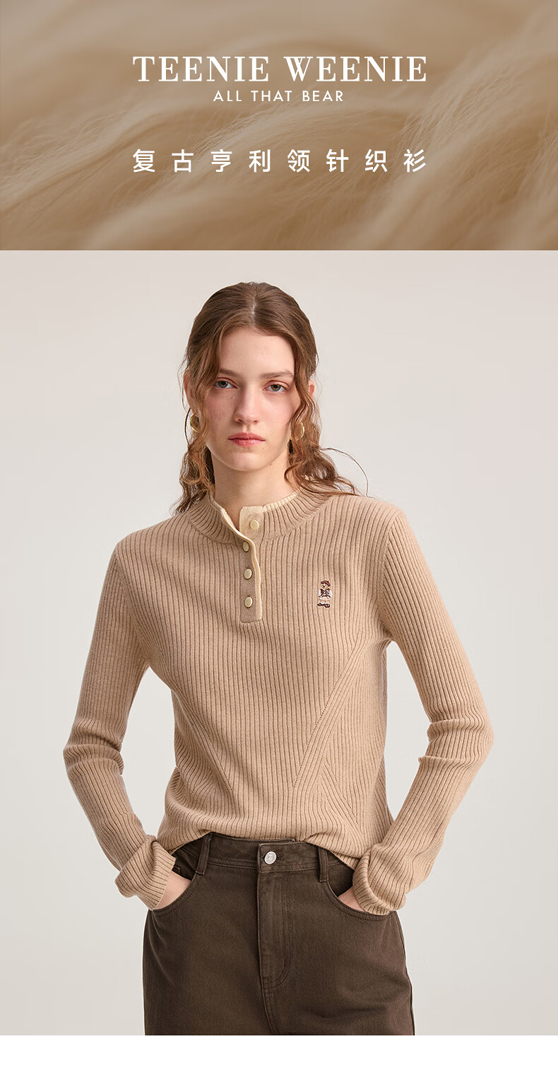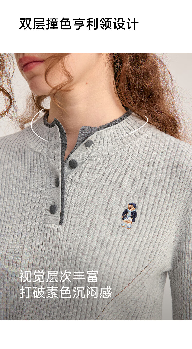 Teenie Weenie小熊女装毛针织衫2025秋新款休闲撞色亨利领套头毛衣 中灰色 S