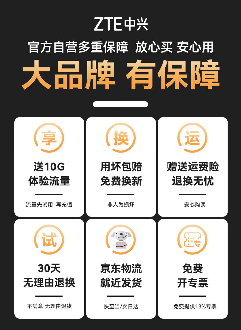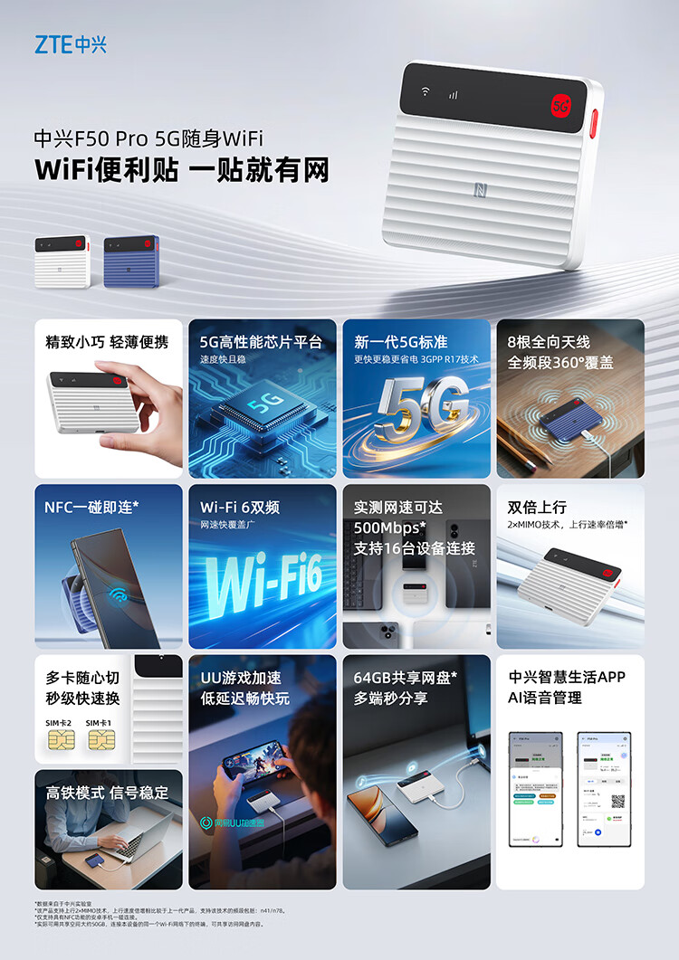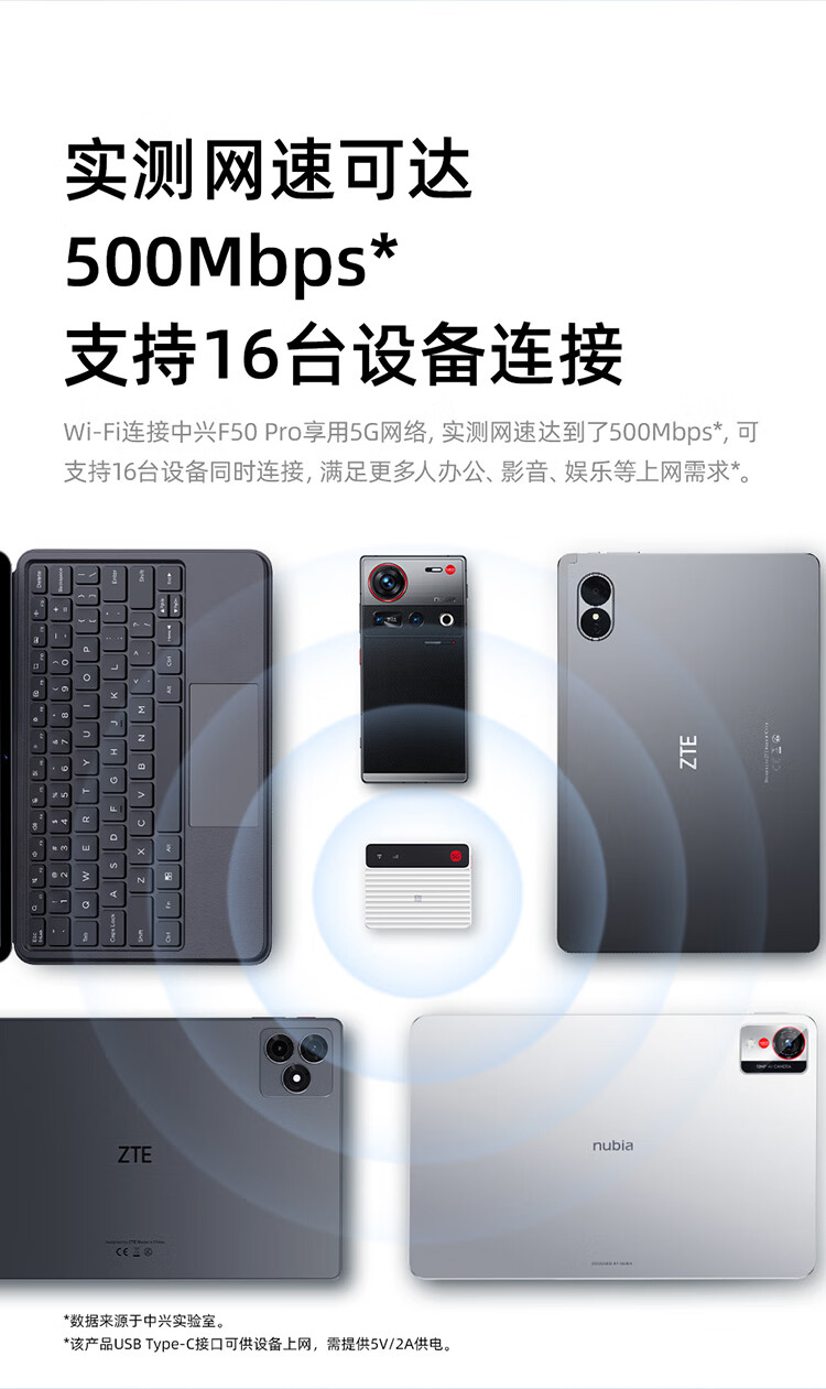 中兴(ZTE)F50 Pro 5G随身wifi6可插卡移动无线便携式路由器热点车载笔记本电脑上网卡托全国通用流量2025款