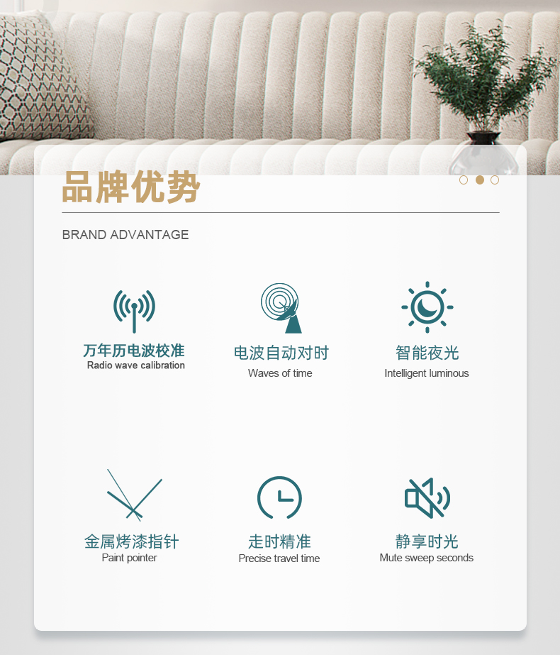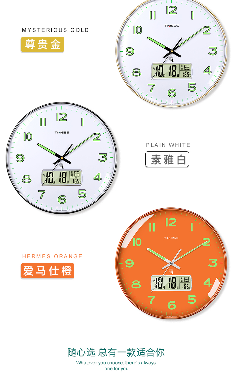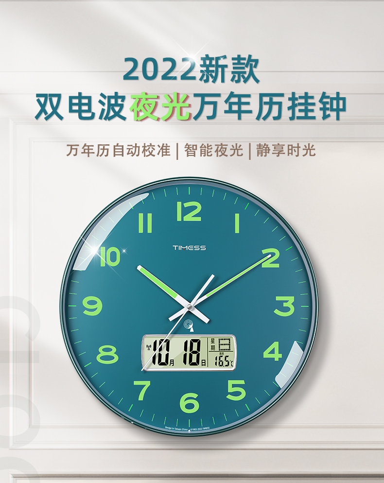 Timess挂钟电波钟自动对时夜光钟客厅家用时尚免打孔时钟挂墙36cm