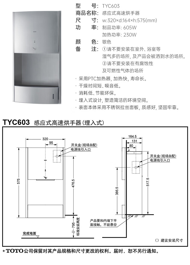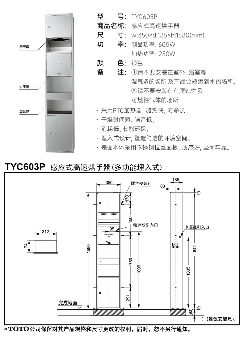 TOTO一体式烘手器TYC603P卫生间厕所干手器感应自动烘干机手纸箱 TYC603P:多功能烘手器