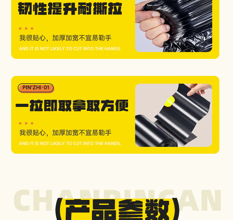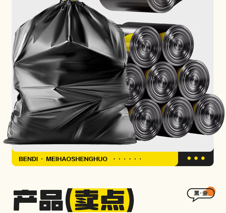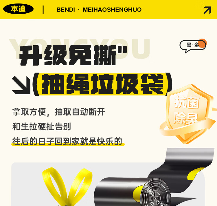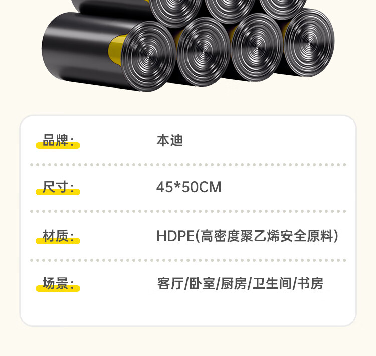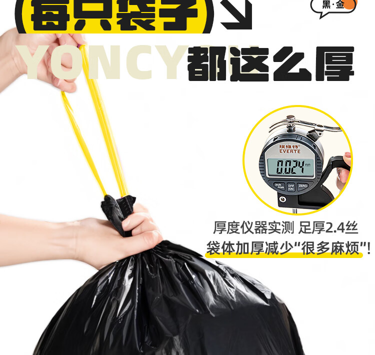 本迪抽绳式垃圾袋黑色45*50cm*200只加厚款1.2丝加大免撕家用塑料袋桶