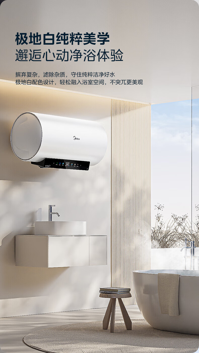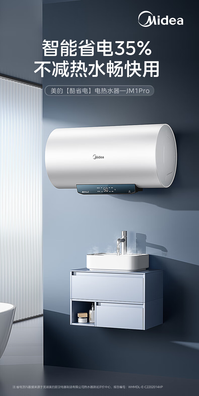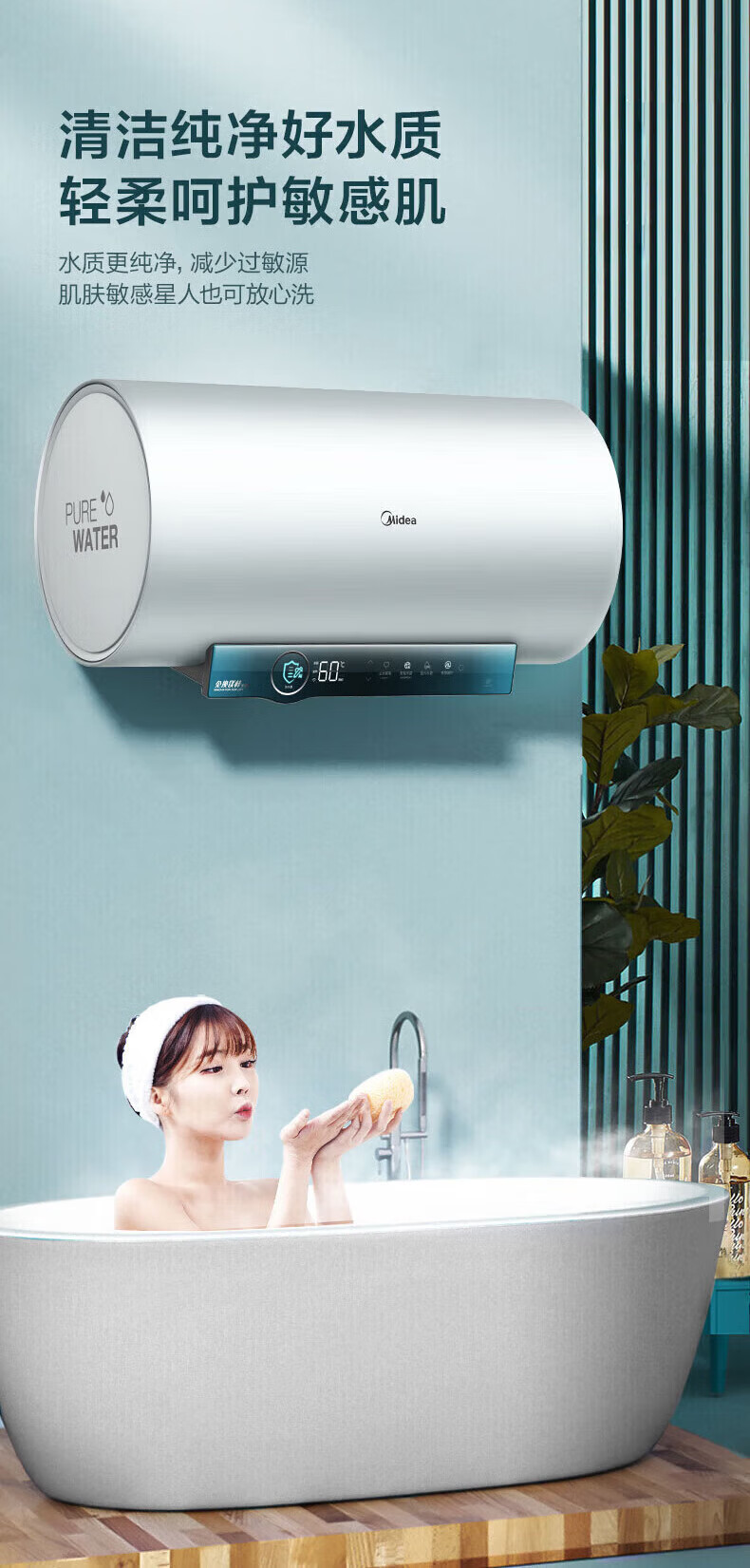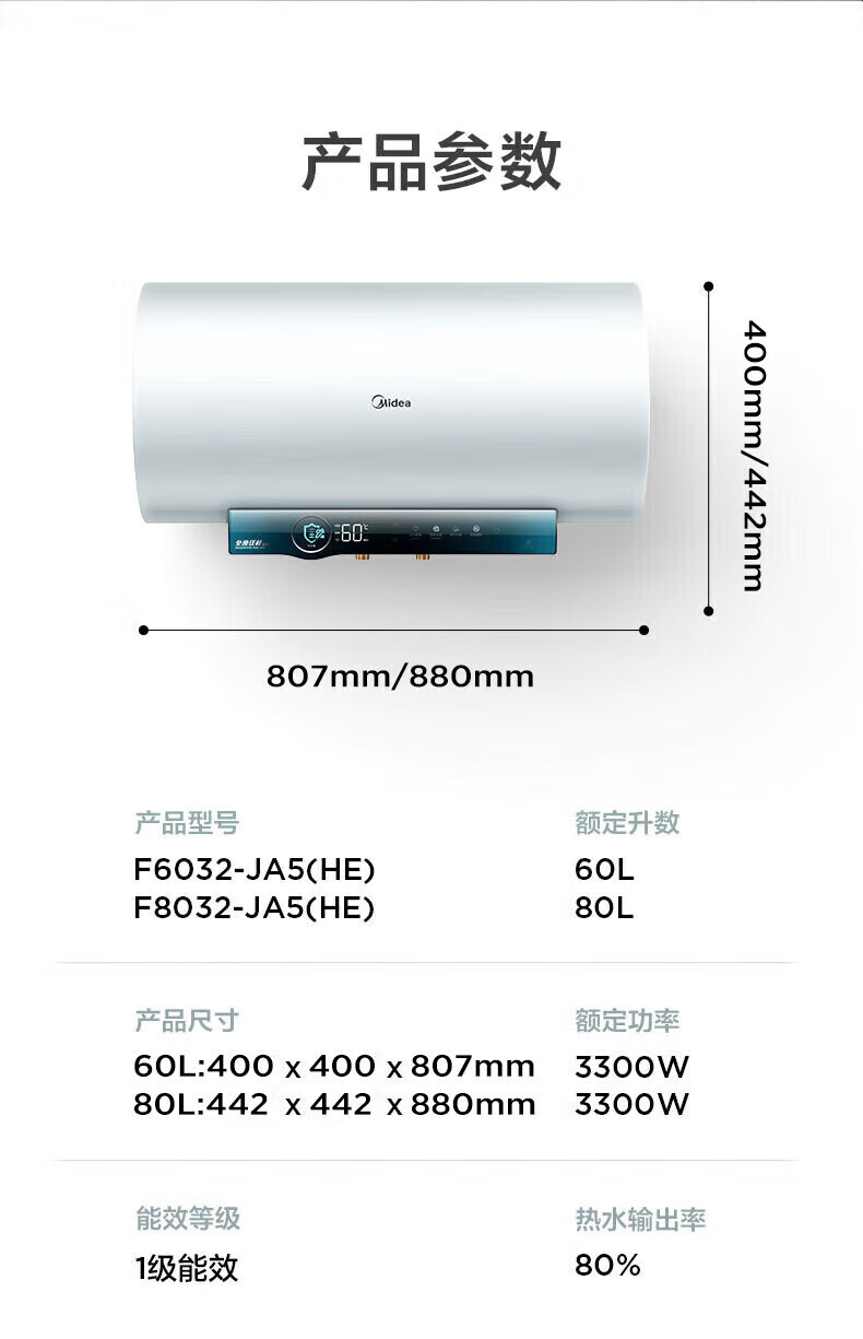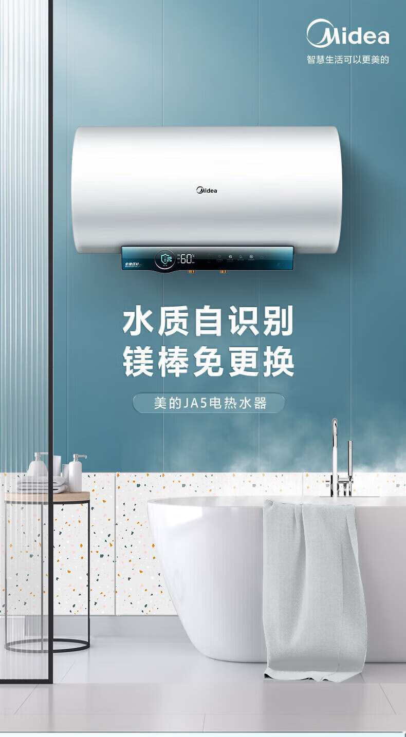 美的(Midea)电热水器60升80升3300W一级能效出水断电速热家用变频节能省电终身镁棒免换免清洗防电墙手机控制 60L 3300W 出水断电 变频双管·JA5