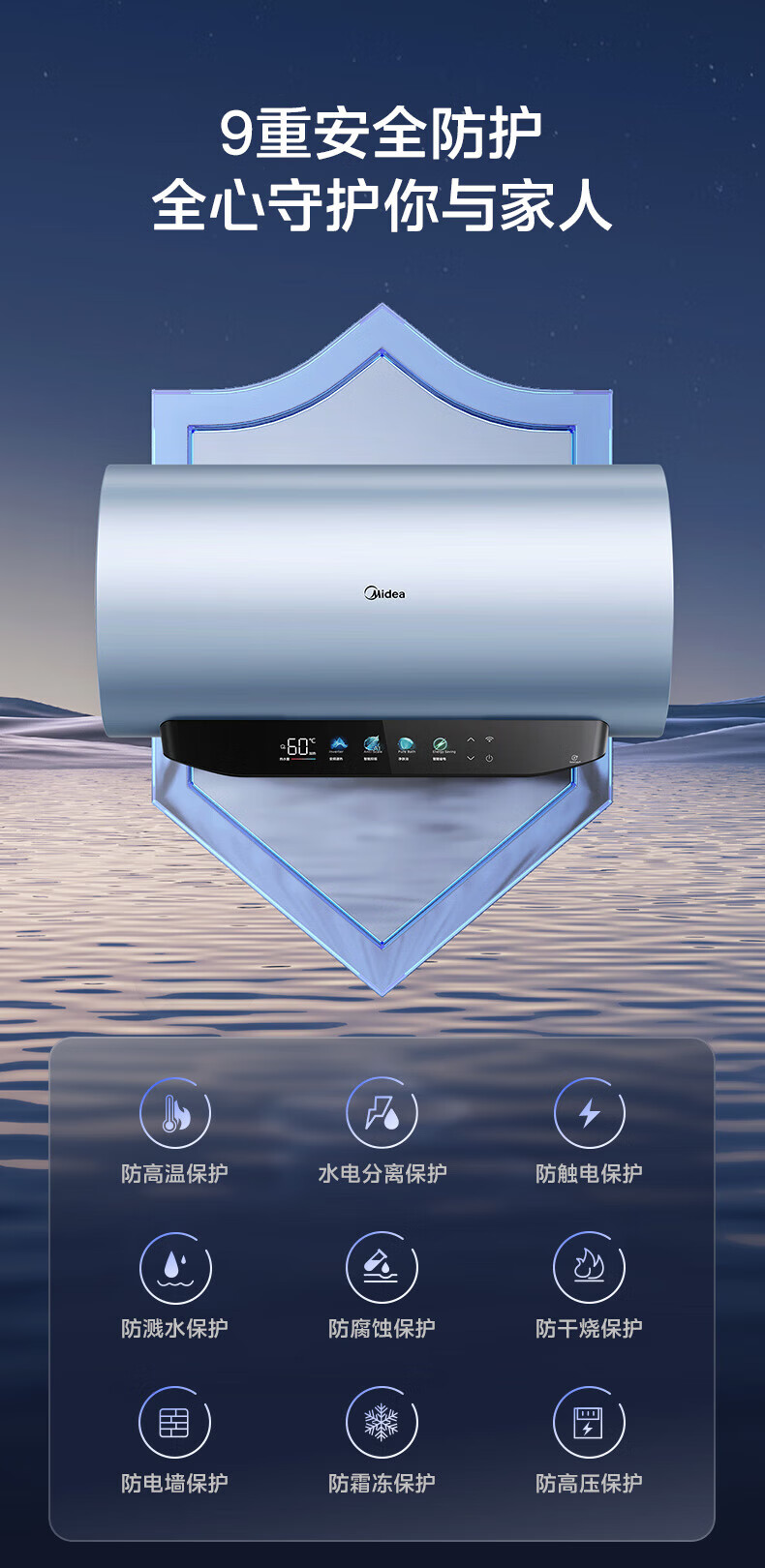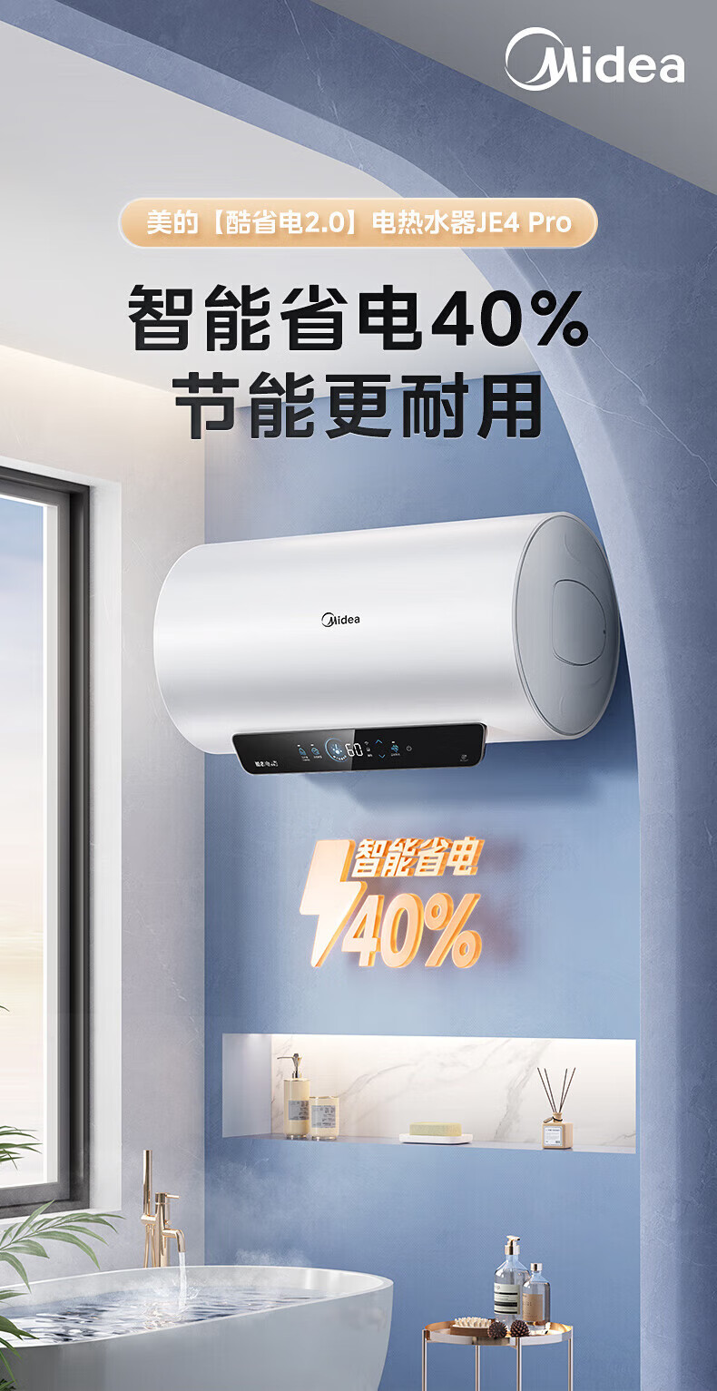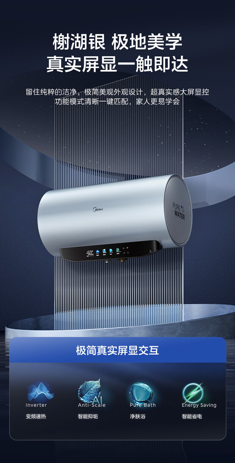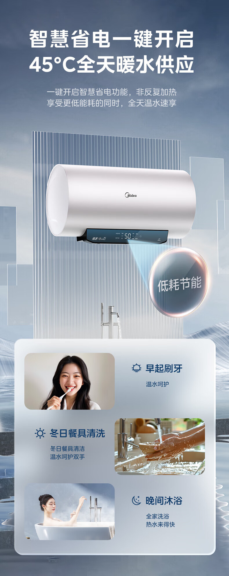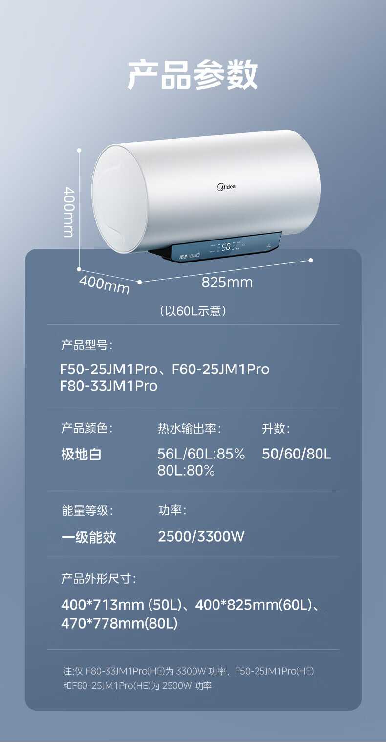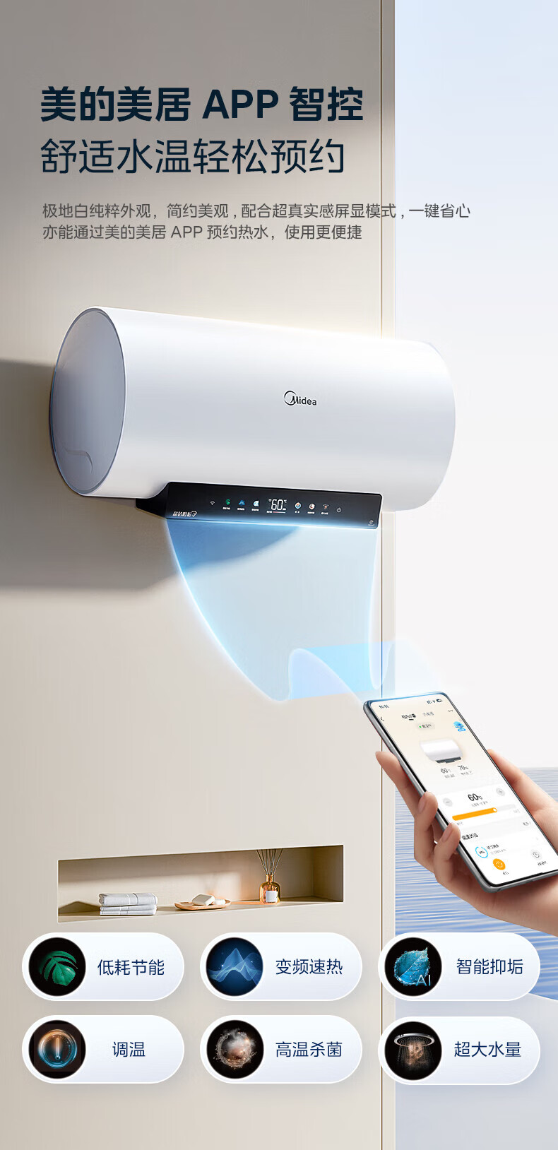 美的(Midea)电热水器60升80升3300W一级能效出水断电速热家用变频节能省电终身镁棒免换免清洗防电墙手机控制 60L 3300W 出水断电 变频双管·JA5