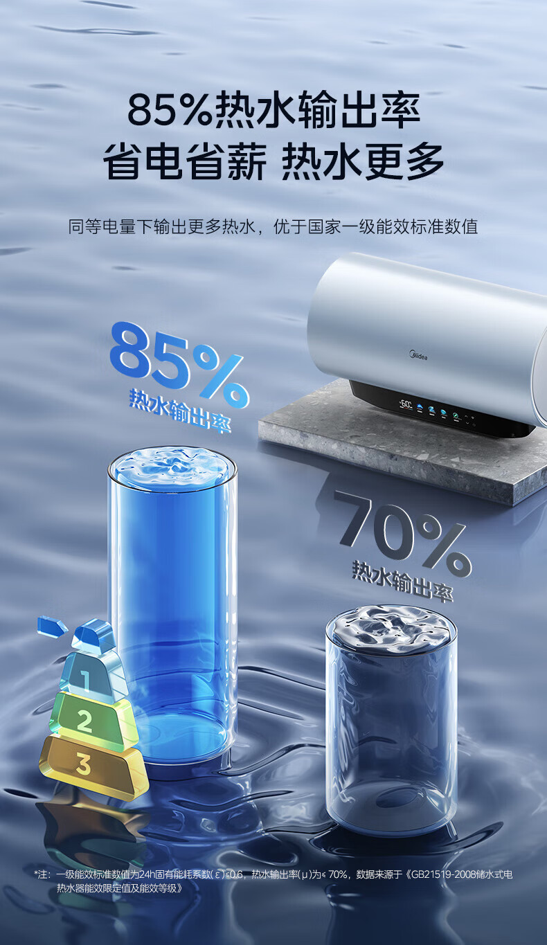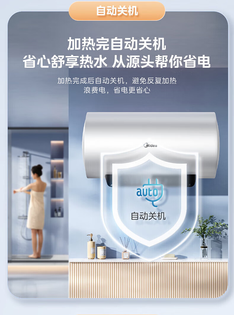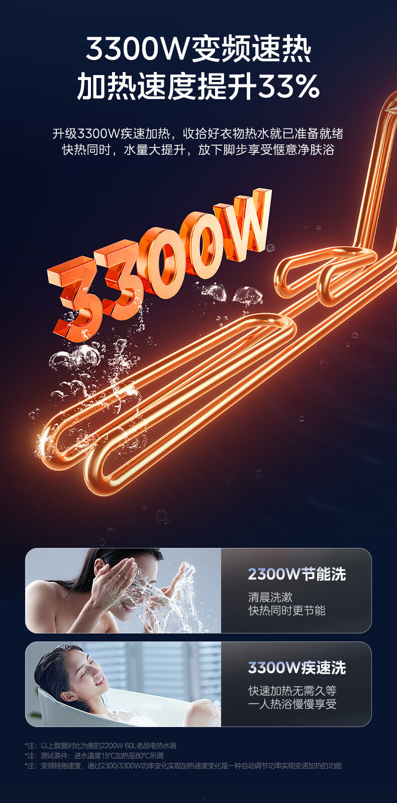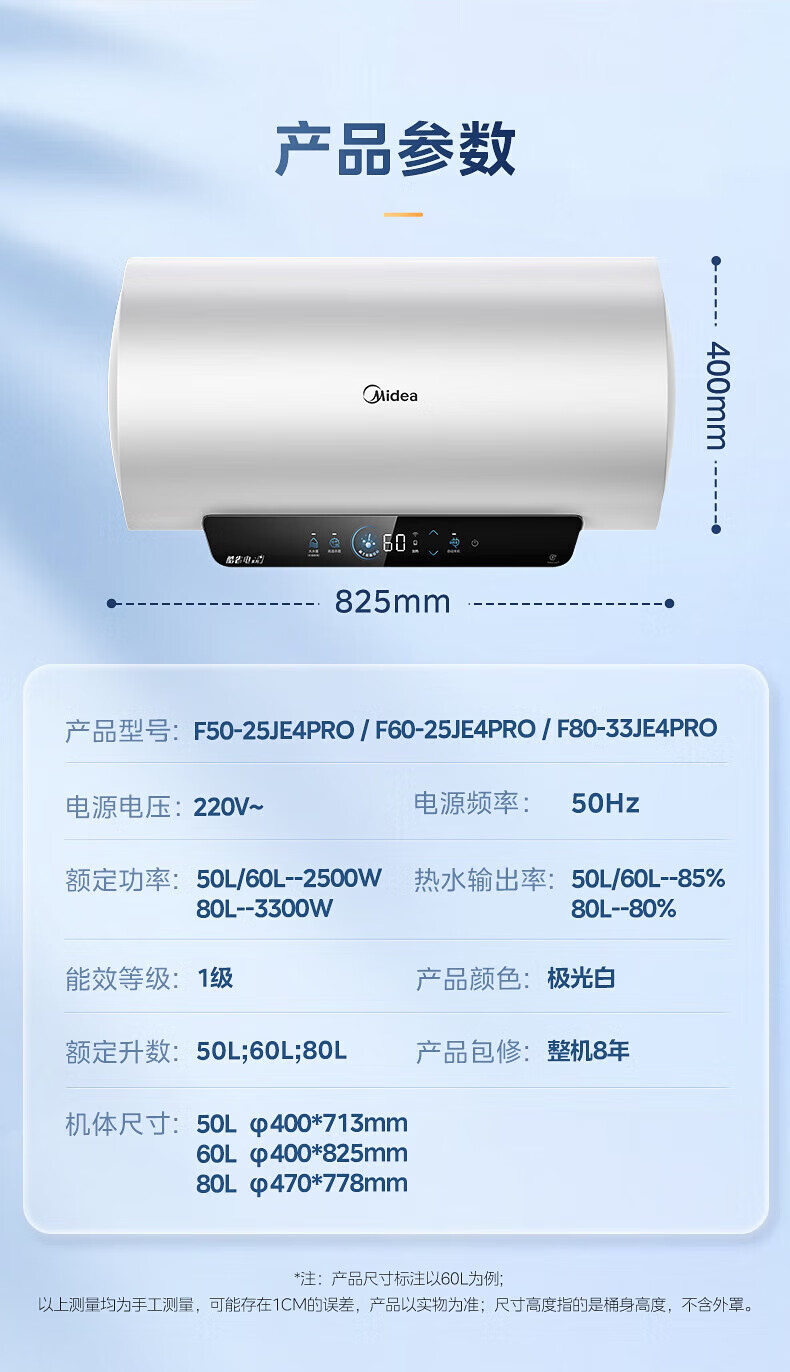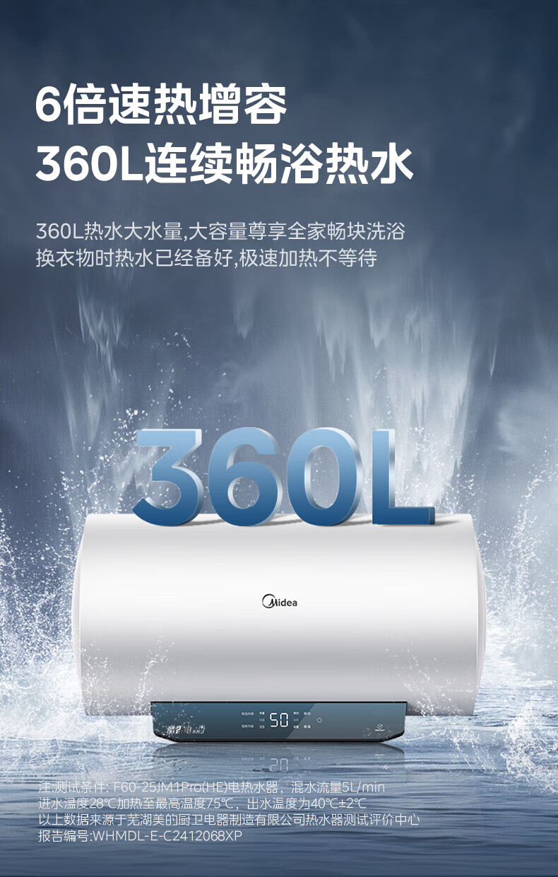 美的(Midea)电热水器60升80升3300W一级能效出水断电速热家用变频节能省电终身镁棒免换免清洗防电墙手机控制 60L 3300W 出水断电 变频双管·JA5