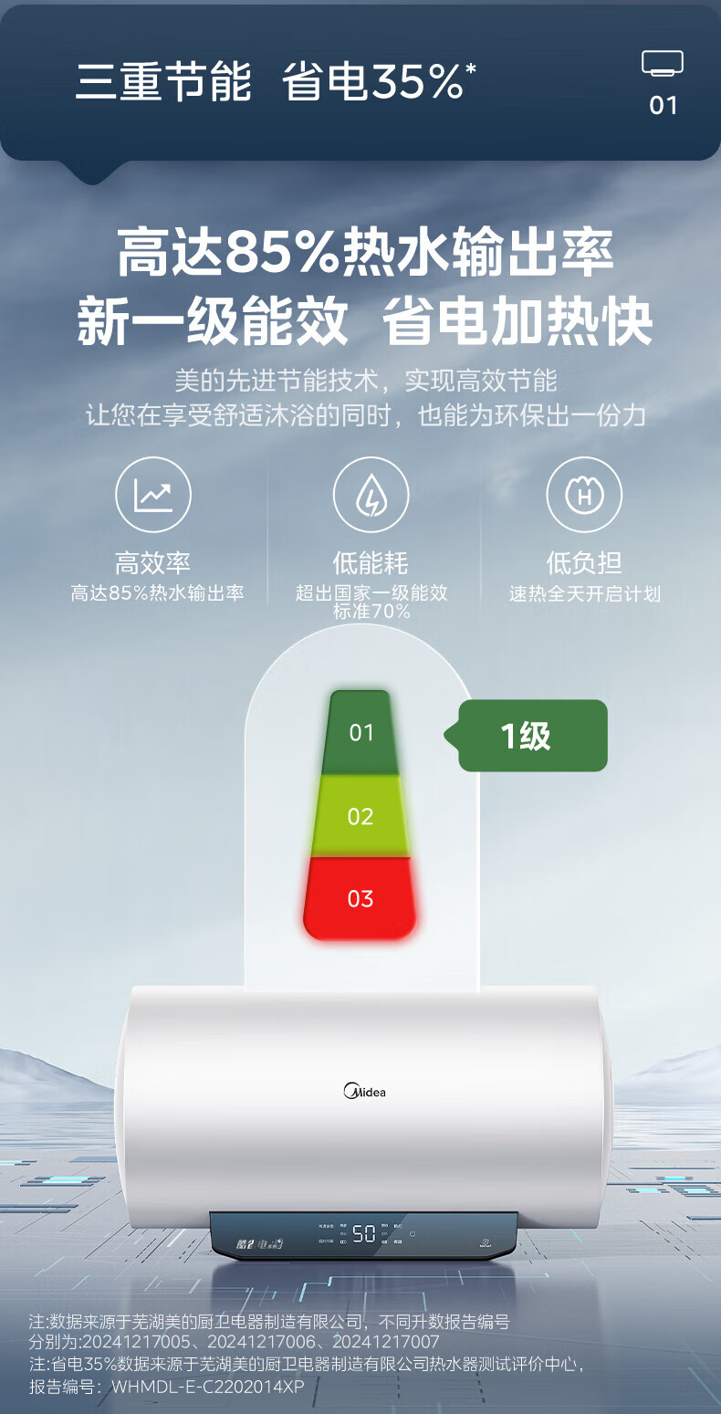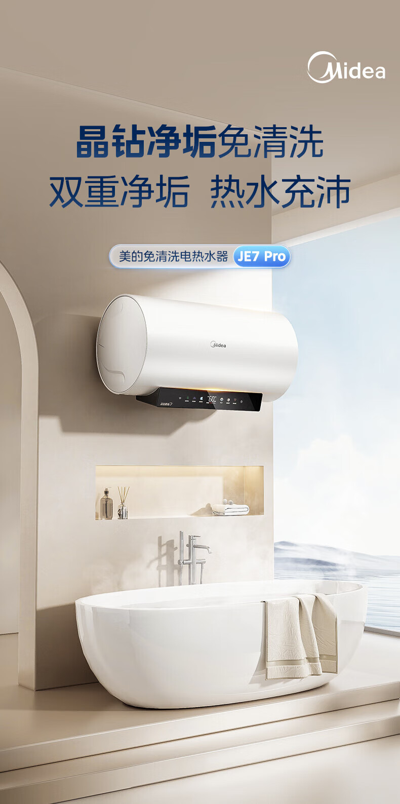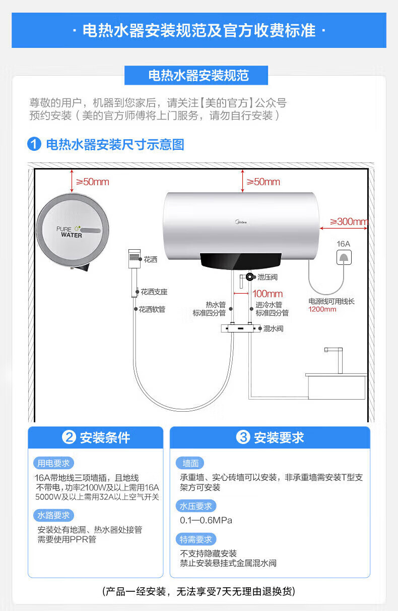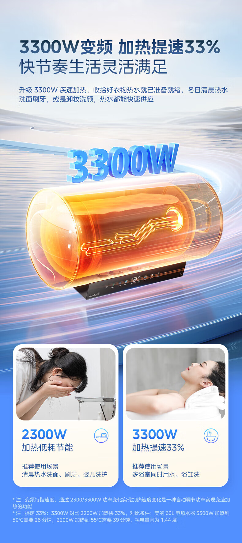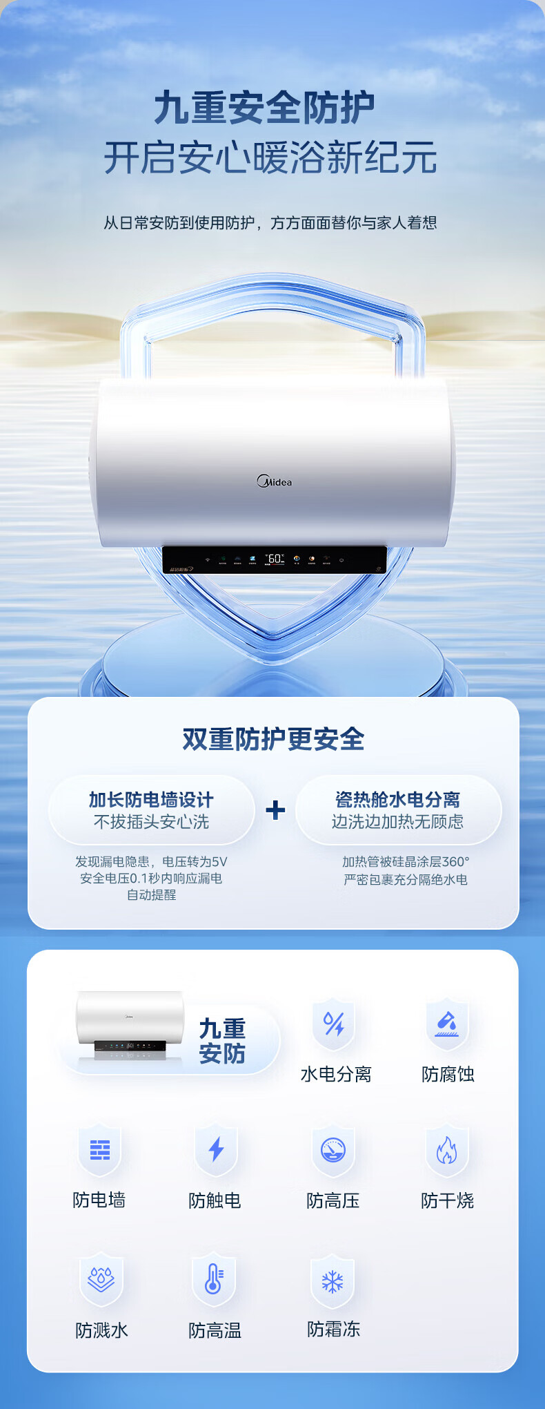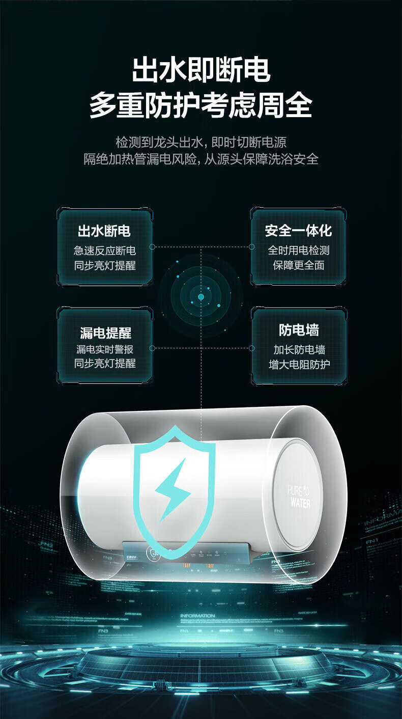 美的(Midea)电热水器60升80升3300W一级能效出水断电速热家用变频节能省电终身镁棒免换免清洗防电墙手机控制 60L 3300W 出水断电 变频双管·JA5