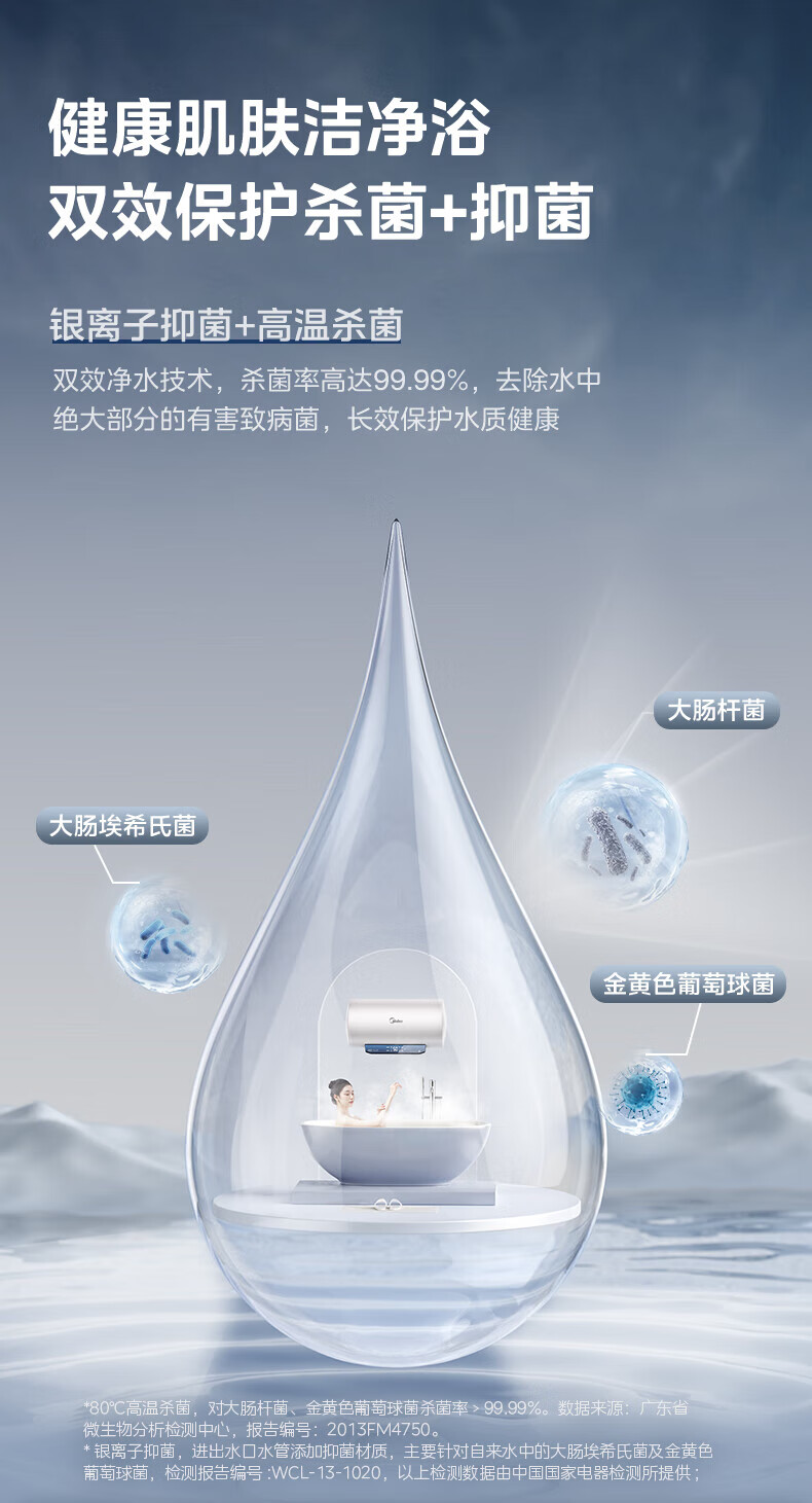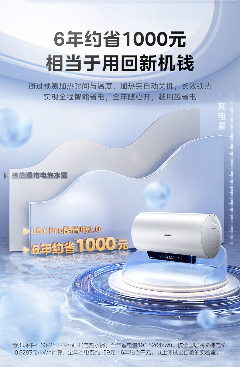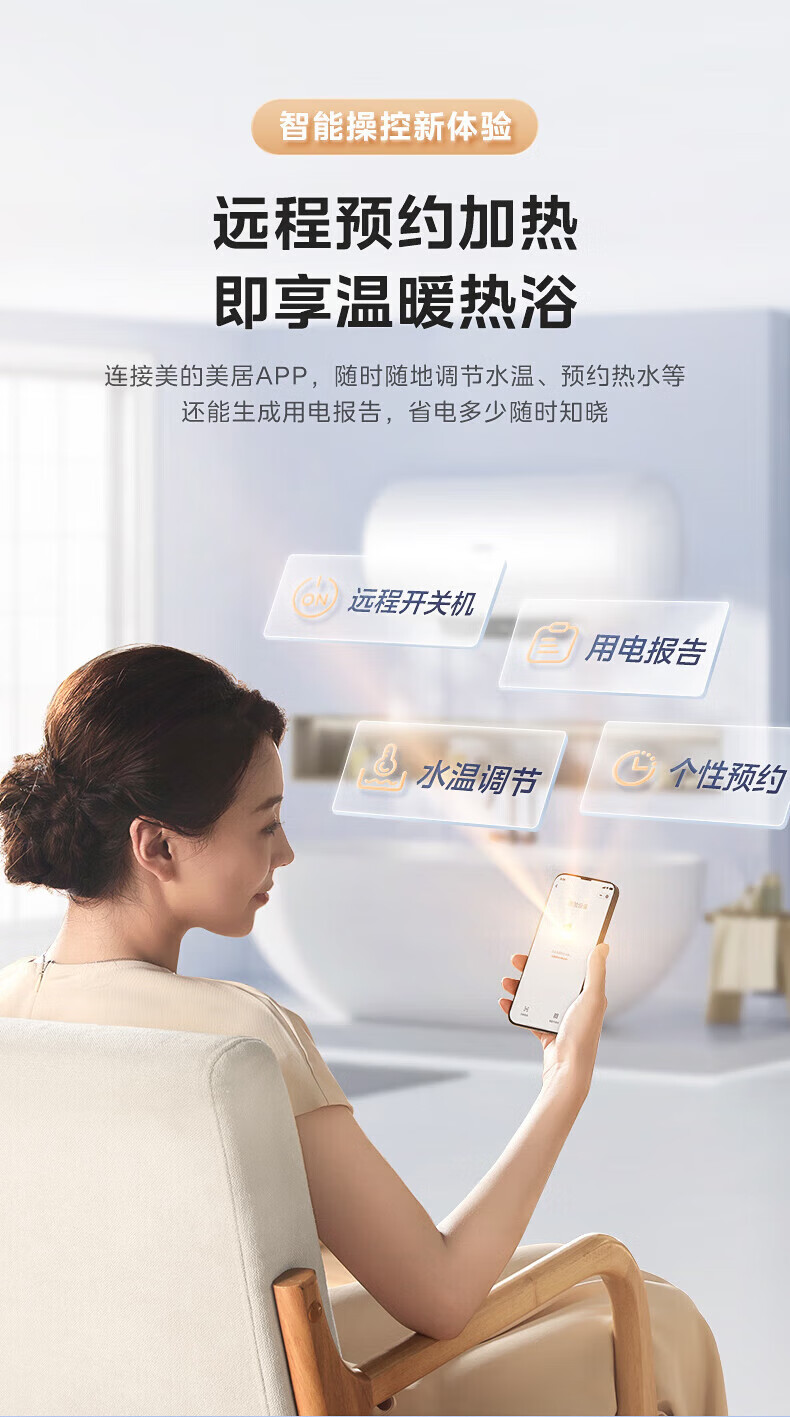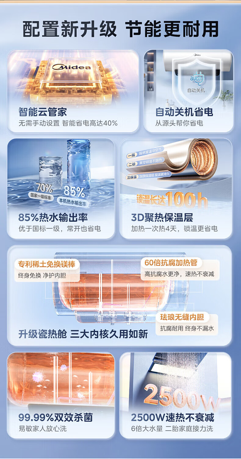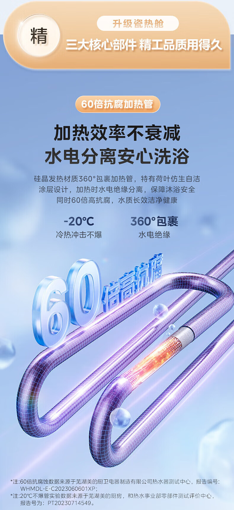 美的(Midea)电热水器60升80升3300W一级能效出水断电速热家用变频节能省电终身镁棒免换免清洗防电墙手机控制 60L 3300W 出水断电 变频双管·JA5