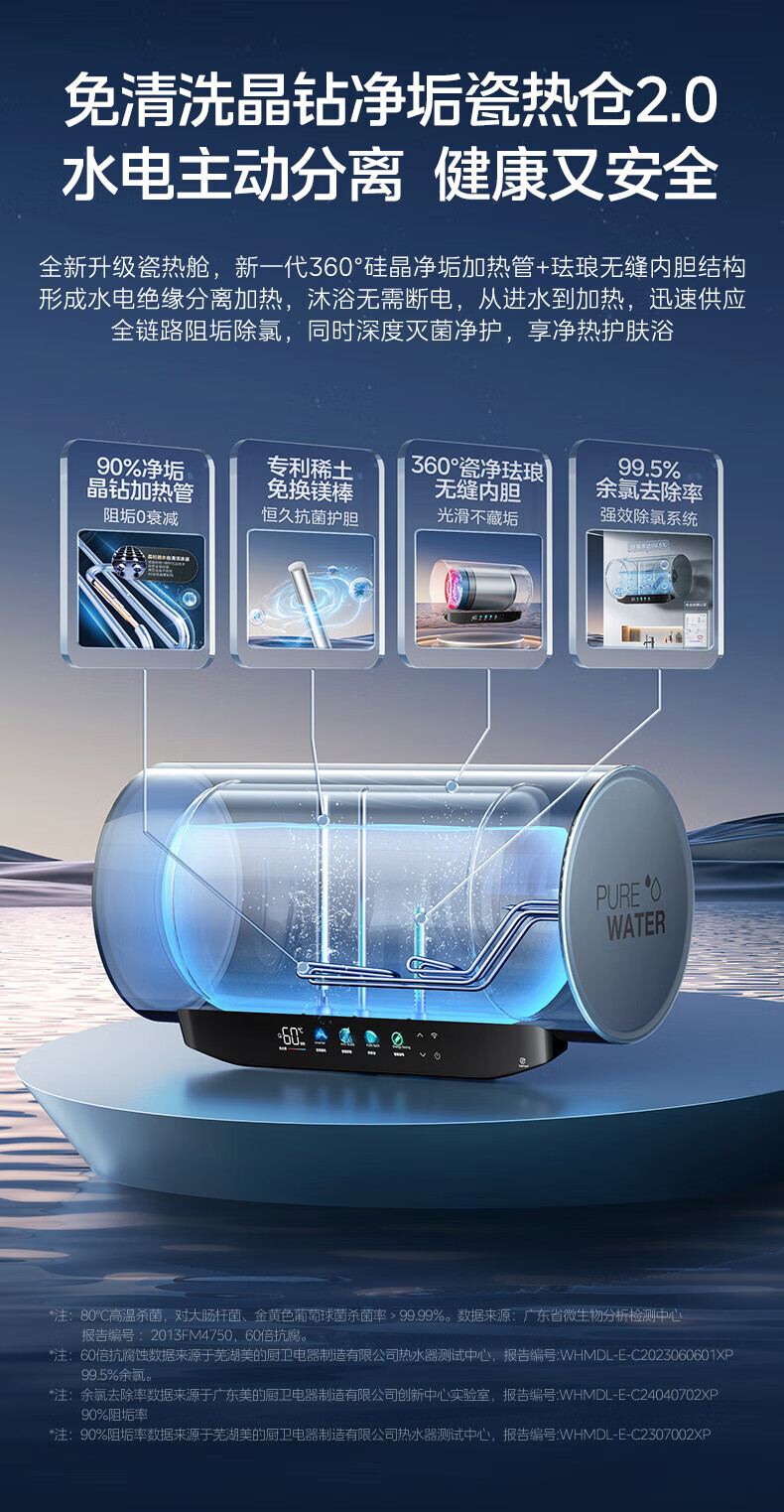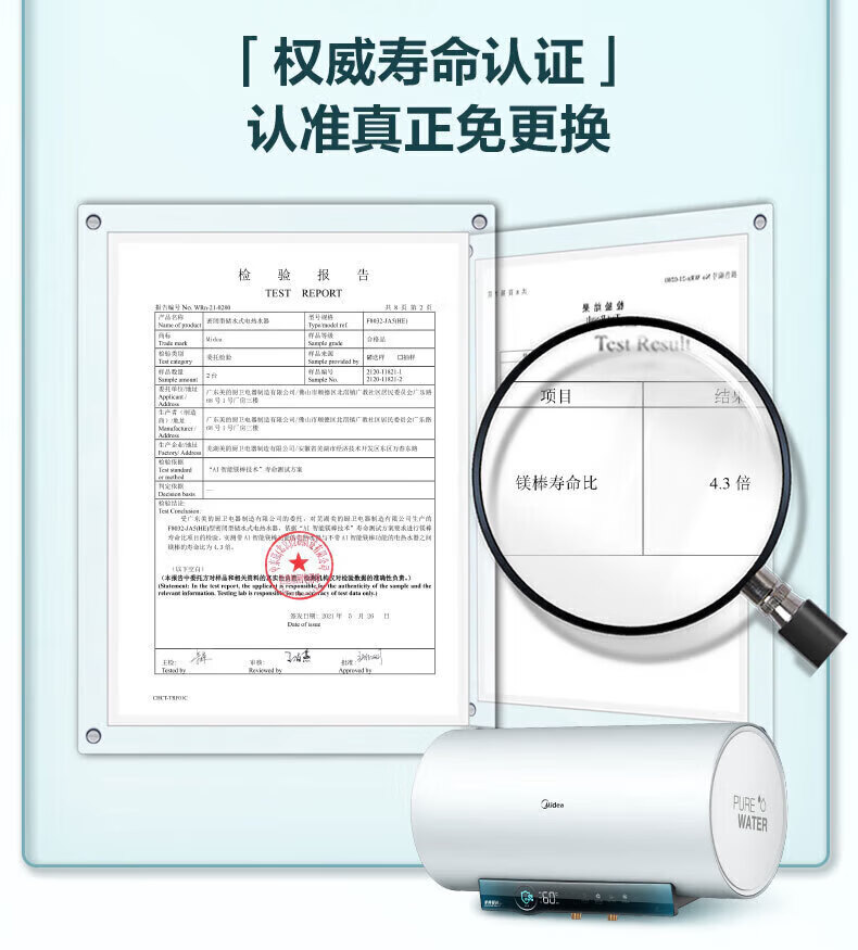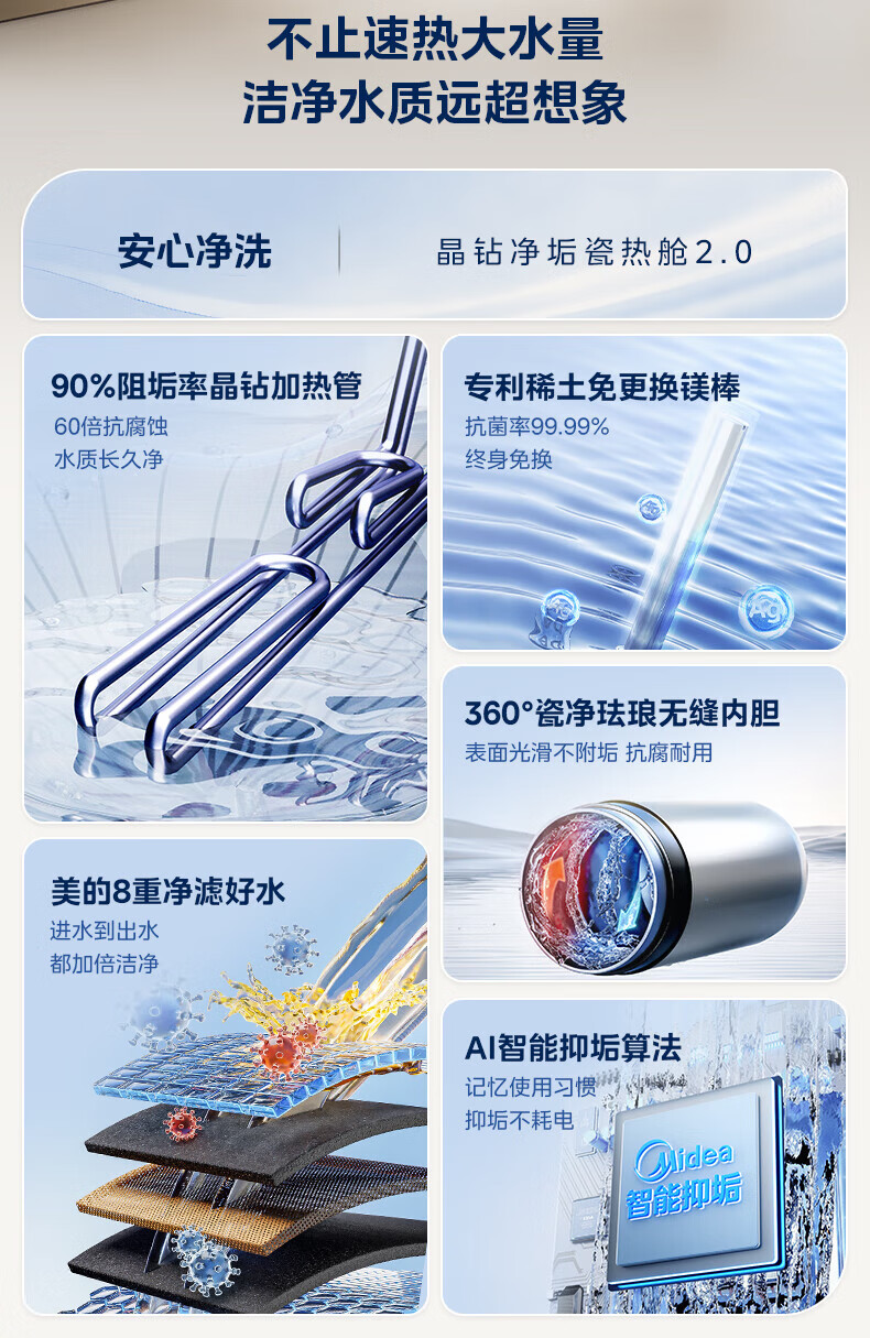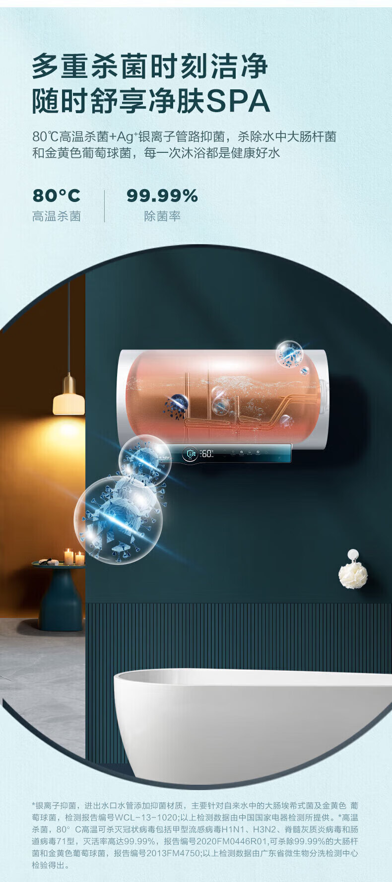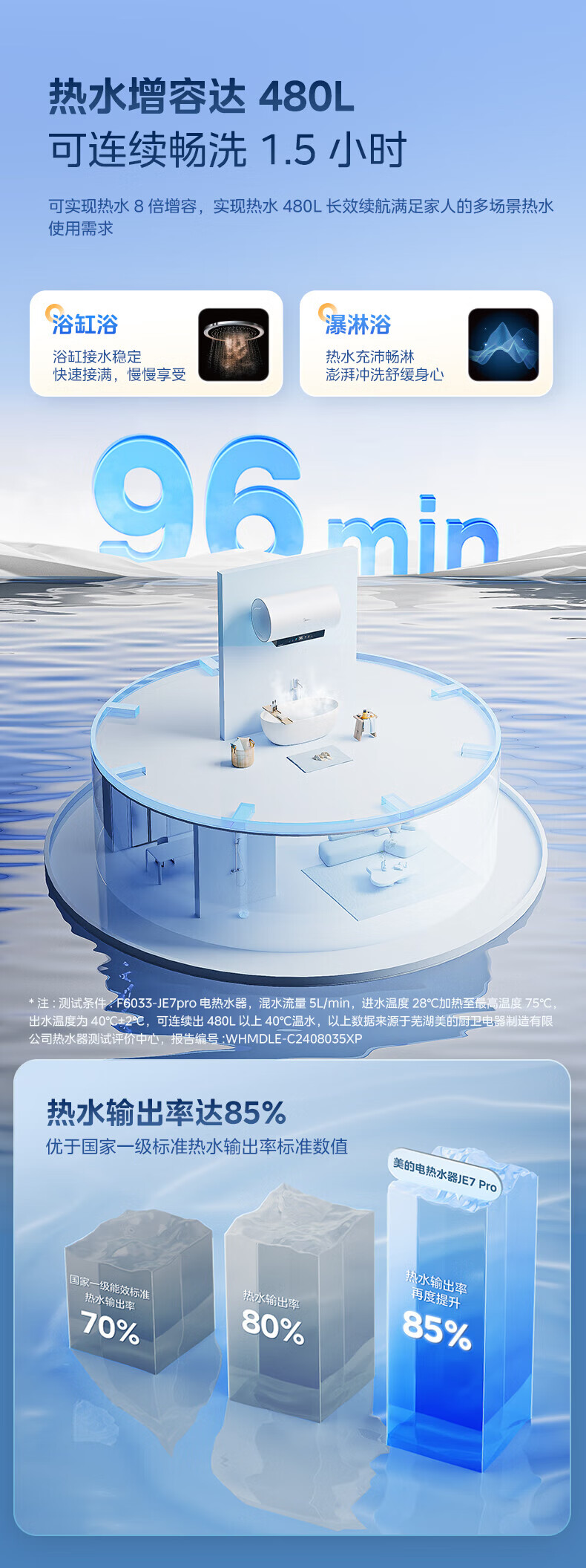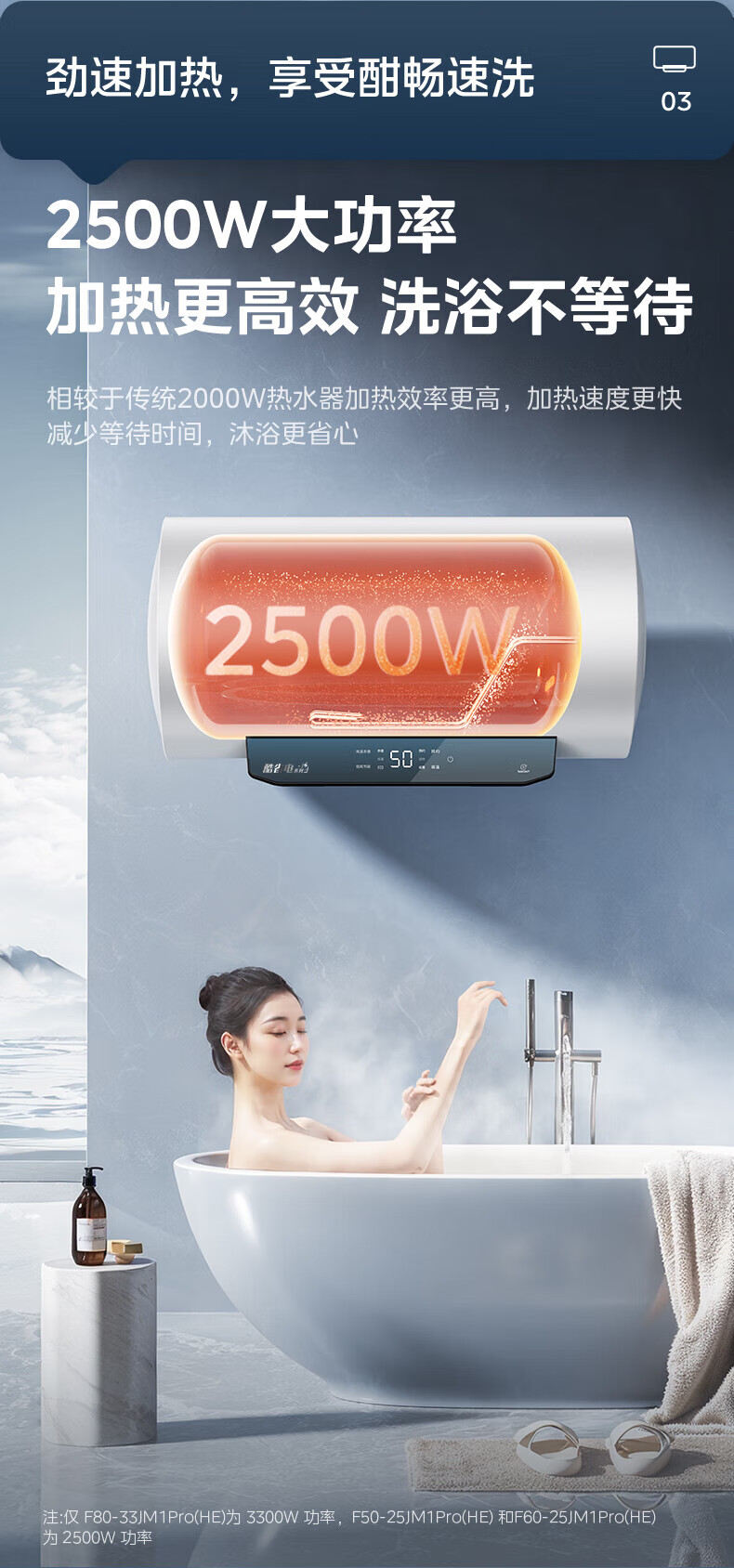 美的(Midea)电热水器60升80升3300W一级能效出水断电速热家用变频节能省电终身镁棒免换免清洗防电墙手机控制 60L 3300W 出水断电 变频双管·JA5